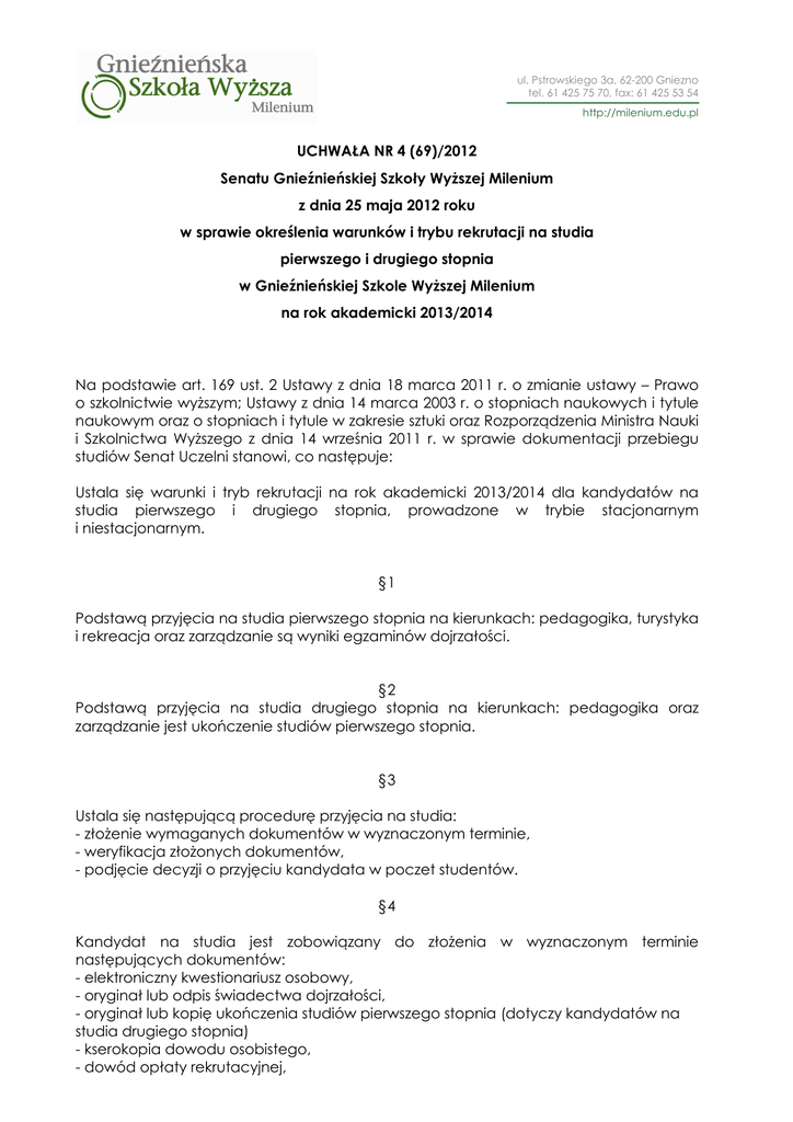 ul. Pstrowskiego 3a, 62-200 Gniezno tel. 61 425 75 70, fax: 61 425 53 54 http://milenium.edu.pl UCHWAŁA NR 4 (69)/2012 Senatu Gnieźnieńskiej Szkoły WyŜszej Milenium z dnia 25 maja 2012 roku w sprawie określenia warunków i trybu rekrutacji na studia pierwszego i drugiego stopnia w Gnieźnieńskiej Szkole WyŜszej Milenium na rok akademicki 2013/2014 Na podstawie art. 169 ust. 2 Ustawy z dnia 18 marca 2011 r. o zmianie ustawy – Prawo o szkolnictwie wyŜszym; Ustawy z dnia 14 marca 2003 r. o stopniach naukowych i tytule naukowym oraz o stopniach i tytule w zakresie sztuki oraz Rozporządzenia Ministra Nauki i Szkolnictwa WyŜszego z dnia 14 września 2011 r. w sprawie dokumentacji przebiegu studiów Senat Uczelni stanowi, co następuje: Ustala się warunki i tryb rekrutacji na rok akademicki 2013/2014 dla kandydatów na studia pierwszego i drugiego stopnia, prowadzone w trybie stacjonarnym i niestacjonarnym. §1 Podstawą przyjęcia na studia pierwszego stopnia na kierunkach: pedagogika, turystyka i rekreacja oraz zarządzanie są wyniki egzaminów dojrzałości. §2 Podstawą przyjęcia na studia drugiego stopnia na kierunkach: pedagogika oraz zarządzanie jest ukończenie studiów pierwszego stopnia. §3 Ustala się następującą procedurę przyjęcia na studia: - złoŜenie wymaganych dokumentów w wyznaczonym terminie, - weryfikacja złoŜonych dokumentów, - podjęcie decyzji o przyjęciu kandydata w poczet studentów. §4 Kandydat na studia jest zobowiązany do złoŜenia w wyznaczonym terminie następujących dokumentów: - elektroniczny kwestionariusz osobowy, - oryginał lub odpis świadectwa dojrzałości, - oryginał lub kopię ukończenia studiów pierwszego stopnia (dotyczy kandydatów na studia drugiego stopnia) - kserokopia dowodu osobistego, - dowód opłaty rekrutacyjnej, ul. Pstrowskiego 3a, 62-200 Gniezno tel. 61 425 75 70, fax: 61 425 53 54 http://milenium.edu.pl - 3 zdjęcia, - zdjęcie w wersji elektronicznej na płycie CD. §5 Podstawą przyjęcia na studia drugiego stopnia na kierunku pedagogika jest dyplom ukończenia studiów pierwszego stopnia na kierunku pedagogika w dowolnej specjalności. O przyjęcie na studia drugiego stopnia na kierunku pedagogika moŜe równieŜ ubiegać się kandydat, który legitymuje się dyplomem ukończenia studiów pierwszego stopnia na kierunku pokrewnym do kierunku pedagogika, w przypadku, gdy posiada przygotowanie pedagogiczne oraz zaliczył w ramach ukończonych studiów pierwszego stopnia co najmniej 60% wszystkich przedmiotów podstawowych i kierunkowych (według punktów ECTS), określonych w standardach kształcenia studiów pierwszego stopnia dla kierunku pedagogika. §6 Podstawą przyjęcia na studia drugiego stopnia na kierunku zarządzanie jest dyplom ukończenia studiów pierwszego stopnia na kierunku zarządzanie w dowolnej specjalności. O przyjęcie na studia drugiego stopnia na kierunku zarządzanie moŜe równieŜ ubiegać się kandydat, który ukończył studia pierwszego stopnia na innym kierunku niŜ zarządzanie. W takim wypadku o przyjęciu na studia drugiego stopnia decydować będzie pozytywne zaliczenie testu kompetencyjnego z zakresu treści kierunkowych, właściwych dla studiów pierwszego stopnia na kierunku zarządzanie. §7 Decyzja o przyjęciu na studia podejmowana jest na podstawie pozytywnie zweryfikowanych dokumentów. W przypadku studiów pierwszego stopnia czynnikiem decydującym jest wynik egzaminów dojrzałości. W przypadku studiów drugiego stopnia czynnikiem decydującym jest dyplom ukończenia studiów pierwszego stopnia, z zastrzeŜeniem postanowień par. 5 i 6. §8 Listę osób kwalifikujących się do przyjęcia na studia pierwszego lub drugiego stopnia zatwierdza dziekan właściwego wydziału. §9 Po zakończeniu procesu rekrutacyjnego dziekan właściwego wydziału wydaje decyzję o przyjęciu lub nie przyjęciu kandydata na studia w dwóch jednobrzmiących egzemplarzach – po jednym dla kaŜdej ze stron. ul. Pstrowskiego 3a, 62-200 Gniezno tel. 61 425 75 70, fax: 61 425 53 54 http://milenium.edu.pl §10 Od decyzji dziekana właściwego wydziału kandydatowi przysługuje prawo odwołania się do rektora. Decyzja rektora jest ostateczna. §11 Dokumenty (z wyjątkiem świadectwa dojrzałości i dyplomu ukończenia studiów pierwszego stopnia) osób nieprzyjętych na studia zostają komisyjnie zniszczone. §12 Uchwała wchodzi w Ŝycie z dniem podjęcia. PRZEWODNICZĄCY SENATU REKTOR Prof. nzw. dr Lechosław Gawrecki