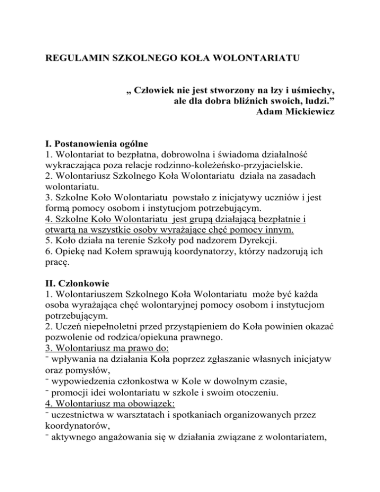 REGULAMIN SZKOLNEGO KOŁA WOLONTARIATU „ Człowiek nie jest stworzony na łzy i uśmiechy, ale dla dobra bliźnich swoich, ludzi.” Adam Mickiewicz I. Postanowienia ogólne 1. Wolontariat to bezpłatna, dobrowolna i świadoma działalność wykraczająca poza relacje rodzinno-koleżeńsko-przyjacielskie. 2. Wolontariusz Szkolnego Koła Wolontariatu działa na zasadach wolontariatu. 3. Szkolne Koło Wolontariatu powstało z inicjatywy uczniów i jest formą pomocy osobom i instytucjom potrzebującym. 4. Szkolne Koło Wolontariatu jest grupą działającą bezpłatnie i otwartą na wszystkie osoby wyrażające chęć pomocy innym. 5. Koło działa na terenie Szkoły pod nadzorem Dyrekcji. 6. Opiekę nad Kołem sprawują koordynatorzy, którzy nadzorują ich pracę. II. Członkowie 1. Wolontariuszem Szkolnego Koła Wolontariatu może być każda osoba wyrażająca chęć wolontaryjnej pomocy osobom i instytucjom potrzebującym. 2. Uczeń niepełnoletni przed przystąpieniem do Koła powinien okazać pozwolenie od rodzica/opiekuna prawnego. 3. Wolontariusz ma prawo do: ⁻ wpływania na działania Koła poprzez zgłaszanie własnych inicjatyw oraz pomysłów, ⁻ wypowiedzenia członkostwa w Kole w dowolnym czasie, ⁻ promocji idei wolontariatu w szkole i swoim otoczeniu. 4. Wolontariusz ma obowiązek: ⁻ uczestnictwa w warsztatach i spotkaniach organizowanych przez koordynatorów, ⁻ aktywnego angażowania się w działania związane z wolontariatem, ⁻ wywiązywania się z podjętych obowiązków najlepiej, jak potrafi. III. Zadania koordynatorów 1. Planowanie rodzaju działalności i harmonogramu pracy uczniów wolontariuszy. 2. Nawiązywanie kontaktu i współpracy z instytucjami potrzebującymi wolontaryjnego wsparcia. 3. Ustalanie terminów spotkań wolontariuszy. 4. Reprezentowanie wolontariuszy 5. Przyjmowanie i odwoływanie członków Koła. 6. Kontakt z Dyrekcją Szkoły. 7. Animacja, monitorowanie działań uczniów, dobieranie zadań. IV. Cele i sposoby działania 1. Celem Koła jest rozwijanie wśród młodzieży szkolnej postawy wrażliwości na potrzeby innych, zaangażowania, życzliwości i bezinteresowności. 2. Celem Koła jest także włączanie uczniów w działalność wolontaryjną na rzecz potrzebujących. 3. Koło wspiera inicjatywy uczniów na rzecz środowiska szkolnego i lokalnego. 4. Koło prowadzi szkolenia i warsztaty dla członków, dba o ich nieustanny rozwój. 5. Koło przynajmniej raz do roku organizuje spotkanie podsumowująco-nagradzające. 6. Do form działania Koła można zaliczyć: ⁻ zbiórki darów rzeczowych; ⁻ zbiórki pieniędzy do puszek; ⁻ udział w akcjach charytatywnych; ⁻ udział w wydarzeniach kulturalnych – koncerty, spektakle, przedstawienia; ⁻ pomoc przy chorym, wspólne spędzanie czasu; ⁻ organizacja wydarzeń kulturalnych – przedstawień, koncertów; ⁻ promocję wolontariatu w lokalnym środowisku. V. Nagradzanie wolontariuszy 1. Pochwała koordynatora z wpisem do dziennika. 2. Pochwała Dyrektora Szkoły. 3. Powierzenie coraz bardziej odpowiedzialnych zadań. 4. List gratulacyjny do Rodziców VI. Postanowienia końcowe 1. Regulamin obowiązuje wszystkich członków Szkolnego Koła Wolontariatu. 2. Zmiana regulaminu powinna być zatwierdzona przez członków Koła. 3. Rozwiązania Koła może dokonać tylko Dyrekcja Szkoły. 4. Wolontariusze obchodzą 5 grudnia Międzynarodowy Dzień Wolontariusza. 5. Samorząd Szkolny aktywnie wspiera działania Koła. Koordynatorzy: mgr Małgorzata Marosz-Kochan, mgr Anna Derej – Towarzystwo Przyjaciół Dzieci mgr Barbara Jastrzębska, mgr Anna Nowak-Palka – Schronisko dla zwierząt w Milowicach mgr Joanna Szymik – Kurach, mgr Agnieszka Struzik – Hospicjum im. Św. Tomasza mgr Agnieszka Struzik – Polski Czerwony Krzyż, Caritas mgr Monika Szczepanik, mgr Marta Połetek – koordynatorzy z ramienia samorządu szkolnego