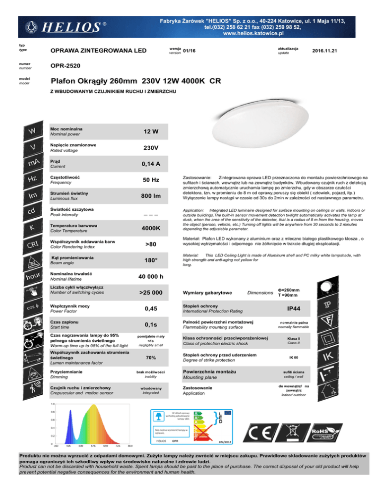typ type OPRAWA ZINTEGROWANA LED wersja version aktualizacja update 01/16 numer number OPR-2520 model model Plafon Okrągły 260mm 230V 12W 4000K CR 2016.11.21 Z WBUDOWANYM CZUJNIKIEM RUCHU I ZMIERZCHU Moc nominalna Nominal power 12 W Napięcie znamionowe Rated voltage 230V Prąd Current 0,14 A Częstotliwość Frequency 50 Hz Strumień świetlny Luminous flux Światłość szczytowa Peak intensity 800 lm Zastosowanie: Zintegrowana oprawa LED przeznaczona do montażu powierzchniowego na sufitach i ścianach, wewnątrz lub na zewnątrz budynków. Wbudowany czujnik ruch z detekcją zmierzchową automatycznie uruchamia lampę po zmierzchu, gdy w obszarze czułości detektora, tzn. w promieniu do 8 m od oprawy,poruszy się obiekt ( człowiek, pojazd, itp.) Wyłączenie lampy nastąpi w czasie od 30s do 2min w zależności od nastawnego parametru. 4000K Application: Integrated LED luminaire designed for surface mounting on ceilings or walls, indoors or outside buildings.The built-in sensor movement detection twilight automatically activates the lamp at dusk, when the area of the sensitivity of the detector, that is a radius of 8 m from the housing, moves the object (person, vehicle, etc.) Turning off lights will be anywhere from 30 seconds to 2 minutes depending the adjustable parameter. Współczynnik oddawania barw Color Rendering Index >80 Materiał: Plafon LED wykonany z aluminium oraz z mleczno białego plastikowego klosza , o wysokiej wytrzymałości i odpornego nie żółknięcie w trakcie długiej eksploatacji. Kąt promieniowania Beam angle 180° Nominalna trwałość Nominal lifetime 40 000 h Liczba cykli włącz/wyłącz Number of switching cycles >25 000 Temperatura barwowa Color Temperature ___ Material: This LED Ceiling Light is made of Aluminum shell and PC milky white lampshade, with high strength and anti-aging not yellow for long. Wymiary gabarytowe Dimensions Wspłczynnik mocy Power Factor 0,45 Stopień ochrony International Protection Rating Czas zapłonu Start time 0,1s Palność powierzchni montażowej Flammability mounting surface Czas nagrzewania lampy do 95% pełnego strumienia świetlnego Warm-up time up to 95% of the full light output Współczynnik zachowania strumienia świetlnego Lumen maintenance factor Przyciemnianie Dimming Czujnik ruchu i zmierzchowy Crepuscular and motion sensor pomijalnie mały <1s negligibly small 70% brak możliwości inability wbudowany integrated Klasa ochronności przeciwporażeniowej Class of protection electric shock Stopień ochrony przed uderzeniem Degree of strike protection Powierzchnia montażu Mounting plane Zastosowanie Application F=260mm T =90mm IP44 normalnie palna normally flammable Klasa II Class II IK 00 sufit/ ściana ceiling / wall do wewnątrz/ na zewnątrz indoor/ outdoor Produktu nie można wyrzucić z odpadami domowymi. Zużyte lampy należy zwrócić w miejscu zakupu. Prawidłowe składowanie zużytych produktów pomaga ograniczyć ich szkodliwy wpływ na środowisko naturalne i zdrowie ludzi. Product can not be discarded with household waste. Spent lamps should be paid to the place of purchase. The correct disposal of your old product will help prevent potential negative consequences for the environment and human health.