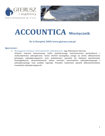ACCOUNTICA Miesięcznik Nr 6/Sierpień 2009/www.gierusz.com.pl Spis treści : 1. Wymagania stawiane rachunkowości zabezpieczeń– mgr Katarzyna Gierusz Artykuł stanowi kontynuację cyklu poświęconego instrumentom pochodnych i rachunkowości zabezpieczeń. Autor zwrócił szczególną uwagę na istotę efektywności powiązań zabezpieczających oraz podstawowe sposoby jej badania (porównanie bezwzględnych, skumulowanych zmian wartości instrumentu zabezpieczającego i zabezpieczanego oraz analizę regresji). Ponadto omówiono sposób dokumentowania transakcji zabezpieczających. 1 Wymagania stawiane rachunkowości zabezpieczeń. Jednym z podstawowych wymagań wynikające z nich przepływy pienięŜne zawartych w § 9 MSR Nr 39 Instrumenty skompensują zmiany wartości godziwej lub finansowe- ujmowanie i wycena dotyczy przepływów postulatu skuteczności tzn. efektywności pozycji”. Z kolei pozycja zabezpieczana transakcji zabezpieczających. Dla potrzeb definiowana jest przez § 9 MSR Nr 39 jako rachunkowości zabezpieczeń efektywność „składnik definiowana jest jako „stopień, w jakim uprawdopodobnione zmiany wartości godziwej lub przepływów zobowiązania, pienięŜnych związanych z zabezpieczaną planowana pozycją, inwestycja netto w udziały zagraniczne, moŜliwe do zabezpieczonemu ryzyku, kompensowane godziwej lub przypisania związanymi z zabezpieczającym”. warunku, celu naleŜy instrument uściślić pochodny zmiany kursów walut) lub inny składnik finansowych pochodnym finansowe transakcja lub wyznaczona jako pozycja zabezpieczana.” właściwej (wyłącznie w celu zabezpieczenia ryzyka zobowiązanie przyszła prawdopodobna przepływów pienięŜnych oraz b) została wymienionych kategorii naleŜy rozumieć instrumentem wysoce pienięŜnych pozycji zabezpieczającej. Przez pierwszą z aktywów przyszłe wartości godziwej lub zmian przyszłych pojęcie instrumentu zabezpieczającego i „wyznaczony zobowiązanie, wartości interpretacji i poprawnego zrozumienia powyŜszego aktywów, która: a) naraŜa jednostkę na ryzyko zmian instrumentem W zabezpieczanej są zmianami przepływów pienięŜnych niebędący albo niebędące instrumentem pochodnym, co do którego oczekuje się, Ŝe ich wartość godziwa lub Wykazanie efektywności transakcji zabezpieczającej kluczowym jest obok elementem wyceny rachunkowości zabezpieczeń. MSR Nr 39 wymaga od jednostki zarówno prospektywnego jak i retrospektywnego pomiaru skuteczności zabezpieczenia1. nacisk na to, Pierwszy by test w kładzie momencie ustanawiania zabezpieczenia spółka była w stanie uzasadnić swoje oczekiwania co do jego wysokiej efektywności przez cały okres trwania. Z kolei druga ocena odnosi 1 E&Y, 2007 (a), str. 2 2 się do wykazania skuteczności powiązania pomiędzy datami efektywności (np. okresowego pomiaru pomiędzy dniami Warto w tym miejscu zwrócić uwagę na wyraŜenie „…i przez wykorzystania cały okres [instrumentu bilansowymi, jeŜeli firma dokonuje oceny zabezpieczającego]”. raz do roku). Od tego czy skuteczność jednostka instrumentu zostanie potwierdzona, czy zabezpieczeń nie, określonego instrumentu, ale w okresie jej zaleŜeć transakcji w będzie sposób księgach. ujęcia Zgodnie załącznikiem A do MSR Nr 39 z OS 105, W przypadku stosuje w gdy rachunkowość odniesieniu wykorzystywania do zabezpieczenie przestanie być efektywne, jednostka musi zabezpieczenie uznaje się za efektywne, zaprzestać jeŜeli w momencie jego ustanowienia (na zabezpieczeń. Jednak utrata skuteczności początku transakcji) i przez cały okres nie wpływa na wcześniejsze księgowania. wykorzystania, faktyczny stopień w jaki udało się skompensować dzięki instrumentowi zabezpieczającemu zmianę wartości godziwej lub zmianę przepływów środków pienięŜnych pozycji zabezpieczanej, znajduje się w przedziale od 80% do 125%. KaŜdy wynik powyŜej 125% i poniŜej 80% naleŜy zinterpretować jako nieskuteczność Do uŜywania rachunkowości podstawowych metod oceny efektywności powiązań zabezpieczających zaliczamy metodę opartą na porównaniu bezwzględnych, skumulowanych zmian wartości zabezpieczającego instrumentu i zabezpieczanego (dollar offset metod) oraz analizę regresji. instrumentu zabezpieczającego, a co za tym idzie nie moŜna w takim przypadku zastosować zasad rachunkowości zabezpieczeń. Polskie stanowisko w tej kwestii ( § 28 ust 4 Rozporządzenia) w pełni pokrywa się z powyŜszym stwierdzeniem. 3 Przykład 1. Ocena efektywności instrumentu zabezpieczającego przy wykorzystaniu metody dolar offset. W dniu 1 stycznia 200X roku przedsiębiorstwo ABC zawarło kontrakt forward na zakup 10 000€ po 3,015zł/€. w celu zabezpieczenia oczekiwanej transakcji polegającej na zakupie towarów za euro, która ma zostać zawarta 30 czerwca 200X roku. Kurs euro w dniu 1 stycznia 200X wynosił 3zł/€. W celu oceny efektywności zastosowanego instrumentu przedsiębiorstwo jest zobowiązane co miesiąc ustalać wartość zmiany kursu waluty i wynik na zastosowanym instrumencie. Tabela 1 przedstawia zmiany kursu euro w analizowanym okresie. Dla uproszczenia kursy: spot (natychmiastowy) euro i kontraktu forward z realizacją na 30 czerwca 200X są sobie równe i wynoszą 2,9985zł/€. Tabela 1. Przykładowy kurs euro w okresie od stycznia do maja 200X. 31.01.100X 28.02.200X 31.03.200X 30.04.200X 31.05.200X koszt przyszłej transakcji w euro 10 000 € 10 000 € kurs € 2,9917 zł 3,0069 zł Źródło: opracowanie własne. 10 000 € 3,0195 zł 10 000 € 3,0061 zł 10 000 € 2,9947 zł Kurs euro w okresie od stycznia do maja nie był stabilny i wahał się od 2,9917zł. do 3,0195zł. za euro. Fluktuacja ta wywarła wpływ na bieŜącą wartość kontraktu forward i koszty przyszłej transakcji. Zmiany wartości instrumentu pochodnego i oczekiwanej płatności zostały zamieszczone w tabeli 2. 4 Tabela 2. Przykładowe zmiany wartości przyszłych przepływów 