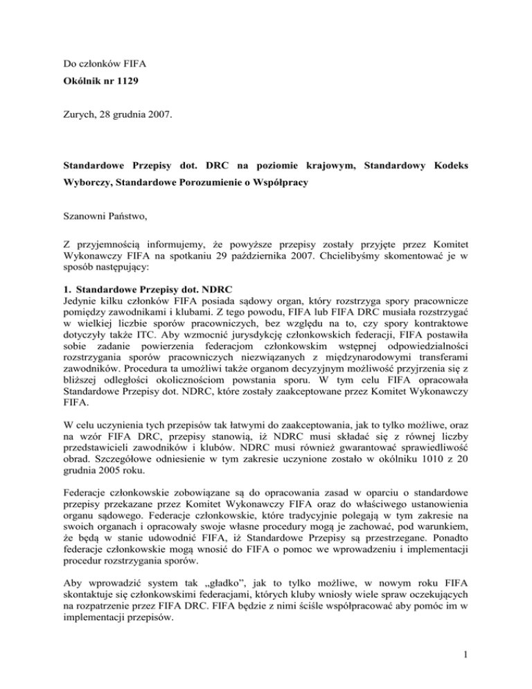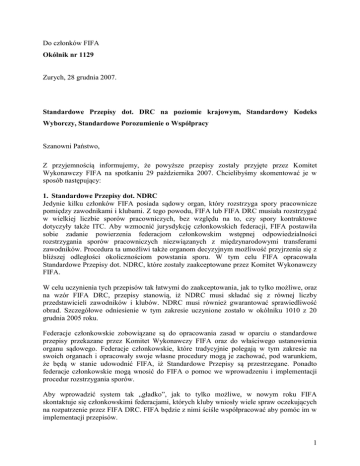 Do członków FIFA Okólnik nr 1129 Zurych, 28 grudnia 2007. Standardowe Przepisy dot. DRC na poziomie krajowym, Standardowy Kodeks Wyborczy, Standardowe Porozumienie o Współpracy Szanowni Państwo, Z przyjemnością informujemy, że powyższe przepisy zostały przyjęte przez Komitet Wykonawczy FIFA na spotkaniu 29 października 2007. Chcielibyśmy skomentować je w sposób następujący: 1. Standardowe Przepisy dot. NDRC Jedynie kilku członków FIFA posiada sądowy organ, który rozstrzyga spory pracownicze pomiędzy zawodnikami i klubami. Z tego powodu, FIFA lub FIFA DRC musiała rozstrzygać w wielkiej liczbie sporów pracowniczych, bez względu na to, czy spory kontraktowe dotyczyły także ITC. Aby wzmocnić jurysdykcję członkowskich federacji, FIFA postawiła sobie zadanie powierzenia federacjom członkowskim wstępnej odpowiedzialności rozstrzygania sporów pracowniczych niezwiązanych z międzynarodowymi transferami zawodników. Procedura ta umożliwi także organom decyzyjnym możliwość przyjrzenia się z bliższej odległości okolicznościom powstania sporu. W tym celu FIFA opracowała Standardowe Przepisy dot. NDRC, które zostały zaakceptowane przez Komitet Wykonawczy FIFA. W celu uczynienia tych przepisów tak łatwymi do zaakceptowania, jak to tylko możliwe, oraz na wzór FIFA DRC, przepisy stanowią, iż NDRC musi składać się z równej liczby przedstawicieli zawodników i klubów. NDRC musi również gwarantować sprawiedliwość obrad. Szczegółowe odniesienie w tym zakresie uczynione zostało w okólniku 1010 z 20 grudnia 2005 roku. Federacje członkowskie zobowiązane są do opracowania zasad w oparciu o standardowe przepisy przekazane przez Komitet Wykonawczy FIFA oraz do właściwego ustanowienia organu sądowego. Federacje członkowskie, które tradycyjnie polegają w tym zakresie na swoich organach i opracowały swoje własne procedury mogą je zachować, pod warunkiem, że będą w stanie udowodnić FIFA, iż Standardowe Przepisy są przestrzegane. Ponadto federacje członkowskie mogą wnosić do FIFA o pomoc we wprowadzeniu i implementacji procedur rozstrzygania sporów. Aby wprowadzić system tak „gładko”, jak to tylko możliwe, w nowym roku FIFA skontaktuje się członkowskimi federacjami, których kluby wniosły wiele spraw oczekujących na rozpatrzenie przez FIFA DRC. FIFA będzie z nimi ściśle współpracować aby pomóc im w implementacji przepisów. 1 2. Standardowy Kodeks Wyborczy. Wybory w FIFA i federacjach członkowskich muszą opierać się o takie demokratyczne zasady, jak podział władzy oraz przejrzystość. FIFA zwróciła uwagę, że pewne federacje członkowskie nie przykładały w przeszłości odpowiedniej wagi do tych zasad. FIFA zwróciła kilkukrotnie uwagę na rządową ingerencję w wybory na poziomie federacji. W celu ujednolicenia procedur wyborczych w organizacjach członkowskich FIFA oraz zapewnienia ich zbieżności z podstawowymi zasadami demokracji podczas wyborów w członkowskich federacjach, Komitet Wykonawczy FIFA przekazał Standardowy Kodeks Wyborczy. Federacje członkowskie zobowiązane są do natychmiastowej implementacji Standardowego Kodeksu Wyborczego. Federacje, które tradycyjnie powierzały innej osobie lub ciału w ramach federacji nadzorowanie wyborów, mogą kontynuować te praktyki pod warunkiem, że będą w stanie udowodnić FIFA, że podstawowe zasady Standardowego Kodeksu Wyborczego są przestrzegane. 3. Standardowe Porozumienie o Współpracy W przeszłości współpraca pomiędzy federacjami członkowskimi a władzami rządowymi stale prowadziła do różnicy zdań. Różnice te powstawały ze względu na brak jasnego zdefiniowania zakresu obowiązków obu stron. W celu zapewnienia podstaw przyszłej współpracy pomiędzy federacjami członkowskimi a organami rządowymi, FIFA opracowała Standardowe Porozumienie o Współpracy, które przyjęte zostały przez Komitet Wykonawczy FIFA. Zachęca się członków do wykorzystywanie tego dokumentu w przyszłości w celu poprawy jakości współpracy z organami rządowymi. Standardowe Porozumienie o Współpracy zostanie przesłane na początku przyszłego roku. Prosimy o zapoznanie się z ich treścią oraz implementowanie ich we właściwym czasie. Z przyjemnością udzielimy wszelkich niezbędnych informacji. FIFA Jerome Valcke Sekretarz Generalny Do wiadomości: Komitet Wykonawczy FIFA Komisja Prawna Komitet ds. Statusu Zawodników DRC Konfederacje FIFPro Załączniki: Standardowe Przepisy dot. NDRC Standardowy Kodeks Wyborczy 2