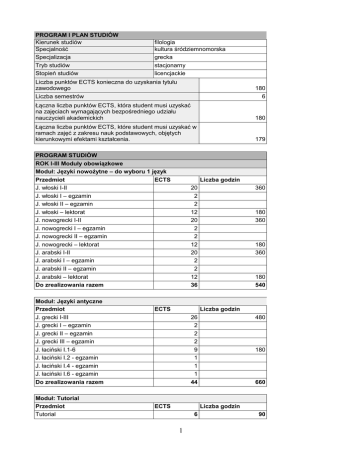 PROGRAM I PLAN STUDIÓW Kierunek studiów Specjalność Specjalizacja Tryb studiów Stopień studiów filologia kultura śródziemnomorska grecka stacjonarny licencjackie Liczba punktów ECTS konieczna do uzyskania tytułu zawodowego Liczba semestrów 180 6 Łączna liczba punktów ECTS, która student musi uzyskać na zajęciach wymagających bezpośredniego udziału nauczycieli akademickich 180 Łączna liczba punktów ECTS, które student musi uzyskać w ramach zajęć z zakresu nauk podstawowych, objętych kierunkowymi efektami kształcenia. 179 PROGRAM STUDIÓW ROK I-III Moduły obowiązkowe Moduł: Języki nowożytne – do wyboru 1 język Przedmiot ECTS J. włoski I-II J. włoski I – egzamin J. włoski II – egzamin J. włoski – lektorat J. nowogrecki I-II J. nowogrecki I – egzamin J. nowogrecki II – egzamin J. nowogrecki – lektorat J. arabski I-II J. arabski I – egzamin J. arabski II – egzamin J. arabski – lektorat Do zrealizowania razem Moduł: Języki antyczne Przedmiot J. grecki I-III J. grecki I – egzamin J. grecki II – egzamin J. grecki III – egzamin J. łaciński I.1-6 J. łaciński I.2 - egzamin J. łaciński I.4 - egzamin J. łaciński I.6 - egzamin Do zrealizowania razem Moduł: Tutorial Przedmiot Tutorial Liczba godzin 20 2 2 12 20 2 2 12 20 2 2 12 36 ECTS 360 180 360 180 360 180 540 Liczba godzin 26 2 2 2 9 1 1 1 44 ECTS 480 180 660 Liczba godzin 6 1 90 ROK I Moduł: Zajęcia obowiązkowe Przedmiot Literatura grecka Języki i pisma Śródziemnomorza Historia starożytna Historia sztuki antycznej I Biblia w europejskiej tradycji i symbolice Retoryka Mitologia grecka Filozofia starożytna Geografia Śródziemnomorza Kompozycja wypowiedzi pisemnej Wychowanie fizyczne Do zrealizowania razem ROK II Przedmiot Historia sztuki antycznej II Do zrealizowania razem ROK III Przedmiot Podstawy przedsiębiorczości Do zrealizowania razem ROK II-III Moduły obowiązkowe Moduł: Literatura Przedmiot ECTS Liczba godzin 6 2 4 4 2 2 3 4 2 1 1 31 ECTS Liczba godzin 4 4 ECTS Liczba godzin ECTS Liczba godzin 16 ECTS 180 Liczba godzin Do zrealizowania razem Moduł: Historia Przedmiot 60 60 2 2 Do zrealizowania razem Moduł: Językoznawstwo Przedmiot 60 30 60 60 30 30 30 30 30 15 30 405 6 ECTS 60 Liczba godzin Do zrealizowania razem 8 2 90 Moduł: Kultura i religie Przedmiot ECTS Liczba godzin Do zrealizowania razem Moduł: Opcje Przedmiot 9 ECTS 90 Liczba godzin Do zrealizowania razem Razem moduły obowiązkowe* 6 60 45 480 *Liczba godzin zajęć w modułach nie może w trakcie studiów przekroczyć 480 ROK II-III Moduł: Języki dodatkowe* Przedmiot J. hiszpański J. turecki J. akadyjski J. egipski Do zrealizowania razem ECTS Liczba godzin 20 20 20 20 20 240 240 240 240 240 *Przy wyborze języka dodatkowego student realizuje po 4 ECTS mniej z każdego z modułów obowiązkowych LJHKO ROK III Moduł: Proseminarium Przedmiot Proseminarium licencjackie I (wybór) Proseminarium licencjackie II ECTS Liczba godzin Wszystkie zajęcia 3 5 7 12 30 30 60 180 2295 PLAN STUDIÓW Semestr 1 Przedmiot J. nowożytny I J. grecki I J. łaciński I.1 Historia starożytna Literatura grecka Geografia Śródziemnomorza Filozofia starożytna Historia sztuki antycznej I Mitologia grecka Biblia w europejskiej tradycji i symbolice Tutorial Semestr 2 Przedmiot J. nowożytny I J. nowożytny I – egzamin J. grecki I J. grecki I – egzamin J. łaciński I.2 J. łaciński I.2 Historia starożytna Literatura grecka Języki i pisma Śródziemnomorza Historia sztuki antycznej I Retoryka Kompozycja wypowiedzi pisemnej Tutorial Semestr 3 Przedmiot J.nowożytny II J. grecki II J. łaciński I.3 Historia sztuki antycznej II Moduły obowiązkowe LJHKO Tutorial ECTS Liczba godzin 6 6 2 2 3 2 4 2 3 2 1 33 ECTS 90 90 30 30 30 30 30 30 30 30 15 435 Liczba godzin 4 2 4 2 1 1 2 3 2 2 2 1 1 27 ECTS Liczba godzin 6 6 2 2 13 * 1 30 4 90 90 30 30 30 30 30 30 15 15 390 90 90 30 30 15 255 Forma zaliczenia Zal Zal Zal Zal Zal Zal Zal Zal Zal Zal Zal Forma zaliczenia zal egz zal egz zal egz Zal Zal Zal Zal Zal Zal Zal Forma zaliczenia Zal Zal Zal zal Zal Semestr 4 Przedmiot J.nowożytny II J.nowożytny II – egzamin J. grecki II J. grecki II – egzamin J. łaciński I.4 J. łaciński I.4 – egzamin Historia sztuki antycznej II Moduły obowiązkowe LJHKO Tutorial Wychowanie fizyczne Semestr 5 Przedmiot J.nowożytny – lektorat J. grecki III J. łaciński I.5 Proseminarium licencjackie I Moduły obowiązkowe LJHKO Tutorial Podstawy przedsiębiorczości Semestr 6 Przedmiot J.nowożytny – lektorat J. grecki III J. grecki III – egzamin J. łaciński I.6 J. łaciński I.6 Proseminarium licencjackie II Moduły obowiązkowe LJHKO Tutorial ECTS Liczba godzin 4 2 4 2 1 1 2 12 * 1 1 30 ECTS 90 90 30 30 15 30 285 Liczba godzin 6 4 2 5 12 * 1 2 32 ECTS 90 60 30 30 15 Forma zaliczenia zal egz zal egz zal egz zal Zal Zal Forma zaliczenia Zal Zal Zal Zal Zal 225 Liczba godzin 6 2 2 1 1 7 8 * 1 28 90 60 30 30 15 225 Forma zaliczenia zal egz zal zal egz egz Zal *Liczba godzin zajęć w modułach nie może w trakcie studiów przekroczyć 480 *Zal – zaliczenie na ocenę **Egz – ocena z egzaminu 5