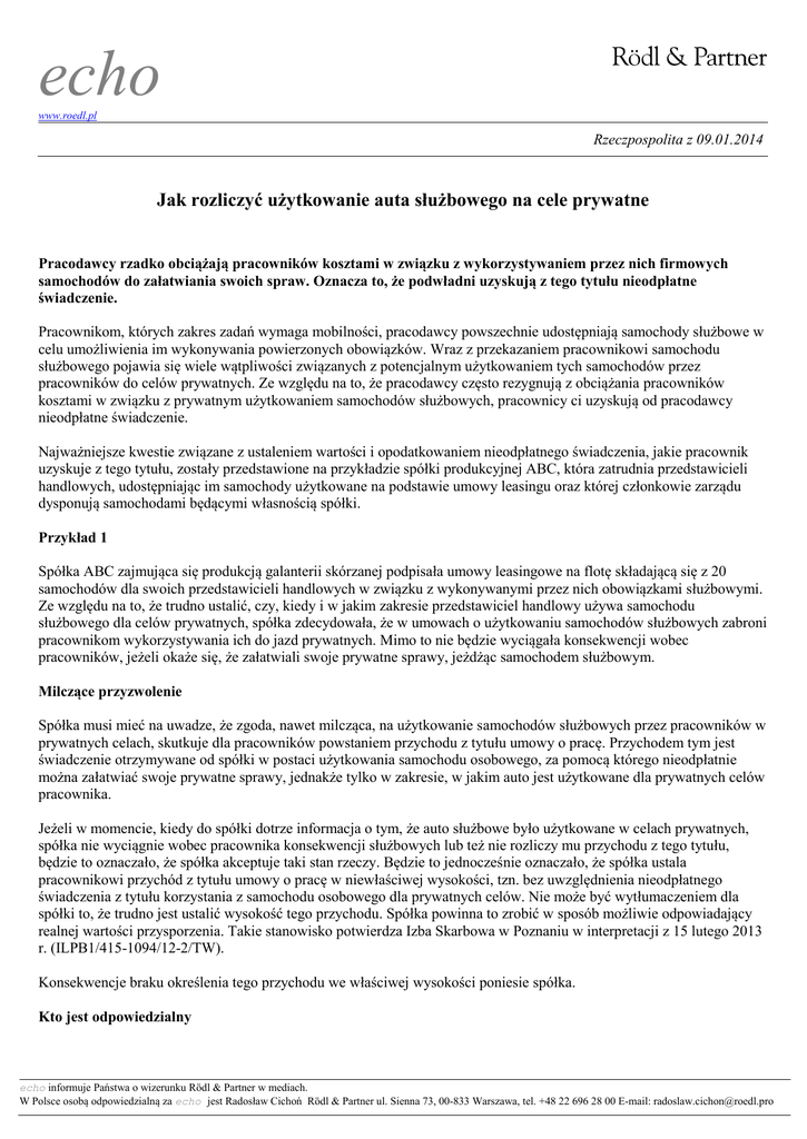 echo www.roedl.pl Rzeczpospolita z 09.01.2014 Jak rozliczyć użytkowanie auta służbowego na cele prywatne Pracodawcy rzadko obciążają pracowników kosztami w związku z wykorzystywaniem przez nich firmowych samochodów do załatwiania swoich spraw. Oznacza to, że podwładni uzyskują z tego tytułu nieodpłatne świadczenie. Pracownikom, których zakres zadań wymaga mobilności, pracodawcy powszechnie udostępniają samochody służbowe w celu umożliwienia im wykonywania powierzonych obowiązków. Wraz z przekazaniem pracownikowi samochodu służbowego pojawia się wiele wątpliwości związanych z potencjalnym użytkowaniem tych samochodów przez pracowników do celów prywatnych. Ze względu na to, że pracodawcy często rezygnują z obciążania pracowników kosztami w związku z prywatnym użytkowaniem samochodów służbowych, pracownicy ci uzyskują od pracodawcy nieodpłatne świadczenie. Najważniejsze kwestie związane z ustaleniem wartości i opodatkowaniem nieodpłatnego świadczenia, jakie pracownik uzyskuje z tego tytułu, zostały przedstawione na przykładzie spółki produkcyjnej ABC, która zatrudnia przedstawicieli handlowych, udostępniając im samochody użytkowane na podstawie umowy leasingu oraz której członkowie zarządu dysponują samochodami będącymi własnością spółki. Przykład 1 Spółka ABC zajmująca się produkcją galanterii skórzanej podpisała umowy leasingowe na flotę składającą się z 20 samochodów dla swoich przedstawicieli handlowych w związku z wykonywanymi przez nich obowiązkami służbowymi. Ze względu na to, że trudno ustalić, czy, kiedy i w jakim zakresie przedstawiciel handlowy używa samochodu służbowego dla celów prywatnych, spółka zdecydowała, że w umowach o użytkowaniu samochodów służbowych zabroni pracownikom wykorzystywania ich do jazd prywatnych. Mimo to nie będzie wyciągała konsekwencji wobec pracowników, jeżeli okaże się, że załatwiali swoje prywatne sprawy, jeżdżąc samochodem służbowym. Milczące przyzwolenie Spółka musi mieć na uwadze, że zgoda, nawet milcząca, na użytkowanie samochodów służbowych przez pracowników w prywatnych celach, skutkuje dla pracowników powstaniem przychodu z tytułu umowy o pracę. Przychodem tym jest świadczenie otrzymywane od spółki w postaci użytkowania samochodu osobowego, za pomocą którego nieodpłatnie można załatwiać swoje prywatne sprawy, jednakże tylko w zakresie, w jakim auto jest użytkowane dla prywatnych celów pracownika. Jeżeli w momencie, kiedy do spółki dotrze informacja o tym, że auto służbowe było użytkowane w celach prywatnych, spółka nie wyciągnie wobec pracownika konsekwencji służbowych lub też nie rozliczy mu przychodu z tego tytułu, będzie to oznaczało, że spółka akceptuje taki stan rzeczy. Będzie to jednocześnie oznaczało, że spółka ustala pracownikowi przychód z tytułu umowy o pracę w niewłaściwej wysokości, tzn. bez uwzględnienia nieodpłatnego świadczenia z tytułu korzystania z samochodu osobowego dla prywatnych celów. Nie może być wytłumaczeniem dla spółki to, że trudno jest ustalić wysokość tego przychodu. Spółka powinna to zrobić w sposób możliwie odpowiadający realnej wartości przysporzenia. Takie stanowisko potwierdza Izba Skarbowa w Poznaniu w interpretacji z 15 lutego 2013 r. (ILPB1/415-1094/12-2/TW). Konsekwencje braku określenia tego przychodu we właściwej wysokości poniesie spółka. Kto jest odpowiedzialny echo informuje Państwa o wizerunku Rödl & Partner w mediach. W Polsce osobą odpowiedzialną za echo jest Radosław Cichoń Rödl & Partner ul. Sienna 73, 00-833 Warszawa, tel. +48 22 696 28 00 E-mail: [email protected] Do jej obowiązków należy bowiem ustalenie właściwej wysokości wynagrodzenia ze wszystkimi świadczeniami pozapłacowymi oraz rozliczenie i zapłata od tej sumy składek na ZUS i podatku dochodowego. Spółka jako płatnik odpowiada za te rozliczenia, zatem w jej interesie jest właściwe ustalenie przychodu uzyskiwanego przez pracownika. W przypadku członków zarządu wykorzystywanie samochodu służbowego dla celów prywatnych będzie skutkowało powstaniem przychodu podlegającym opodatkowaniu w zależności od tytułu, na podstawie którego dany członek zarządu wykonuje swoje czynności na rzecz spółki. Jeżeli z tego tytułu spółka ma obowiązek rozliczania i zapłaty zaliczek na podatek dochodowy oraz składek ZUS, to konsekwencje braku rozliczenia tych należności obciążą spółkę. Jaki przychód przy leasingu Formalna zgoda na użytkowanie samochodów służbowych przez pracowników także dla celów prywatnych oznacza w pierwszej kolejności konieczność ustalenia sposobu określania wartości tego nieodpłatnego świadczenia. W ustawie o PIT nie ma przepisów odnoszących się do podobnych sytuacji. W związku z tym należy stosować reguły ogólne, wskazane w art. 11 ustawy o PIT. W przypadku samochodów użytkowanych przez podatnika na podstawie umowy leasingu zastosowanie znajdzie art. 11 ust. 2a pkt 2 ustawy o PIT. Stanowi on, że wycena nieodpłatnego świadczenia, gdy przedmiotem świadczeń są usługi zakupione, powinna być dokonana na podstawie ceny zakupu tych usług. Oznacza to, że przychód pracownika powinien być ustalony przy uwzględnieniu rzeczywistej ceny płaconej przez pracodawcę w związku z umową leasingu, podwyższonej o dodatkowe koszty związane z utrzymaniem samochodu (ubezpieczenie, koszty przeglądów i napraw, itd.). Stanowisko to znajduje potwierdzenie w interpretacjach organów podatkowych, w tym w interpretacji wydanej przez Izbę Skarbową w Poznaniu 19 kwietnia 2013 r. (ILPB1/415-78/13-2/TW) oraz interpretacji z 22 marca 2013 r. (ILPB2/4151162/ 12-2/AJ), czy w interpretacji ministra finansów z 13 grudnia 2012 r. (DD3/033/32/OBQ/12/PK-403). Przykład 2 Mając już świadomość, że w przypadku braku określania pracownikom odrębnego przychodu w związku z 