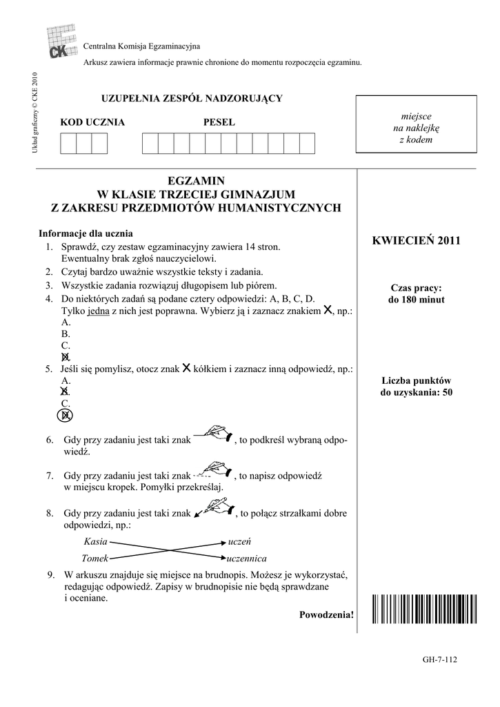 Centralna Komisja Egzaminacyjna Układ graficzny © CKE 2010 Arkusz zawiera informacje prawnie chronione do momentu rozpoczęcia egzaminu. UZUPEŁNIA ZESPÓŁ NADZORUJĄCY KOD UCZNIA miejsce na naklejkę z kodem PESEL EGZAMIN W KLASIE TRZECIEJ GIMNAZJUM Z ZAKRESU PRZEDMIOTÓW HUMANISTYCZNYCH Informacje dla ucznia 1. Sprawdź, czy zestaw egzaminacyjny zawiera 14 stron. Ewentualny brak zgłoś nauczycielowi. 2. Czytaj bardzo uważnie wszystkie teksty i zadania. 3. Wszystkie zadania rozwiązuj długopisem lub piórem. 4. Do niektórych zadań są podane cztery odpowiedzi: A, B, C, D. Tylko jedna z nich jest poprawna. Wybierz ją i zaznacz znakiem , np.: A. B. C. D. 5. Jeśli się pomylisz, otocz znak kółkiem i zaznacz inną odpowiedź, np.: A. B. C. D. 6. Gdy przy zadaniu jest taki znak wiedź. , to podkreśl wybraną odpo- 7. Gdy przy zadaniu jest taki znak w miejscu kropek. Pomyłki przekreślaj. , to napisz odpowiedź 8. Gdy przy zadaniu jest taki znak odpowiedzi, np.: , to połącz strzałkami dobre Kasia uczeń Tomek uczennica KWIECIEŃ 2011 Czas pracy: do 180 minut Liczba punktów do uzyskania: 50 9. W arkuszu znajduje się miejsce na brudnopis. Możesz je wykorzystać, redagując odpowiedź. Zapisy w brudnopisie nie będą sprawdzane i oceniane. Powodzenia! GH-7-112 POLSCY PISARZE – LAUREACI NAGRODY NOBLA Przeczytaj tekst. NAGRODA NOBLA 1 Nagrodę Nobla ufundował Szwed Alfred Nobel, który żył w latach 1833–1896. Był on chemikiem i autorem wynalazków, które przyniosły mu wielki majątek. Po jego śmierci została założona w Sztokholmie fundacja2 nagradzająca wybitnych ludzi. Stało się tak zgodnie z życzeniem Alfreda Nobla, który w testamencie przeznaczył swój majątek na nagrody za wielkie osiągnięcia naukowe, literackie lub za zasługi dla społeczeństwa i ludzkości. Nagrody te są wręczane laureatom zawsze 10 grudnia, w rocznicę śmierci Alfreda Nobla. Od roku 1901 Nagroda Nobla jest przyznawana najwybitniejszym ludziom nauki i literatury z całego świata. Wśród nagrodzonych byli też polscy pisarze i poeci. Opracowano na podstawie: Encyklopedia naukowa dla dzieci i młodzieży, Warszawa 1999. Słowniczek: 1 ufundował – dał na ten cel pieniądze 2 fundacja – instytucja, która zajmuje się majątkiem przeznaczonym przez założyciela na określony cel Na podstawie tekstu NAGRODA NOBLA wykonaj zadania 1.–3. Zadanie 1. Zaznacz dobrą odpowiedź. Tekst NAGRODA NOBLA informuje o tym, A. B. C. D. co wynalazł Alfred Nobel. jak powstała Nagroda Nobla. kto z Polaków otrzymał Nagrodę Nobla. jaki wynalazek przyniósł Alfredowi Noblowi majątek. Zadanie 2. Wpisz daty narodzin i śmierci Alfreda Nobla w odpowiednie miejsca tabeli. I połowa XVIII w. II połowa XVIII w. I połowa XIX w. II połowa XIX w. I połowa II połowa XX w. XX w. DATA NARODZIN DATA ŚMIERCI Zadanie 3. Napisz odpowiedzi na pytania. Za co można otrzymać Nagrodę Nobla? …………………………………………………….…. Którego dnia wręczane są co roku Nagrody Nobla? ………………….……………...…..…….. Strona 2 z 14 Przeczytaj tekst. LITERACKA NAGRODA NOBLA DLA POLAKÓW Nagrodą Nobla w dziedzinie literatury wyróżniono dotychczas czworo Polaków. Henryk Sienkiewicz otrzymał Nagrodę Nobla w roku 1905. Wtedy też ukazała się jego powieść Quo vadis. Opowiada ona o Rzymie w czasach, gdy rządził nim cesarz Neron. Została przetłumaczona na wiele języków świata. Dla Polaków bardzo ważne są też powieści historyczne pisarza: Krzyżacy, Ogniem i mieczem, Potop, Pan Wołodyjowski. Władysław Stanisław Reymont w roku 1924 otrzymał nagrodę za powieść Chłopi. Akcja powieści rozgrywa się w XIX wieku w istniejącej do dziś niedaleko Łodzi wsi Lipce (miejscowości obecnie zwanej Lipcami Reymontowskimi). Reymont napisał też powieści Ziemia obiecana, która ukazuje historię Łodzi z końca XIX wieku, oraz Rok 1794 – powieść historyczną poświęconą insurekcji kościuszkowskiej. Czesław Miłosz otrzymał w roku 1980 Nagrodę Nobla za całą swą twórczość. Był poetą, pisarzem, publicystą. Wiele lat mieszkał poza granicami Polski. Od 1989 roku Czesław Miłosz stale spędzał część roku w Krakowie, często w towarzystwie Wisławy Szymborskiej. Wisława Szymborska przez całe prawie życie związana jest z Krakowem. Jej wiersze mówią o człowieku: zwykłym, prostym, czasem samotnym, zagubionym. W roku 1996 Szymborska otrzymała Nagrodę Nobla za swą twórczość poetycką. Opracowano na podstawie: Literatura i nauka o języku. Encyklopedia szkolna PWN, Warszawa 2003. Na podstawie tekstu LITERACKA NAGRODA NOBLA DLA POLAKÓW wykonaj zadania 4.–7. Zadanie 4. Uporządkuj nazwiska pisarzy w kolejności, w jakiej otrzymali Nagrodę Nobla, wpisując w obok nazwisk numery od 1 do 4. Wisława Szymborska Henryk Sienkiewicz Czesław Miłosz Władysław Reymont Zadanie 5. Napisz obok zdania TAK, gdy uważasz, że zdanie jest prawdziwe, NIE, gdy zdanie jest fałszywe (nieprawdziwe). Czesław Miłosz znał osobiście Wisławę Szymborską. …………… Wisława Szymborska wiele lat mieszkała poza granicami Polski. …………… Stanisław Władysław Reymont napisał Ziemię obiecaną. …………… Czesław Miłosz otrzymał Nagrodę Nobla za powieść Quo vadis. …………… Strona 3 z 14 Zadanie 6. Zaznacz dobrą odpowiedź. Powieści historyczne napisane przez Henryka Sienkiewicza to: A. B. C. D. Ziemia obiecana, Rok 1794, Quo vadis. Pan Wołodyjowski, Potop, Krzyżacy. Krzyżacy, Potop, Rok 1794. Ogniem i mieczem, Krzyżacy, Chłopi. Zadanie 7. Zaznacz dobrą odpowiedź. Akcja powieści Władysława Reymonta Ziemia obiecana rozgrywa się A. B. C. D. w Rzymie. w Lipcach. w Krakowie. w Łodzi. Przeczytaj wiersz. DROGA Tam, gdzie zielona ściele się1 dolina I droga, trawą zarosła na poły2, Przez gaj3 dębowy, co kwitnąć zaczyna4, Dzieci wracają do domu ze szkoły. Już dach czerwony widać za zakrętem