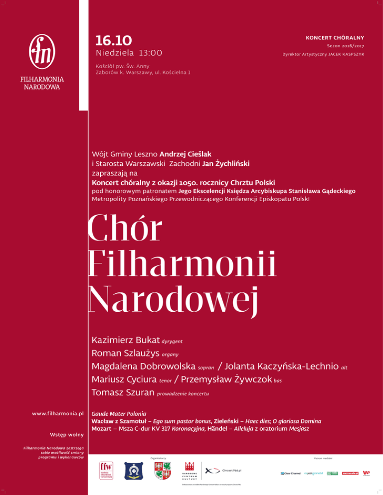 16.10 KONCERT CHÓRALNY Sezon 2016/2017 Niedziela 13:00 Dyrektor Artystyczny JACEK K ASPSZYK Kościół pw. Św. Anny Zaborów k. Warszawy, ul. Kościelna 1 Wójt Gminy Leszno Andrzej Cieślak i Starosta Warszawski Zachodni Jan Żychliński zapraszają na Koncert chóralny z okazji 1050. rocznicy Chrztu Polski pod honorowym patronatem Jego Ekscelencji Księdza Arcybiskupa Stanisława Gądeckiego Metropolity Poznańskiego Przewodniczącego Konferencji Episkopatu Polski Chór Filharmonii Narodowej Kazimierz Bukat dyrygent Roman Szlaużys organy Magdalena Dobrowolska sopran / Jolanta Kaczyńska-Lechnio alt Mariusz Cyciura tenor / Przemysław Żywczok bas Tomasz Szuran prowadzenie koncertu www.filharmonia.pl Wstęp wolny Gaude Mater Polonia Wacław z Szamotuł – Ego sum pastor bonus, Zieleński – Haec dies; O gloriosa Domina Mozart – Msza C-dur KV 317 Koronacyjna, Händel – Alleluja z oratorium Mesjasz Filharmonia Narodowa zastrzega sobie możliwość zmiany programu i wykonawców Organizatorzy Strategiczny Mecenas Roku Mecenasi Roku Patroni medialni Sponsorzy