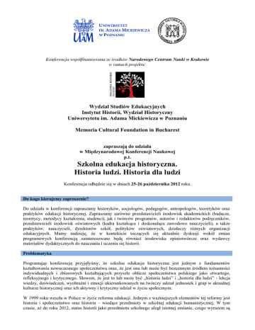 Konferencja współfinansowana ze środków Narodowego Centrum Nauki w Krakowie w ramach projektu: Wydział Studiów Edukacyjnych Instytut Historii, Wydział Historyczny Uniwersytetu im. Adama Mickiewicza w Poznaniu Memoria Cultural Foundation in Bucharest zapraszają do udziału w Międzynarodowej Konferencji Naukowej p.t. Szkolna edukacja historyczna. Historia ludzi. Historia dla ludzi Konferencja odbędzie się w dniach 25-26 października 2012 roku. Do kogo kierujemy zaproszenie? Do udziału w konferencji zapraszamy historyków, socjologów, pedagogów, antropologów, teoretyków oraz praktyków edukacji historycznej. Zapraszamy zarówno przedstawicieli środowisk akademickich (badacze, teoretycy, metodycy kształcenia, studenci), jak i twórców programów, autorów i redaktorów podręczników, przedstawicieli środowisk oświatowych (kadra kształcąca i doskonaląca zawodowo nauczycieli), a także praktyków: nauczycieli, dyrektorów szkół, polityków oświatowych, działaczy różnych organizacji edukacyjnych. Mamy nadzieję, że w kontekście toczących się aktualnie dyskusji wokół zmian programowych konferencją zainteresowane będą również środowiska opiniotwórcze oraz wydawcy materiałów dydaktycznych do nauczania i uczenia się historii. Problematyka Programując konferencję przyjęłyśmy, że szkolna edukacja historyczna jest jednym z fundamentów kształtowania nowoczesnego społeczeństwa oraz, że jest ona lub może być bezcennym źródłem tożsamości indywidualnych i zbiorowych kształtujących przyszłe oblicze społeczeństwa polskiego jako otwartego, refleksyjnego i krytycznego. Słowem, że jest to lub może być „historia ludzi” i „historia dla ludzi” - lekcja wiedzy, doświadczeń, wyobraźni i emocji ukierunkowanych na twórczy udział jednostek i grup w aktualnej kulturze historycznej oraz ich aktywny i krytyczny udział w życiu społecznym. W 1999 roku weszła w Polsce w życie reforma edukacji. Jednym z ważniejszych elementów tej reformy jest historia i społeczeństwo oraz historia – wiodące przedmioty w szkolnej edukacji humanistycznej. W tym czasie, aż do roku 2012, status historii jako przedmiotu szkolnego uległ istotnej zmianie, czego wyrazem są podstawy programowe kształcenia ogólnego poprawione i zatwierdzone w roku 2008 (z późniejszymi zmianami). Aktualny i gorący spór wokół kształtu i roli historii szkolnej, jaki podstawy te wywołały, każe nam postawić pytanie zarówno o miejsce i rolę historii we współczesnej szkole, jak i szerzej, o miejsce i rolę szkolnej edukacji historycznej w życiu społecznym i kulturze historycznej Polaków. Pytanie to stawiamy wskroś tak istotnych dla współczesnej edukacji historycznej problemów, jak: (1) problem relacji między współczesnymi historiografiami i szkolną narracją historyczną; (2) problem ukrytych aspektów programu nauczania historii w szkołach (hidden curriculum), (3) problem szkolnej edukacji historycznej, jako jednej z form społecznych odniesień do przeszłości; (4) problem pluralizacji historiografii oraz społecznych odniesień do przeszłości i znaczenia tego procesu dla szkolnej edukacji historycznej (w tym narracji dominujących i emancypacyjnych we współczesnej historiografii i szkolnej narracji dydaktycznohistorycznej). Ufamy, że konferencja ta umożliwi integrację, dyskusję oraz wymianę wiedzy i doświadczeń między osobami profesjonalnie zajmującymi się edukacją historyczną w Polsce (inicjacja oraz kontynuacja dzięki stworzonej platformie na stronie internetowej) a także będzie okazją do refleksji w szerszym międzynarodowym gronie i kontekście. Tematyka konferencji obejmuje następujące zagadnienia szczegółowe: I. Szkolna edukacja historyczna. Rozwiązania systemowe. 1. Modele współczesnej szkolnej edukacji historycznej. Studia porównawcze Polska-Europa-Świat. 2. Kształcenie nauczycieli historii. Studia porównawcze Polska-Europa-Świat. 3. Programy, podręczniki, metody współczesnej szkolnej edukacji historycznej. 4. II. Szkolna narracja dydaktyczno-historyczna. Od historii akademickiej do szkolnej edukacji historycznej 1. Współczesna historiografia/historiografie a historia nauczana w szkole. 2. Ukryte aspekty oficjalnego programu nauczania historii. 3. Dominujące i emancypacyjne narracje historiograficzne a szkolna narracja historyczna. 4. III. Społeczny wymiar szkolnej edukacji historycznej. 1. Szkolna edukacja historyczna – polityka historyczna państwa – kultura historyczna społeczeństwa. 2. Społeczny odbiór szkolnej edukacji historycznej (rodzice, uczniowie, nauczyciele). 3. Nauczyciel historii - historyk czy animator kultury historycznej? Alternatywne sposoby propagowania wiedzy historycznej. Komitet naukowy i organizacyjny Dr Iwona Chmura-Rutkowska (Wydział Studiów Edukacyjnych, UAM) Dr Claudia-Florentina Dobre (Faculty of History, University of Bucharest) Micaela Ghitescu (Memoria Cultural Foundation, Bucharest) Dr Edyta Głowacka – Sobiech (Wydział Studiów Edukacyjnych, UAM) Dr hab. Izabela Skórzyńska (Instytut Historii, UAM) Formuła konferencji Zapraszamy do wygłoszenia 15 minutowych referatów oraz udziału w dyskusji w wybranych przez Państwa poszczególnych sesjach panelowych. Na końcu komunikatu znajduje się lista proponowanych paneli a w osobnym załączniku szczegółowa problematyka oraz informacje na temat osób prowadzących. Prosimy także o zaznaczenie w karcie zgłoszenia, w jakim języku (polski/angielski) będziecie Państwo występować. Wystąpienia nie będą tłumaczone. Rejestracja Propozycje tematów wystąpień wraz z abstraktem (do 300 słów, w języku polskim i angielskim) oraz wskazaniem wybranego panelu tematycznego z listy zamieszczonej poniżej, prosimy nadsyłać do dnia 8 lipca 2012 roku. Aby zgłosić uczestnictwo w konferencji można: Skorzystać z formularza rejestracyjnego on line na stronie http://www.historiawszkole.amu.edu.pl Przesła