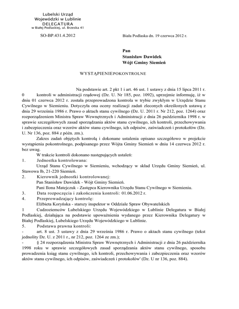 Lubelski Urząd Wojewódzki w Lublinie DELEGATURA w Białej Podlaskiej, ul. Brzeska 41 SO-BP.431.4.2012 Biała Podlaska dn. 19 czerwca 2012 r. Pan Stanisław Dawidek Wójt Gminy Siemień WYSTĄPIENIE POKONTROLNE Na podstawie art. 2 pkt 1 i art. 46 ust. 1 ustawy z dnia 15 lipca 2011 r. 0 kontroli w administracji rządowej (Dz. U. Nr 185, poz. 1092), uprzejmie informuję, iż w dniu 01 czerwca 2012 r. została przeprowadzona kontrola w trybie zwykłym w Urzędzie Stanu Cywilnego w Siemieniu. Dotyczyła ona oceny realizacji zadań zleconych określonych ustawą z dnia 29 września 1986 r. Prawo o aktach stanu cywilnego (Dz. U. 2011 r. Nr 212, poz. 1264) oraz rozporządzeniem Ministra Spraw Wewnętrznych i Administracji z dnia 26 października 1998 r. w sprawie szczegółowych zasad sporządzania aktów stanu cywilnego, ich kontroli, przechowywania i zabezpieczenia oraz wzorów aktów stanu cywilnego, ich odpisów, zaświadczeń i protokołów (Dz. U. Nr 136, poz. 884 z późn. zm.). Zakres zadań objętych kontrolą i dokonane ustalenia opisano szczegółowo w projekcie wystąpienia pokontrolnego, podpisanego przez Wójta Gminy Siemień w dniu 14 czerwca 2012 r. bez uwag. W trakcie kontroli dokonano następujących ustaleń: 1. Jednostka kontrolowana: Urząd Stanu Cywilnego w Siemieniu, wchodzący w skład Urzędu Gminy Siemień, ul. Stawowa lb, 21-220 Siemień. 2. Kierownik jednostki kontrolowanej: Pan Stanisław Dawidek - Wójt Gminy Siemień. Pani Ilona Matejczuk - Zastępca Kierownika Urzędu Stanu Cywilnego w Siemieniu. 3. Data rozpoczęcia i zakończenia kontroli: 01.06.2012 r. 4. Przeprowadzający kontrolę: Elżbieta Koryńska - starszy inspektor w Oddziale Spraw Obywatelskich 1 Cudzoziemców Lubelskiego Urzędu Wojewódzkiego w Lublinie Delegatura w Białej Podlaskiej, działająca na podstawie upoważnienia wydanego przez Kierownika Delegatury w Białej Podlaskiej, Lubelskiego Urzędu Wojewódzkiego w Lublinie. 5. Podstawa prawna kontroli: art. 8 ust. 3 ustawy z dnia 29 września 1986 r. Prawo o aktach stanu cywilnego (tekst jednolity Dz. U. z 2011 r., nr 212, poz. 1264 ze zm.); § 24 rozporządzenia Ministra Spraw Wewnętrznych i Administracji z dnia 26 października 1998 roku w sprawie szczegółowych zasad sporządzania aktów stanu cywilnego, sposobu prowadzenia ksiąg stanu cywilnego, ich kontroli, przechowywania i zabezpieczenia oraz wzorów aktów stanu cywilnego, ich odpisów, zaświadczeń i protokołów' (Dz. U nr 136, poz. 884). Przedmiot i okres objęty kontrolą: Realizacja zadań wynikających z ustawy Prawo o aktach stanu cywilnego. Okres objęty kontrolą: 02.01.2011 r. do dnia 31.05.2012 r., tj. do dnia poprzedzającego kontrolę. Poprzednia kontrola była przeprowadzona w dniu 01 października 2008 roku. 2. Osoba udzielająca wyjaśnień i informacji podczas kontroli: Pani Ilona Matejczuk - Zastępca Kierownika Urzędu Stanu Cywilnego w Siemieniu. 3. Ustalenia kontroli: Kierownikiem Urzędu Stanu Cywilnego w Siemieniu jest Wójt Gminy Siemień Pan Stanisław Dawidek, zaś Zastępcą Kierownika Urzędu Stanu Cywilnego w Siemieniu jest Pani Ilona Matejczuk. Na potrzeby Urzędu Stanu Cywilnego w Siemieniu przeznaczona jest sala ślubów oraz pokój biurowy Zastępcy Kierownika USC w którym przechowywane są księgi stanu cywilnego i akta zbiorowe. Pomieszczenie to znajduje się na pierwszym piętrze budynku Urzędu Gminy. Księgi stanu cywilnego i akta zbiorowe przechowywane są w szafach metalowych. Najstarsze księgi, jakie przechowywane są w USC pochodzą z roku 1931. Rejestracja stanu cywilnego. Akty urodzeń: Rok 2011 - sporządzono 3 akty urodzenia. Rok 2012 do dnia kontroli - sporządzono 1 akt urodzenia. Skorowidz alfabetyczny jest prowadzony. Akt urodzenia nr 1 z 2011 r. sporządzono na podstawie decyzji Z-cy Kierownika Urzędu Stanu Cywilnego w Siemieniu orzekającej o wpisaniu zagranicznego aktu urodzenia do polskich ksiąg, na podstawie art. 73 prawa o aktach stanu cywilnego. Podanie o wpisanie zagranicznego aktu urodzenia do polskich ksiąg wniosła osoba, której akt dotyczy. Podstawą wydania decyzji był akt urodzenia pochodzący z Ukrainy oraz jego urzędowe tłumaczenie na język polski, dokonane przez tłumacza przysięgłego. W aktach zbiorowych znajduje się decyzja Z-cy Kierownika USC o wpisaniu aktu zagranicznego do polskich ksiąg, wydana na podst. art 73 poasc z potwierdzeniem odbioru, wniosek oraz ukraiński odpis aktu urodzenia wraz z tłumaczeniem. W rubryce uwagi naniesiono stosowną adnotację o podstawie sporządzenia aktu (§ 7 ust. 1 rozporządzenia). Wolne miejsca w poszczególnych rubrykach zostały zakreślone, zgodnie z § 7 ust. 2 rozporządzenia. Akt jest podpisany przez Z-cę Kierownika USC i opieczętowany. Akt urodzenia nr 2 z 2011 r. sporządzono na podstawie decyzji Z-cy Kierownika USC w Siemieniu orzekającej o wpisaniu zagranicznego aktu urodzenia do polskich ksiąg na podstawie art. 73 prawa o asc. Podanie o wpisanie zagranicznego aktu urodzenia do polskich ksiąg wniosła matka dziecka. Podstawą wydania decyzji był aktu urodzenia pochodzący z Niemiec. W aktach zbiorowych znajduje się decyzja Z-cy Kierownika USC o wpisaniu aktu zagranicznego do polskich ksiąg, wydana na podstawie art. 73 poasc z potwierdzeniem odbioru, wniosek, oryginał niemieckiego aktu urodzenia na druku międzynarodowym oraz kserokopia paszportu dziecka. W rubryce uwagi naniesiono stosowną adnotację o podstawie sporządzenia aktu (§ 7 ust. 1 rozporządzenia). Wolne miejsca w poszczególnych rubrykach zostały zakreślone, zgodnie z § 7 ust. 2 rozporządzenia. Akt jest podpisany przez Z-cę Kierownika USC i opieczętowany. Akt urodzenia nr 3 z 2011 r. sporządzono na podstawie decyzji Z-cy Kierownika USC w Siemieniu orzekającej o wpisaniu zagranicznego aktu urodzenia do polskich ksiąg na podstawie art. 73 prawa o asc. Podanie o wpisanie zagranicznego aktu urodzenia do polskich ksiąg wniosła matka dziecka. Podstawą wydania decyzji był