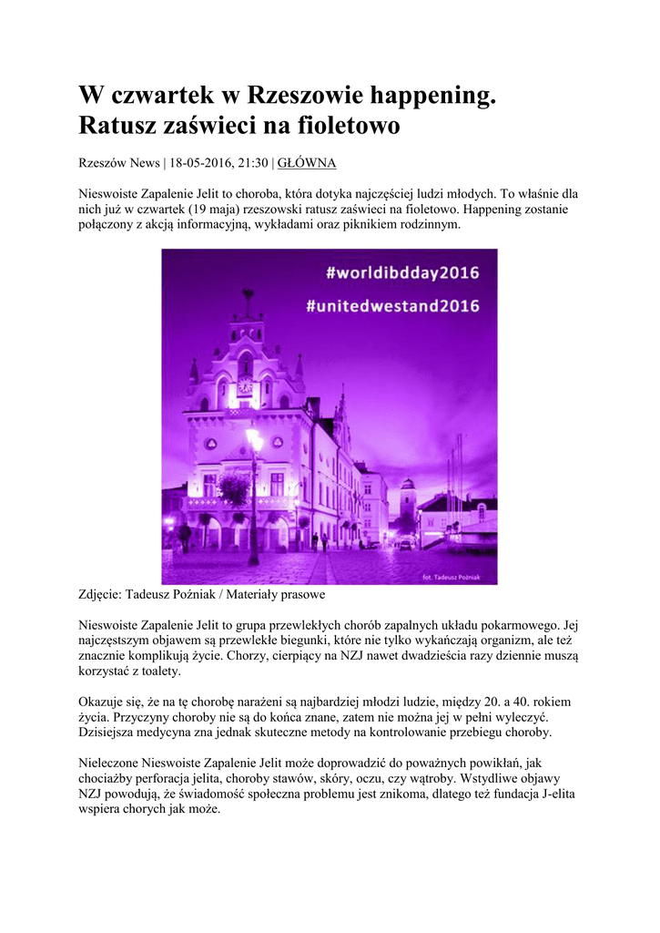 W czwartek w Rzeszowie happening. Ratusz zaświeci na fioletowo Rzeszów News | 18-05-2016, 21:30 | GŁÓWNA Nieswoiste Zapalenie Jelit to choroba, która dotyka najczęściej ludzi młodych. To właśnie dla nich już w czwartek (19 maja) rzeszowski ratusz zaświeci na fioletowo. Happening zostanie połączony z akcją informacyjną, wykładami oraz piknikiem rodzinnym. Zdjęcie: Tadeusz Poźniak / Materiały prasowe Nieswoiste Zapalenie Jelit to grupa przewlekłych chorób zapalnych układu pokarmowego. Jej najczęstszym objawem są przewlekłe biegunki, które nie tylko wykańczają organizm, ale też znacznie komplikują życie. Chorzy, cierpiący na NZJ nawet dwadzieścia razy dziennie muszą korzystać z toalety. Okazuje się, że na tę chorobę narażeni są najbardziej młodzi ludzie, między 20. a 40. rokiem życia. Przyczyny choroby nie są do końca znane, zatem nie można jej w pełni wyleczyć. Dzisiejsza medycyna zna jednak skuteczne metody na kontrolowanie przebiegu choroby. Nieleczone Nieswoiste Zapalenie Jelit może doprowadzić do poważnych powikłań, jak chociażby perforacja jelita, choroby stawów, skóry, oczu, czy wątroby. Wstydliwe objawy NZJ powodują, że świadomość społeczna problemu jest znikoma, dlatego też fundacja J-elita wspiera chorych jak może. Już czwartek (19 maja) o 19:00, dzięki J-elita, ratusz na rzeszowskim Rynku zaświeci dla chorych na NZJ na flotowo. Razem z happeningiem zostanie połączona akcja informacyjna na temat przewlekłych chorób związanych z układem pokarmowym. Jednak to nie wszystko, ponieważ J-elita organizuje 4 czerwca (sobota) cykl wykładów oraz piknik rodzinny dla wszystkich zdrowych, chorych, sympatyków oraz rodzin z dziećmi. W programie przewidziane są prelekcje dr Karoliny Radwan, która wygłosi referat pt. „Nowe nadzieje w nieswoistym zapaleniu jelit”. Z kolei dr Marta Głuszek-Osuch opowie o roli psychoterapii w radzeniu sobie z chorobą, a lekarka Ewelina Bartosiewicz wyjaśni, jak można spędzić wakacje chorując na NZJ. Po części naukowej rozpocznie się rodzinny piknik, podczas którego będzie można porozmawiać z psychologiem i wolontariuszami z grupy wsparcia oraz zmierzyć sobie ciśnienie. Wśród atrakcji pojawią się również pokazy pierwszej pomocy oraz występ Zespołu Pieśni i Tańca „Mały Łańcut”. Dla maluchów natomiast organizatorzy przygotowali smakołyki w postaci waty cukrowej, zjeżdżalnie oraz klauna. Pojawi się również animator, który zapewni najmłodszym wyśmienitą zabawę, podczas której odbędzie się pokaz baniek mydlanych oraz wiele gier, zabaw i konkursów. Pamiątką z tego spotkania będzie również malunek na twarzy, który fachowo wykonają animatorzy zabawy. Wykłady oraz piknik odbędą się w Klinicznym Szpitalu Wojewódzkim nr 2 (ul. Lwowska 60) od godz. 9:00. (jg) [email protected]