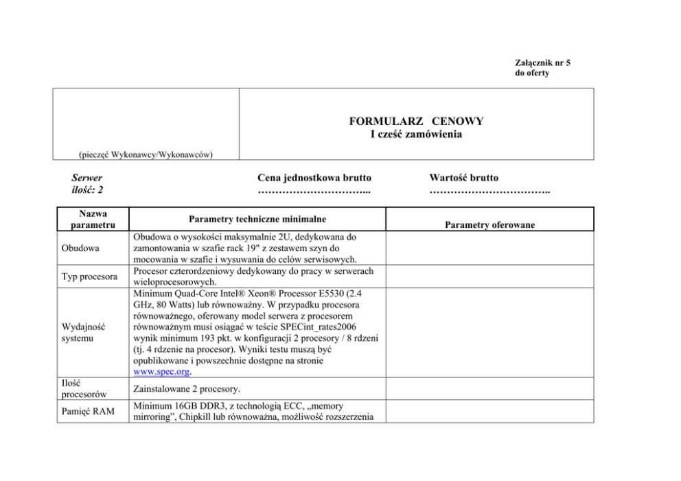 Załącznik nr 5 do oferty FORMULARZ CENOWY I cześć zamówienia (pieczęć Wykonawcy/Wykonawców) Serwer ilość: 2 Nazwa parametru Obudowa Typ procesora Wydajność systemu Cena jednostkowa brutto …………………………... Parametry techniczne minimalne Obudowa o wysokości maksymalnie 2U, dedykowana do zamontowania w szafie rack 19" z zestawem szyn do mocowania w szafie i wysuwania do celów serwisowych. Procesor czterordzeniowy dedykowany do pracy w serwerach wieloprocesorowych. Minimum Quad-Core Intel® Xeon® Processor E5530 (2.4 GHz, 80 Watts) lub równoważny. W przypadku procesora równoważnego, oferowany model serwera z procesorem równoważnym musi osiągać w teście SPECint_rates2006 wynik minimum 193 pkt. w konfiguracji 2 procesory / 8 rdzeni (tj. 4 rdzenie na procesor). Wyniki testu muszą być opublikowane i powszechnie dostępne na stronie www.spec.org. Ilość procesorów Zainstalowane 2 procesory. Pamięć RAM Minimum 16GB DDR3, z technologią ECC, „memory mirroring”, Chipkill lub równoważna, możliwość rozszerzenia Wartość brutto …………………………….. Parametry oferowane Nazwa parametru Płyta główna Sloty PCI Dyski HDD Kontroler macierzowy Karta sieciowa Karta graficzna Porty Parametry techniczne minimalne pamięci do minimum 64 GB dla każdego zainstalowanego procesora. Dwuprocesorowa, dedykowana do pracy w serwerach, wyprodukowana przez producenta serwera, Minimum 4 sloty PCI-Express. Serwer musi mieć możliwość adaptacji do uzyskania min 2 slotów PCI-X lub posiadać takie sloty w standardzie. 2 x 146 GB SAS 6Gbps, 10,000 obrotów na minutę, Hot-Plug 2,5”, możliwość zainstalowania minimalnie 12 dysków (SAS/SATA) typu Small Form Factor (SFF) w wewnętrznych zatokach serwera. Możliwość instalacji dysków w technologii SSD. Kontroler macierzowy SAS, umożliwiający konfigurację dysków w macierzach RAID 0/1 min. 256MB z podtrzymywaniem bateryjnym. Zintegrowane z płytą główną 2x GigabitEthernet. Karty sieciowe muszą wspierać load balancing, failover i TCP/IP Offload Engine. Możliwość instalacji dodatkowych dwóch interfejsów GigabitEthernet nie zajmujących slotu PCI-E. Zintegrowana karta graficzna. 2 porty RJ-45. 1 port RJ-45 dedykowany dla interfejsu zdalnego zarządzania. 5 portów USB (2 z przodu, 2 z tyłu, 1 wewnątrz serwera). 1 port VGA. 1 port szeregowy 2 x FC (Fibre Channel), na dwóch osobnych kartach. Napęd dysków optycznych DVD+-RW. Zasilanie Redundantne zasilacze typu Hot-Plug. Maksymalnie 675 W na zasilacz. Parametry oferowane Nazwa parametru Chłodzenie Parametry techniczne minimalne Parametry oferowane Redundantne wiatraki typu Hot-Plug. Wbudowany moduł TPM 1,2 do przechowywania kluczy kryptograficznych. Dodatkowo wbudowany panel diagnostyczny umożliwiający identyfikację uszkodzonego elementu serwera, wyposażony Bezpieczeństwo także w system przewidywania awarii poszczególnych elementów serwera: dysków twardych, pamięci RAM, zasilaczy, wiatraków z oprogramowaniem pozwalającym wysłać komunikat alarmowy do administratora. Gwarancja producenta min. 3 lata, świadczona w siedzibie Gwarancja użytkownika (typu On-site) z gwarantowanym czasem naprawy w ciągu 24 godzin. Zewnętrzna macierz dyskowa Wartość brutto ilość: 1 ……………………….. Nazwa parametru Dyski Kontroler Złącza Parametry techniczne minimalne Macierz dyskowa musi być wyposażona w minimum 7 dysków SAS (i/lub SATA) o pojemności co najmniej 146 GB. Obudowa kontrolerów macierzy musi posiadać miejsca na instalacje co najmniej 12 dysków w technologii SAS (i/lub SATA). Oraz musi gwarantować możliwość rozbudowy, do co najmniej 48 dysków. Wymiany dysków podczas pracy systemu (Hot-Swap). Macierz musi być wyposażona w dwa kontrolery RAID pracujące w trybie active-active. Macierz musi być wyposażona w minimum 4 zewnętrzne porty 4Gbit/s Fibre Channel umożliwiające bezpośrednie Parametry oferowane Nazwa parametru Obudowa Pamięć Cache Raid Parametry techniczne minimalne podłączenie serwerów. Macierz dyskowa musi umożliwić redundantne podłączenie minimum 2 serwerów. Licencje na oprogramowanie do automatycznego przełączania ścieżki dla każdego z 2 serwerów, dla wszystkich wspieranych systemów operacyjnych muszą być dołączone do macierzy bez dodatkowej opłaty. Macierz musi być wyposażona w zestaw do montażu w szafie przemysłowej rack 19”. Obudowa z kontrolerami macierzy oraz półki dyskowe muszą mieć wysokość nie większą niż 2U. Macierz musi być wyposażona w minimum 1GB pamięci cache przeznaczonej dla danych (sumarycznie dla obu kontrolerów) z możliwością rozbudowy do 2GB. Pamięć cache musi być kopiowana pomiędzy kontrolerami i podtrzymywana bateryjnie (wymagane baterie litowo jonowe). Dane zapisywane w wewnętrznej pamięci cache jednego z kontrolerów muszą być także powielane w pamięci cache pozostałych kontrolerów, tak aby w przypadku uszkodzenia dowolnego kontrolera zachowana była spójność danych. Macierz musi jednocześnie obsługiwać wolumeny zabezpieczone następującymi poziomami RAID: RAID 0, RAID 1, RAID 3, RAID 5, RAID6, RAID 10. Ponadto musi umożliwiać: 1) rozbudowę i stworzenie konfiguracji odpornej na awarię pojedynczej półki bez utraty danych przy zastosowaniu RAID-5. Macierz musi umożliwiać rozbudowę i stworzenie fizycznej grupy RAID-5 na co najmniej 30 dyskach z założeniem, że maksymalnie pojemność jednego dysku przeznaczona jest na Parametry oferowane Nazwa parametru Parametry techniczne minimalne informacje o parzystości (np. 29D+1P). 2) Rozbudowę i stworzenie fizycznej grupy RAID-6 na co najmniej 30 dyskach z założeniem, że maksymalnie pojemność dwóch dysków przeznaczona jest na informacje o parzystości (np. 28D+2P). 3) rozbudowę i stworzenie fizycznej grupy RAID-0 / RAID-1/10 na wszystkich dyskach przy pełnym obłożeniu macierzy dyskami (48 dysków). 4) budowę wolumenów >2TB. Funkcjonaln