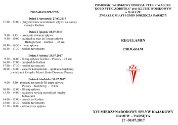 PROGRAM SPŁYWU Dzień 1 /czwartek/ 27.07.2017 17.00 – 22.00 - przyjmowanie uczestników spływu na stanicy POMORSKI WOJSKOWY ODDZIAŁ PTTK w WAŁCZU KOŁO PTTK „SOBÓTKA” przy KLUBIE WOJSKOWYM w WAŁCZU ZWIĄZEK MIAST i GMIN DORZECZA PARSĘTY wodnej w Karlinie Dzień 2 /piątek/ 28.07.2017 9.00 – 9.15 - uroczyste otwarcie spływu 9.30 – 10.00 - przejazd na start do I etapu spływu Białogórzyno – Karlino - 28 km 10.30 – 16.30 - I etap spływu 16.30 – 17.30 - posiłek turystyczny REGULAMIN PROGRAM Dzień 3 /sobota/ 29.07.2017 9.30 – 16.00 - II etap spływu: Karlino – Pustary – 28 km 16.00 – 17.00 - przejazd do Karlina 17.00 – 17.30 - posiłek turystyczny 20.00 – 24.00 - wieczór komandorski – spotkanie kajakarzy z władzami Związku Miast i Gmin Dorzecza Parsęty Dzień 4 /niedziela/ 30.07.2017 9.00 – 9.30 - przejazd na start do III etapu spływu: Pustary – Kołobrzeg - 18 km 10.00 – 13.00 - III etap spływu 13.30 – 14.00 - kajakowy wyścig australijski między bulwarami 14.00 – 15.00 - powrót do Karlina 15.00 – 15.30 - posiłek turystyczny 15.30 – 16.00 - zakończenie spływu XVI MIĘDZYNARODOWY SPŁYW KAJAKOWY RADEW – PARSĘTA 27 -30.07.2017 Organizator: Pomorski Wojskowy Oddział PTTK w Wałczu, 78-600 Wałcz ul. Mazowiecka2, tel. 261 472-228, 601 337-954, email: [email protected] Przy pomocy: Związku Miast i Gmin Dorzecza Parsęty Baza noclegowa: stanica wodna w Karlinie Komandor spływu: Zbigniew Manicz. V-ce komandor: Bogdan Bereszyński Piloci – Mirosław Sielicki, Dariusz Sprada Ratownik: Marcin Gwóźdź Termin: 27 - 30.07.2017 r. Trasa: Rzeka Radew: Białogórzyno-Karlino-30 km; rzeka Parsęta: Karlino-Kołobrzeg-44 km Cele spływu: - zapoznanie turystów-kajakarzy z walorami turystyczno-krajoznawczymi regionu; - popularyzacja czynnego wypoczynku poprzez - uprawianie turystyki kajakowej; - integrowanie środowiska turystów-kajakarzy Zasady uczestnictwa: zgłoszenie uczestnictwa w spływie następuje drogą elektroniczną lub pisemną przez wypełnienie i przesłanie pocztą karty zgłoszenia podpisanej przez kierownika ekipy wraz z dołączoną kopią wpłaty wpisowego. UWAGA: ostateczny termin nadsyłania zgłoszeń upływa z dniem 1.07.2017 r. Sprawy finansowe: wpisowe za udział w spływie - 200 zł. Świadczenia organizatora: przewóz uczestników na trasie spływu, znaczek okolicznościowy, wklejka TOK, zawody i konkursy, puchary i nagrody, opieka ratownicza, możliwość weryfikacji książeczek turystyki kajakowej, miejsce na polu namiotowym, codziennie gorący posiłek Warunki uczestnictwa: - umiejętność pływania, - wpłata wpisowego, - wiek-ukończone 18 lat, osoby niepełnoletnie pod opieką opiekunów prawnych. Postanowienia końcowe: 1. XVI Międzynarodowy Spływ Kajakowy Radew - Parsęta 2017 jest imprezą otwartą o charakterze rekreacyjnym. 2. Od uczestników wymagany jest stan zdrowia umożliwiający uprawianie turystyki kajakowej. 3. Osoby niepełnoletnie mogą brać udział w spływie jedynie pod opieką dorosłych opiekunów, biorących na siebie całkowitą odpowiedzialność za ich bezpieczeństwo. 4. Kierownictwo spływu ma prawo wyłączenia z uczestnictwa osób, które nie podporządkują się Regulaminowi spływu oraz zarządzeniom Kierownictwa bez prawa zwrotu wniesionych opłat. 5. Picie alkoholu w czasie trwania spływu jest niedozwolone. 6. Kierownictwo spływu nie bierze odpowiedzialności za majątek uczestników. 7. Każdy uczestnik bierze udział w spływie na własną odpowiedzialność; obowiązany jest płynąć w założonej i zapiętej kamizelce asekuracyjnej. 8. Kierownictwo spływu ze względu na bezpieczeństwo uczestników i warunki pogodowe może zmienić, skrócić a nawet odwołać poszczególne etapy spływu bez prawa rekompensat dla uczestników. 9. Ostateczna interpretacja postanowień regulaminu pozostaje w wyłącznych kompetencjach kierownictwa. Niniejszy Regulamin opracowano w oparciu o Regulamin Kajakowych Spływów Turystycznych PZK ZWIĄZEK MIAST I GMIN DORZECZA PARSĘTY www.parseta.pl POMORSKI WOJSKOWY ODDZIAŁ PTTK w Wałczu www.kajaki.pttk.pl KARTA ZGŁOSZENIOWA „XVI Międzynarodowy Spływ Kajakowy Parsęta 2017, Europejskie Spotkania Ekologiczne” Nazwa klubu ......................................................................................................................................................................................................................... Adres ..................................................................................................................................................................................................................................... Lp. NAZWISKO I IMIĘ ADRES PESEL TELEFON PODPIS 1. 2. 3. 4. Oświadczam, że warunki uczestnictwa w spływie (regulamin spływu) są nam znane i zobowiązujemy się ich przestrzegać. Rezygnacja z uczestnictwa w spływie na 7 dni przed rozpoczęciem spływu lub w trakcie jego trwania zobowiązuje do pokrycia kosztów organizacyjnych w wysokości 200 zł za osobę. Kierownik grupy ............................................. Data i podpis: ....................................................... Dorzecze Parsęty w Internecie: www.parseta.org.pl