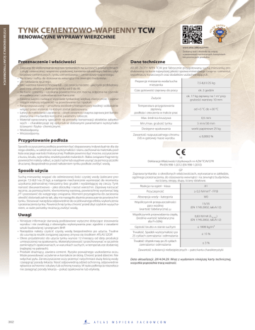 SYSTEM RENOWACJI śCIAN TYNKOWANYCH TYNK CEMENTOWO-WAPIENNY TCW RENOWACYJNE WYPRAWY WIERZCHNIE www.atlas.2dkod.pl/410 Zeskanuj kod i dowiedz się więcej o parametrach technicznych, korzyściach lub promocjach produktu Przeznaczenie i właściwości Dane techniczne • Zalecany do wykonywania wypraw tynkarskich na surowych powierzchniach z cegły ceramicznej i wapienno-piaskowej, kamienia naturalnego, betonu, płyt wiórowo-cementowych, tynku cementowego i cementowo-wapiennego. • Na ściany i sufity, do stosowania wewnątrz i na zewnątrz budynków. • Do nakładania ręcznego. • Jako warstwa nawierzchniowa lub – po zatarciu na ostro - jako tynk podkładowy pod inne okładziny (kategoria tynku od 0 do III). • Na bazie cementu – uzyskana powierzchnia jest mocna, odporna na czynniki atmosferyczne i uszkodzenia mechaniczne. • Zawiera wapno nadające wyprawie tynkarskiej większą elastyczność i zapewniające większą odporność na powstawanie rys i spękań. • Paroprzepuszczalny – umożliwia swobodny transport pary wodnej i oddawanie wilgoci przez materiał, na którym został zastosowany. • Łatwy do nakładania i zacierania – dzięki zawartości wapna zaprawa jest bardzo plastyczna i ma bardzo korzystne parametry robocze. • Materiał opracowany specjalnie na potrzeby konserwacji obiektów zabytkowych – charakteryzuje się optymalnie dobranymi parametrami wytrzymałościowymi i fizyko- chemicznymi. • Wodoodporny. • Mrozoodporny. ATLAS ZŁOTY WIEK TCW jest fabrycznie przygotowaną suchą mieszanką produkowaną na bazie najwyższej jakości spoiwa mineralnego (wapna i cementu), wypełniaczy kwarcowych oraz dodatków uszlachetniających. Przygotowanie podłoża Sposób oczyszczenia podłoża powinien być dopasowany indywidualnie dla danego obiektu, w zależności od wytrzymałości i stanu zachowania materiału podłoża oraz jego wartości historycznej. Podłoże powinno być mocne, oczyszczone z kurzu, brudu, wykwitów, resztek powłok malarskich. Słabo związane fragmenty powierzchni należy odkuć, a części luźne lub osypliwe usunąć za pomocą szczotki drucianej. Bezpośrednio przed nałożeniem tynku podłoże zwilżyć wodą. Sposób użycia Suchą mieszankę wsypać do odmierzonej ilości czystej wody (zalecane proporcje: 7,5-8,0 l na 25 kg), a następnie mechanicznie wymieszać do momentu uzyskania jednorodnej mieszaniny bez grudek i wydzielającej się cieczy. Tynk nanosić dwuwarstwowo – jako obrzutkę i narzut wierzchni. Zaprawę narzucać ręcznie, za pomocą kielni, równomierną warstwą, powierzchnię wyrównać łatą „H” i pozostawić do wstępnego związania. Moment przystąpienia do zacierania określić doświadczalnie tak, aby nie nastąpiło zbytnie przesuszenie powierzchni tynku. Stosować narzędzia odpowiednie do oczekiwanego efektu wykończenia i przeznaczenia tynku. Powierzchnię tynku chronić przed zbyt szybkim wysychaniem, w razie potrzeby można ją zwilżyć wodą. Uwagi • Niniejsze informacje stanowią podstawowe wytyczne dotyczące stosowania wyrobu i nie zwalniają z obowiązku wykonywania prac zgodnie z zasadami sztuki budowlanej i przepisami BHP. • Narzędzia należy czyścić czystą wodą bezpośrednio po użyciu. Trudne do usunięcia resztki związanej zaprawy zmywa się środkiem ATLAS SZOP. • Okres przydatności do użycia tynku wynosi 12 miesięcy od daty produkcji umieszczonej na opakowaniu. Materiał przewozić i przechowywać w szczelnie zamkniętych opakowaniach, w warunkach suchych, w temperaturze dodatniej (najlepiej na paletach). • Produkt drażniący, zawiera cement. Ryzyko poważnego uszkodzenia oczu. Może powodować uczulenie w kontakcie ze skórą. Chronić przed dziećmi. Nie wdychać pyłu. Zanieczyszczone oczy przemyć natychmiast dużą ilością wody i zasięgnąć porady lekarza. Nosić odpowiednią odzież ochronną, odpowiednie rękawice ochronne i okulary lub ochronę twarzy. W razie połknięcia niezwłocznie zasięgnąć porady lekarza – pokaż opakowanie lub etykietę. 362 Proporcje mieszania woda/sucha mieszanka 7,5-8,0 l/25 kg Czas gotowości zaprawy do pracy ok. 2 godzin Zużycie ok. 17 kg zaprawy na 1 m2 przy grubości warstwy 10 mm Temperatura przygotowania zaprawy, podłoża i otoczenia w trakcie prac od +5 °C do +30 °C Max. średnica kruszywa 0,5 mm Min./max. grubość tynku 5 mm/30 mm Dostępne opakowania worki papierowe 25 kg Zawartość rozpuszczalnego chromu (VI) w gotowej masie wyrobu ≤ 0,0002 % 14 Deklaracja Właściwości Użytkowych nr AZW TCW/CPR PN-EN 998-1:2012 (EN 998-1:2010) GP Zaprawa tynkarska o określonych właściwościach, wytwarzana w zakładzie, ogólnego przeznaczenia, do stosowania wewnątrz i na zewnątrz budynków, na ściany, stropy, słupy, ściany działowe. Reakcja na ogień - klasa A1 Przyczepność ≥ 0,3 N/mm² - FP:B Absorpcja wody - kategoria W0 Współczynnik przepuszczalności pary wodnej (wartość tabelaryczna), μ 15/35 (EN 1745:2002, tab.A.12) Współczynnik przewodzenia ciepła, (średnia wartość tabelaryczna dla P=50%) 0,83 W/mK (λ10, dry) (EN 1745:2002, tab.A.12) Gęstość brutto w stanie suchym ≤ 1800 kg/m³ Trwałość. Spadek wytrzymałości po 25 cyklach zamrażania i odmrażania ≤ 15 % Trwałość. Ubytek masy po 25 cyklach zamrażania i odmrażania ≤3% Zawartość substancji niebezpiecznych – patrz karta charakterystyki Data aktualizacji: 2014.04.29. Wraz z wydaniem niniejszej karty technicznej, wszystkie poprzednie tracą ważność.