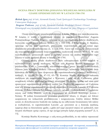 OCENA PRACY DOKTORA JOHANNA WILHELMA MOELLERA W CZASIE EPIDEMII DŻUMY W LATACH 1780-1781 Robak Igor, prof. dr hab., kierownik Katedry Nauk Społecznych Charkowskiego Narodowego Uniwersytetu Medycznego; Srogosz Tadeusz, prof. dr hab., kierownik Zakładu Metodologii Historii i Historii Historiografii oraz kierownik studiów doktoranckich Akademii im. Jana Długosza w Częstochowie Ocena działalności przeciwepidemicznej doktora Möllera jest niejednoznaczna. W książce o walce z epidemiami dżumy za panowania Stanisława Augusta Poniatowskiego Tadeusz Srogosz, opierając się na raportach urzędników skarbowych, krytycznie ocenił pracę doktora Möllera [3, s. 102–108]. Z kolei Ignacy Z. Siemion, opierając się na jego zapiskach, pozytywnie wypowiedział się na temat jego działalności przeciwepidemicznej (2, s. 114–118). Autor ten widocznie zafascynował się znaczącymi dokonaniami krajoznawczymi i naukowymi doktora Möllera. W celu weryfikacji tych sprzecznych opinii podjęliśmy jeszcze raz analizę działalności tego lekarza w czasie epidemii dżumy w latach 1780-1781. Główną troską władz skarbowych było zabezpieczenie komór celnych w wykwalifikowaną opiekę medyczną. W tym celu Komisja Skarbu Koronnego 23 października 1780 r. zatrudniła rekomendowanego przez lekarzy warszawskich doktora Jana Wilhelma Möllera i felczera Kicińskiego, uchwalając jednocześnie dwie instrukcje dla ludności oraz dyspozycje dla superintendentów prowincji ukraińskiej i ruskiej[1, k. 10–18, 31–36, 47–53, 65–75]. Komisja Skarbu Koronnego nakazała medykom jak najspieszniej wyjechać z Warszawy i udać się do Cudnowna, gdzie urzędowały władze skarbowe prowincji ukraińskiej. Po drodze opiekę nad nimi miał sprawować superintendent prowincji ruskiej Jan Piegłowski, natomiast od Cudowna miał ich przejąć superintendent prowincji ukraińskiej Franciszek Lasocki. Z Cudowna doktora Möllera i felczera Kicińskiego należało od razu wyekspediować w zagrożone rejony nad rzeką Dniestr, czyli do kwarantann w okolicach Krzywego Jeziora i Swinny. W jednej kwarantannie powinien przebywać lekarz, w drugiej zaś felczer zaopatrzony we wskazówki profilaktyczne i terapeutyczne. Gdyby doktor Möller uznał, że dotychczasowe budynki nie nadają się na odbywanie kwarantanny lub należy je rozbudować, to superintendent Lasocki „za zniesieniem się z komendą wojskową, nająwszy domy na kwarantanny zgodne, a gdyby tych nająć zręczności miejsca nie zadowalało, nowe kosztem skarbowym czyniąc expensa, ile tego wyciągać potrzeba będzie przyzwoitą wystawił” [1, k. 11]. Komisja Skarbu Koronnego z całą mocą podkreślała, że nie należy wpuszczać 1 Матеріали Міжнародної наукової інтернет-конференції «Історичні, економічні, соціально-філософські та освітні аспекти розвитку охорони здоров’я» kupców z prowincji tureckich bez odbycia kwarantanny nie krótszej niż cztery tygodnie. W tym celu do każdej kwarantanny zostali przydzieleni – oprócz lekarza i felczera – rewizor skarbowy i dwaj strażnicy. Mieli oni załatwiać wszelkie formalności związane z odprawą kupców i odbywaniem kwarantanny oraz przesyłać do Komisji Skarbu Koronnego raporty o sytuacji epidemicznej i liczbie zatrzymanych (z podaniem danych personalnych, pozycji społecznej, miejsca zamieszkania, miejsca przybycia i celu podróży). Do obowiązków doktora Möllera i felczera Kicińskiego należała opieka medyczna nad zatrzymanymi w Krzywym Jeziorze i Swinnie, a w razie potrzeby wyjazd w inne zadżumione rejony. Komisja Skarbu Koronnego odebrała od felczera rotę przysięgi następującej treści: „Ja N przysięgam Panu Bogu, iż wyznaczonym będąc dla dopilnowania ludzi kwarantannę wysiadujących i strzeżenia szerzącej się zarazy powietrza, ich osobi i zdrowie ciał ich sumiennie examinować będę. Dozór tychże przynajmniej w trzeci dzień wizytując z równym examinowaniem zdrowia zachowam, w nie poznanych przeze mnie chorobach do doktora referować się i od niego rezolucji żądać będę, a podług mego i doktora przeświadczenia, przy kończącej się kwarantannie, każdego zdrowość lub zarazę sprawiedliwie i nie uwodząc się żadnym datkiem, bojaźnią, przyjaźnią lub nienawiścią i nic nie biorąc, choćby mi co dobrowolnie na zdradę ofiarowane było, zaświadczę. Tak mi Panie Boże dopomóż”[1, k. 16-16v]. Dla doktora Möllera przygotowano identyczną rotę przysięgi, pomijając jedynie fragment o konsultacji. Doktor Möller i felczer Kiciński wolno podróżowali z Warszawy w rejon komór celnych nad Dniestrem, a i po przybyciu na miejsce nie kwapili się do pracy. Pisarz komory Józefgród Bałta Jerzy Jabłoński skarżył się na ich opieszałość: „JM Pan doktor Moeller i Kiciński felczer dnia 11 praesentis stanęli w Berszadzie, gdzie zabawiwszy dni dwa dla przygotowania medycyny i przyjęcia felczera, którego za zł. 15 zgodzili, wraz ze mną, wziąwszy u brygady tu stojącej konwój, ruszyli ku Bałcie, z któremi nie tylko ja wyjechałem, ale i JMP. porucznik Perekładowski, i najprzód zaprowadziliśmy onych do zarażonych w polu będących, potym pojechaliśmy pod miasto Złotnik, sądząc, że gdy nie w polu zarażonym, to przynajmniej w mieście zdrowym dadzą jakowąś pomoc, ale gdy nawet i z konia żaden zsieść nie chciał i żadnego zaradzenia ludziom zdrowym w mieście nie uczynił, bez żadnego dania gdyby mieli siedzieć w Berszadzie, toby na jedno wypadło, jak gdyby z Warszawy nie wyjeżdżali” [1, k. 94–94v]. Medycy postanowili początkowo mieszkać z dala od kwarantann, czyli w Berszadzie, domagali się o wypłatę drugiej połowy wynagrodzeń, dopominali się o przysłanie jeszcze trzech felczerów z Warszawy oraz pieniędzy na zakup medykamentów lub dostarczenie ich z apteki berdyczowskiej. Po