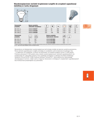 Wysokonapięciowe żarówki kryptonowe Longlife do urządzeń sygnalizacji świetlnej w ruchu drogowym 1 Oznaczenie produktu Numer produktu Jednostka wysyłkowa SIG 1541 LL SIG 1543 LL SIG 1546 LL 4008321044327 4008321044389 4008321044358 60 75 100 380 540 780 s105 1) s105 1) s105 1) E27 E27 E27 62 62 62 Numer produktu Opakowanie zbiorcze Oznaczenie produktu SIG 1541 LL SIG 1543 LL SIG 1546 LL 235 235 235 91 91 101 69 2) 69 2) 79 2) 4050300613642 4050300613666 4050300613680 100 100 100 1 1 1 1) Należy przestrzegać bezwzględnie podanych w zestawieniu dopuszczalnych pozycji pracy. Wszelkie odchylenia prowadzą do przedwczesnej awarii żarówki 2) LCL = light centre lenght (odległość żarnika od krawędzi trzonka) Sprawdzona od dziesięcioleci wysokonapięciowa technologia została raz jeszcze wyraźnie poprawiona. Nowe żarówki sygnalizacyjne Longlife pozwalają na wydłużenie cykli konserwacji do jednego roku – w zależności od urządzenia, w którym są stosowane. Ich średnia trwałość wynosi 14 000 godzin. Podczas pierwszych 5 500 godzin pracy awarie wysokonapięciowych żarówek sygnalizacyjnych nie przekraczają 2%. Wszystkie poziomy mocy spełniają wymagania w zakresie strumienia świetlnego określone normą PN-EN 12368. Budowa żarówek, trzonek E27 i dane elektryczne odpowiadają obowiązującym normom, dzięki czemu mogą być stosowane w istniejących urządzeniach sygnalizacyjnych bez konieczności przezbrajania czy justowania. 8.11 Trzonki IEC/EN 60061-1 BA15d Arkusz 7004-11A BA15s Arkusz 7004-11A BA20d Arkusz 7004-12 BA20s Arkusz 7004-12 Norma na oprawki: Arkusz 7005-13 Arkusz 7005-13 Arkusz 7005-14 Arkusz 7005-14 E10 Arkusz 7004-22 E27 Arkusz 7004-21 Norma na oprawki: Arkusz 7005-20 Arkusz 7005-20 G4 Arkusz 7004-72 GY6.35-15 Arkusz 7004-59 P13.5s Arkusz 7004-40 PX13.5s Arkusz 7004-35 Norma na oprawki: Arkusz 7005-72 Arkusz 7005-59 Arkusz 7005-35 PK22s Arkusz 7004-47 Norma na oprawki: Arkusz 7005-47 8.15