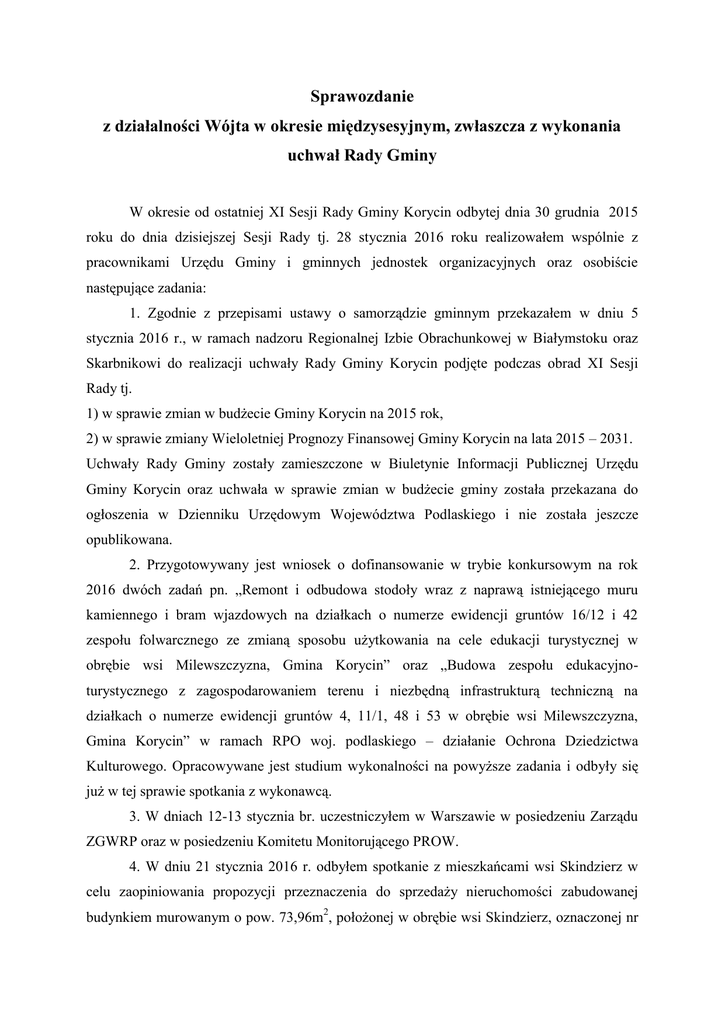 Sprawozdanie z działalności Wójta w okresie międzysesyjnym, zwłaszcza z wykonania uchwał Rady Gminy W okresie od ostatniej XI Sesji Rady Gminy Korycin odbytej dnia 30 grudnia 2015 roku do dnia dzisiejszej Sesji Rady tj. 28 stycznia 2016 roku realizowałem wspólnie z pracownikami Urzędu Gminy i gminnych jednostek organizacyjnych oraz osobiście następujące zadania: 1. Zgodnie z przepisami ustawy o samorządzie gminnym przekazałem w dniu 5 stycznia 2016 r., w ramach nadzoru Regionalnej Izbie Obrachunkowej w Białymstoku oraz Skarbnikowi do realizacji uchwały Rady Gminy Korycin podjęte podczas obrad XI Sesji Rady tj. 1) w sprawie zmian w budżecie Gminy Korycin na 2015 rok, 2) w sprawie zmiany Wieloletniej Prognozy Finansowej Gminy Korycin na lata 2015 – 2031. Uchwały Rady Gminy zostały zamieszczone w Biuletynie Informacji Publicznej Urzędu Gminy Korycin oraz uchwała w sprawie zmian w budżecie gminy została przekazana do ogłoszenia w Dzienniku Urzędowym Województwa Podlaskiego i nie została jeszcze opublikowana. 2. Przygotowywany jest wniosek o dofinansowanie w trybie konkursowym na rok 2016 dwóch zadań pn. „Remont i odbudowa stodoły wraz z naprawą istniejącego muru kamiennego i bram wjazdowych na działkach o numerze ewidencji gruntów 16/12 i 42 zespołu folwarcznego ze zmianą sposobu użytkowania na cele edukacji turystycznej w obrębie wsi Milewszczyzna, Gmina Korycin” oraz „Budowa zespołu edukacyjnoturystycznego z zagospodarowaniem terenu i niezbędną infrastrukturą techniczną na działkach o numerze ewidencji gruntów 4, 11/1, 48 i 53 w obrębie wsi Milewszczyzna, Gmina Korycin” w ramach RPO woj. podlaskiego – działanie Ochrona Dziedzictwa Kulturowego. Opracowywane jest studium wykonalności na powyższe zadania i odbyły się już w tej sprawie spotkania z wykonawcą. 3. W dniach 12-13 stycznia br. uczestniczyłem w Warszawie w posiedzeniu Zarządu ZGWRP oraz w posiedzeniu Komitetu Monitorującego PROW. 4. W dniu 21 stycznia 2016 r. odbyłem spotkanie z mieszkańcami wsi Skindzierz w celu zaopiniowania propozycji przeznaczenia do sprzedaży nieruchomości zabudowanej budynkiem murowanym o pow. 73,96m2, położonej w obrębie wsi Skindzierz, oznaczonej nr 2 geodezyjnym 330/2 o pow. 0,3061 ha i mieszkańcy wyrazili pozytywną opinię w sprawie sprzedaży tej nieruchomości. 5. W dniu 20 stycznia br. odbyło się pierwsze z cyklu spotkań poświęcone przygotowaniom działań związanych z organizacją Ogólnopolskich Dni Truskawki w Korycinie w 2016 roku. 6. W dniu 22 stycznia 2016 r. brałem udział w pracach Zespołu Obszarów Wiejskich, Wsi i Rolnictwa KWRiST, które odbyły się w Warszawie w Ministerstwie Rolnictwa i Rozwoju Wsi. 7. W dniu 25 stycznia br. uczestniczyłem w zarządzie ZGWWP w Białymstoku oraz spotkałem się z Marszałkiem Województwa Podlaskiego, zaś w dniu 26 stycznia br. z Wojewodą Podlaskim. 8. W dniu 27 stycznia 2016 r. uczestniczyłem w uroczystościach pogrzebowych śp. Andrzeja Mayera – byłego Wojewody Podlaskiego. 9. Przygotowujemy wniosek o dofinansowanie zadania z Wojewódzkiego Funduszu Ochrony Środowiska w Białymstoku dotyczący usuwania wyrobów zawierających azbest z terenu Gminy Korycin w 2016 roku. Wniosek musimy złożyć do końca stycznia, zaś w terminie do 15 stycznia br. 42 mieszkańców gminy zgłosiło zapotrzebowanie na realizację tego zadania. Zakres rzeczowy obejmuje 118,56 Mg azbestu, zaś koszt kwalifikowany zadania wynosi 53 997,00 zł brutto i całą tą kwotę pokryje dotacja z WFOŚiGW w Białymstoku. Termin realizacji zadania – do 31 października 2016 roku. 10. We wrześniu 2016 roku Szkoła Podstawowa w Korycinie będzie uroczyście obchodziła 100-lecie swego istnienia, które będzie połączone z II Zjazdem Absolwentów. Wszystkie osoby związane z korycińską szkołą, pragnące podzielić się swoimi wspomnieniami proszone są o kontakt z Komitetem Organizacyjnym Obchodów 100-lecia Szkoły. 11. Zakończono ostatni etap wymiany lamp oświetlenia drogowego w miejscowościach Stok, Zakale, Dzięciołówka, Kumiała i przy drodze krajowej nr 8 w łącznej ilości 44 sztuk za kwotę około 16 000 zł. 12. Otrzymaliśmy z Podlaskiego Urzędu Wojewódzkiego w Białymstoku zawiadomienie o sposobie rozpatrzenia zastrzeżenia, które Gmina Korycin złożyła po uzyskaniu przez nasz wniosek pn. „Przebudowa drogi gminnej na odcinku Ostra Góra – Sitkowo zlokalizowanej na terenie Gminy Korycin” 16 pkt po ocenie merytorycznej wniosku. W wyniku ponownej weryfikacji wniosku uzyskał on łączną ocenę merytoryczną 18 pkt, a więc o 2 pkt więcej i został umieszczony na 27 pozycji ostatecznej listy rankingowej 3 wniosków o dofinansowanie zadań na 2016 rok w ramach programu wieloletniego pn. „Program rozwoju gminnej i powiatowej infrastruktury drogowej na lata 2016 – 2019”. 13. Wydałem następujące zarządzenia: 1) jako organ wykonawczy w sprawach: a) Zarządzenie Nr 51/2015 z dnia 31 grudnia 2015 r. w sprawie zmian w budżecie Gminy Korycin na 2015 rok, b) Zarządzenie Nr 52/2015 z dnia 31 grudnia 2015 r. w sprawie zmiany planu finansowego zadań z zakresu administracji rządowej oraz innych zadań zleconych odrębnymi ustawami gminie na 2015 rok, c) Zarządzenie Nr 53/2015 z dnia 31 grudnia 2015 r. w sprawie przyjęcia planu finansowego zadań z zakresu administracji rządowej oraz innych zadań zleconych odrębnymi ustawami gminie na 2016 rok, d) Zarządzenie Nr 54/2015 z dnia 31 grudnia 2015 r. w sprawie ustalenia maksymalnego miesięcznego wynagrodzenia dla Dyrektora Gminnego Ośrodka Kultury, Sportu i Turystyki w Korycinie, e) Zarządzenie Nr 55/2015 z dnia 31 grudnia 2015 r. w sprawie ustalenia planu dofinansowania form doskonalenia zawodowego nauczycieli w 2016 roku. 14. Przygotowano projekty uchwał i inne materiały będące przedmiotem obrad dzisiejszej Sesji. Przygotowała: Tamara Sokołowska