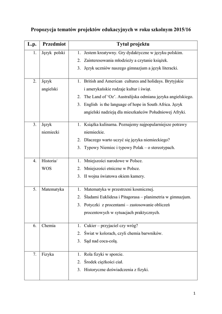 Propozycja tematów projektów edukacyjnych w roku szkolnym 2015/16 L.p. Przedmiot 1. Język polski Tytuł projektu 1. Jestem kreatywny. Gry dydaktyczne w języku polskim. 2. Zainteresowania młodzieży a czytanie książek. 3. Język uczniów naszego gimnazjum a język literacki. 2. Język angielski 1. British and American cultures and holidays. Brytyjskie i amerykańskie rodzaje kultur i świąt. 2. The Land of ‘Oz’. Australijska odmiana języka angielskiego. 3. English is the language of hope in South Africa. Język angielski nadzieją dla mieszkańców Południowej Afryki. 3. Język niemiecki 1. Książka kulinarna. Poznajemy najpopularniejsze potrawy niemieckie. 2. Dlaczego warto uczyć się języka niemieckiego? 3. Typowy Niemiec i typowy Polak – o stereotypach. 4. Historia/ 1. Mniejszości narodowe w Polsce. WOS 2. Mniejszości etniczne w Polsce. 3. II wojna światowa okiem kamery. 5. 6Matematyka 1. Matematyka w przestrzeni kosmicznej. 2. Śladami Euklidesa i Pitagorasa – planimetria w gimnazjum. 3. Potyczki z procentami – zastosowanie obliczeń procentowych w sytuacjach praktycznych. 6. Chemia 1. Cukier – przyjaciel czy wróg? 2. Świat w kolorach, czyli chemia barwników. 3. Sąd nad coca-colą. 7. Fizyka 1. Rola fizyki w sporcie. 2. Środek ciężkości ciał. 3. Historyczne doświadczenia z fizyki. 1 8. Biologia 1. Chemia w kuchni – tajemnicze E. 2. „Jedzenie ma znaczenie” – sposób odżywiania a nasze zdrowie. 3. Czy rośliny mogą leczyć? Co wiemy o ziołolecznictwie. 9. Geografia 1. Rekordowe obiekty geograficzne w Polsce. 2. W jaki sposób zareklamujesz swój region koledze z zagranicy? 3. Ekstremalne zjawiska pogodowe na świecie. 10. Technika 1. Podstawowe układy elektroniczne. 2. Własnoręczna budowa narzędzi domowego użytku. 3. Zastosowanie techniki w przemyśle. 11. Plastyka 1. Mniejszości etniczne w folklorze regionu rzeszowskiego. 2. Teatr dworski i muzykalia w łańcuckim zamku. 3. Jestem pod wpływem instytucji kulturalnych działających przy Ośrodku Kultury w Głuchowie. 12. Muzyka 1. Międzynarodowe Kursy Mistrzowskie w Łańcucie. 2. Jestem odbiorcą różnych rodzajów muzyki dawnej i współczesnej. 3. Muzyka młodzieżowa w świecie ucznia. 13. Wychowanie fizyczne 1. Gazetki szkolne, informacje, projekcje multimedialne jako forma propagowania sportu i rekreacji. 2. Szkolne imprezy sportowe, turnieje, zawody jako forma rozwoju aktywności fizycznej. 3. Wpływ właściwego odżywiania i aktywności fizycznej na nasze zdrowie. 2