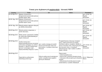 Tematy prac dyplomowych magisterskich – kierunek MiBM Nr pracy Temat Cel Zakres Prowadzący 001/I8/Mgr/2013 Badanie sił skrawania i chropowatości powierzchni podczas obróbki stopów niklu 002/I8/ Mgr /2013 Badanie sił skrawania i chropowatości powierzchni podczas obróbki stopów tytanu. prof. dr hab. inż. Bogdan Kruszyński 003/I8/ Mgr /2013 Metody pomiaru naprężeń własnych po obróbce skrawaniem. prof. dr hab. inż. Bogdan Kruszyński prof. dr hab. inż. Bogdan Kruszyński prof. dr hab. inż. Bogdan Kruszyński 004/I8/Mgr/2013 Metody pomiaru temperatury w strefie skrawania.. 002/I8/Mgr/2013 Dobór ścienic i parametrów obróbki do szlifowania trudnoobrabialnych stopów lotniczych 005/I8/Mgr/2013 prof. dr hab. inż. Bogdan Kruszyński Analiza teoretyczna i eksperymentalna procesu tworzenia opis i analiza istniejących modeli wióra (praca polegająca na analizie procesu powstawania wióra oraz literatury w zakresie modelowania porównanie z wynikami obserwacji procesu i zawierająca część własnych. eksperymentalną) mogą być 2 prace. 006/I8/Mgr/2013 Napęd główny półautomatu tokarskiego pionowego Przegląd literatury dotyczący tematyki pracy, analiza porównawcza modeli, określenia wpływu warunków obróbki na prof. dr hab. inż. proces tworzenia wióra, obserwacja procesu Bogdan powstawania wióra w warunkach Kruszyński laboratoryjnych. Opis i analiza wyników badań, wnioski. Opracowanie: - założeń projektowych, Nabycie praktycznych umiejętności - opracowanie schematu kinematycznego, dr inż. Małgorzata analizy i projektowania napędów - wykonanie obliczeń głównych elementów Sikora głównych obrabiarek zespołu, - dokumentacji konstrukcyjnej (rysunek zestawieniowy i rysunki wskazanych 007/I8/Mgr/2013 Projekt napędu wrzeciennika ściernicy szlifierki kłowej wcinającej 008/I8/Mgr/2013 Projekt napędu wrzeciennika przedmiotu szlifierki kłowej wcinającej 009/I8/Mgr/2013 Projekt suportu z napędem i łożem uchwytowej tokarki czołowej CNC o średnicy toczenia do 350 mm. 010/I8/Mgr/2013 Projekt napędu głównego i posuwowego do małego centrum tokarskiego o średnicy toczenia do 100 mm. 011/I8/Mgr/2013 Projekt podajnika z magazynem na 40 narzędzi do centrum wytaczarsko-frezarskiego o wymiarach stołu 200 x 200 mm2. części). W pracy należy wykonać: - przegląd literatury w zakresie aktualnego Celem pracy jest nabycie stanu wiedzy w realizowanym tematu, praktycznych umiejętności - opracowanie danych wejściowych i mgr inż. Stanisław projektowania na przekładzie założeń do konstrukcji, Sucharzewski konstrukcji wrzeciennika ściernicy - niezbędne obliczenia zespołu szlifierki kłowej wcinające napędowego, wrzecionowego i napędu posuwu,, - projekt konstrukcyjny. W pracy należy wykonać: - przegląd literatury w zakresie aktualnego Celem pracy jest nabycie stanu wiedzy w realizowanym tematu, praktycznych umiejętności - opracowanie danych wejściowych i mgr inż. Stanisław projektowania na przekładzie założeń do konstrukcji, Sucharzewski konstrukcji wrzeciennika przedmiotu - niezbędne obliczenia zespołu napędowego szlifierki kłowej wcinającej. - wrzecionowego - projekt konstrukcyjny. prof. dr inż. F. Oryński prof. dr inż. F. Oryński prof. dr inż. F. Oryński 012/I8/Mgr/2013 Projekt wrzeciennika uproszczonej wiertarki promieniowej o średnicy wiercenia do 30 mm. prof. dr inż. F. Oryński 013/I8/Mgr/2013 Projekt jednostki wiertarsko- prof. dr inż. F. szlifierskiej do otworów o maksymalnej średnicy 20 mm. 014/I8/Mgr/2013 Zapoznanie studenta z metodami pomiaru dokładności kinematycznej Opracować i przeprowadzić pomiar przekładni zębatych, pomiar dokładności kinematycznej z dokładności kinematycznej wykorzystaniem metody polegającej przekładni zębatej. na pomiarze odchyłek kąta obrotu przy pełnym cyklu zmiany wzajemnego położenia obu kół. Oryński Analiza literatury, zapoznanie się ze sposobami pomiaru dokładności kinematycznej przekładni zębatych, złożenie stanowiska do pomiaru, pomiar dokładności kinematycznej przekładni, analiza i opracowanie wyników pomiaru Wykonanie modelu 3D koła zębatego z użyciem programu typu CAD. Wykonanie dokumentacji technicznej (wykonawczej). Projekt procesu technologicznego Nabycie umiejętności opracowania Zaprojektowanie procesu dla koła zębatego o zadanych procesu technologicznego dla części technologicznego dla koła zębatego. parametrach wraz z oceną typu koło zębate oraz sprawdzenia Sprawdzenie dokładności wymiarowodokładności jego wytworzenia dokładności wytworzenia koła. kształtowej koła zębatego wytworzonego na podstawie zaproponowanego procesu technologicznego. 016/I8/Mgr/2013 Przegląd rozwiązań konstrukcyjnych stanowisk do pomiaru chropowatości powierzchni. Wykonanie dokumentacji technicznej Zaprojektowanie i wykonanie autorskiej konstrukcji. modernizacji stanowiska do pomiaru Modernizacja stanowiska do chropowatości powierzchni z Zaprojektowanie procesu pomiaru chropowatości powierzchni wykorzystaniem profilometru technologicznego dla wybranych Hommel T500. elementów stanowiska. Wykonanie stanowiska. Sprawdzenie stanowiska poprzez pomierzenie wzorców. 017/I8/Mgr/2013 Wpływ warunków obróbki podczas Określenie wpływu wybranych Analiza literatury dotycząca tematyki dr inż, D. Ostrowski 015/I8/Mgr/2013 dr inż. W. Stachurski dr inż. W. Stachurski dr inż. toczenia płytkami z narożem Wiper warunków obróbki na wielkości pracy. W. Stachurski na chropowatość i siły skrawania wyjściowe procesu – chropowatość i Określenie metodyki badań wraz z siły skrawania. opisem stanowisk badawczych. Określenie warunków badań i przeprowadzenie pomiarów. Opracowanie wyników badań, wnioski. Analiza literatury dotycząca tematyki Określenie wpływu zużycia ostrza pracy. Wpływ zużycia ostrza skrawającego skrawającego podczas toczenia Określenie metodyki badań wraz z podczas toczenia płytkami z płytkami 