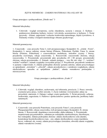 JĘZYK NIEMIECKI – ZAKRES MATERIAŁU DLA KLASY III Grupy pracujące z podręcznikiem „Direkt neu” 3 Materiał leksykalny: 1. Człowiek– wygląd zewnętrzny, cechy charakteru, uczucia i emocje. 2. Kultura – podstawowe dziedziny kultury, twórcy i ich dzieła, uczestnictwo w kulturze. 3. Świat przyrody – klimat, zagrożenie i ochrona środowiska naturalnego, klęski żywiołowe. 4. Elementy wiedzy o krajach niemieckiego obszaru językowego. Materiał gramatyczny: 1. Czasownik – czas przyszły Futur I, tryb przypuszczający Konjunktiv II, „würde –Form”, Konjunktiv I, mowa zależna, strona bierna (Präsens, Präteritum, Perfekt, Futur I), strona bierna (Präsens, Präteritum) z czasownikiem modalnym, imiesłów czynny i bierny, przydawka rozwinięta, rekcja czasownika. 2. Rzeczownik: rzeczowniki złożone, rekcja rzeczownika. 3. Przymiotnik: przymiotnik jako przydawka (II i III przyp), przymiotniki złożone, rekcja przymiotnika. 4. Zaimek: zaimek pytający – was für ein/ eine/ -? , welcher? welche? welches?, zaimek względny (wszystkie przyp.) 5. Przysłówek: przysłówki zaimkowe w pytaniu i odpowiedzi. 6. Zdanie podrzędnie złożone: pytania zależne, zdanie przyzwalające ze spójnikami: „trotzdem” i „obwohl”, zdanie przydawkowe z zaimkiem względnym, zdanie okolicznikowe sposobu ze spójnikiem „indem”, zdania warunkowe potencjalne i nierzeczywiste. Grupy pracujące z podręcznikiem „Exakt 3” Materiał leksykalny: 1. Człowiek: wygląd, charakter, zachowanie, styl ubierania, przeżycia. 2. Praca: zawody, czynności przy pracy, wybór zawodu. 3. Zycie rodzinne i towarzyskie: plany na przyszłość, marzenia. 4. Zakupy i usługi: części garderoby. 5. Świat przyrody: ochrona środowiska, zagrożenia. 6. Państwo i społeczeństwo: pomoc społeczna, problemy ludzi samotnych. Materiał gramatyczny: 1. Czasownik: czas przeszły Prateritum, czas przyszły Futur I, czas przeszły Plusquamperfekt, rekcja czasownika, tryb przypuszczający Konjunktiv II, strona bierna. 2. Rzeczownik: dopełniacz rzeczownika, słaba odmiana. 3. Przymiotnik: stopniowanie przymiotników, odmiana po rodzajniku nieokreślonym, określonym, bez rodzajnika. Zdania podrzędnie złożone: zdanie okolicznikowe celu (damit), konstrukcja bezokolicznikowa (um…zu), zdanie okolicznikowe czasu (nachdem, bevor, wahrend, als, wenn), zdania przyzwalające (trotzdem, obwohl) zdanie względne, zdanie warunkowe (wenn).