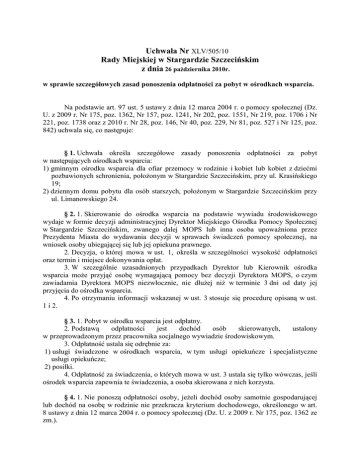 Uchwała Nr XLV/505/10 Rady Miejskiej w Stargardzie Szczecińskim z dnia 26 października 2010r. w sprawie szczegółowych zasad ponoszenia odpłatności za pobyt w ośrodkach wsparcia. Na podstawie art. 97 ust. 5 ustawy z dnia 12 marca 2004 r. o pomocy społecznej (Dz. U. z 2009 r. Nr 175, poz. 1362, Nr 157, poz. 1241, Nr 202, poz. 1551, Nr 219, poz. 1706 i Nr 221, poz. 1738 oraz z 2010 r. Nr 28, poz. 146, Nr 40, poz. 229, Nr 81, poz. 527 i Nr 125, poz. 842) uchwala się, co następuje: § 1. Uchwała określa szczegółowe zasady ponoszenia odpłatności za pobyt w następujących ośrodkach wsparcia: 1) gminnym ośrodku wsparcia dla ofiar przemocy w rodzinie i kobiet lub kobiet z dziećmi pozbawionych schronienia, położonym w Stargardzie Szczecińskim, przy ul. Krasińskiego 19; 2) dziennym domu pobytu dla osób starszych, położonym w Stargardzie Szczecińskim przy ul. Limanowskiego 24. § 2. 1. Skierowanie do ośrodka wsparcia na podstawie wywiadu środowiskowego wydaje w formie decyzji administracyjnej Dyrektor Miejskiego Ośrodka Pomocy Społecznej w Stargardzie Szczecińskim, zwanego dalej MOPS lub inna osoba upoważniona przez Prezydenta Miasta do wydawania decyzji w sprawach świadczeń pomocy społecznej, na wniosek osoby ubiegającej się lub jej opiekuna prawnego. 2. Decyzja, o której mowa w ust. 1, określa w szczególności wysokość odpłatności oraz termin i miejsce dokonywania opłat. 3. W szczególnie uzasadnionych przypadkach Dyrektor lub Kierownik ośrodka wsparcia może przyjąć osobę wymagającą pomocy bez decyzji Dyrektora MOPS, o czym zawiadamia Dyrektora MOPS niezwłocznie, nie dłużej niż w terminie 3 dni od daty jej przyjęcia do ośrodka wsparcia. 4. Po otrzymaniu informacji wskazanej w ust. 3 stosuje się procedurę opisaną w ust. 1 i 2. § 3. 1. Pobyt w ośrodku wsparcia jest odpłatny. 2. Podstawą odpłatności jest dochód osób skierowanych, ustalony w przeprowadzonym przez pracownika socjalnego wywiadzie środowiskowym. 3. Odpłatność ustala się odrębnie za: 1) usługi świadczone w ośrodkach wsparcia, w tym usługi opiekuńcze i specjalistyczne usługi opiekuńcze; 2) posiłki. 4. Odpłatność za świadczenia, o których mowa w ust. 3 ustala się tylko wówczas, jeśli ośrodek wsparcia zapewnia te świadczenia, a osoba skierowana z nich korzysta. § 4. 1. Nie ponoszą odpłatności osoby, jeżeli dochód osoby samotnie gospodarującej lub dochód na osobę w rodzinie nie przekracza kryterium dochodowego, określonego w art. 8 ustawy z dnia 12 marca 2004 r. o pomocy społecznej (Dz. U. z 2009 r. Nr 175, poz. 1362 ze zm.). 2. Nie pobiera się odpłatności za nieobecność uczestnika w całym miesiącu kalendarzowym. 3. W przypadku pobytu w ośrodku wsparcia przez niepełny miesiąc do określenia wysokości odpłatności stosuje się następujące wyliczenie: 1) kwota odpłatności podzielona przez liczbę dni w miesiącu równa jest kosztowi osobodnia pobytu w ośrodku wsparcia; 2) koszt jednego osobodnia pomnożony przez liczę dni przebywania w miesiącu w ośrodku wsparcia równa się faktycznej wysokości opłaty. § 5. 1. Odpłatność za pobyt ponoszą osoby, których dochód na osobę w rodzinie lub dochód osoby samotnie gospodarującej przekracza kwotę kryterium dochodowego, o którym mowa w § 4 ust 1. 2. Miesięczną wysokość odpłatności za pobyt w ośrodku wsparcia osób wskazanych w ust. 1, ustala się procentowo od kwoty bazowej zgodnie z tabelą: Dochód (% kryterium Wysokość odpłatności dla osób Wysokość odpłatności za osobę dochodowego) samotnie gospodarującychw gospodarstwach wieloosobowych do 100% Nieodpłatnie Nieodpłatnie od 100% do 120% 35% 15% od 121% do 140% 45% 25% od 141% do 160% 55% 35% od 161% do 180% 65% 45% od 181% do 200% 75% 55% od 201% do 220% 85% 65% od 221% do 240% 95% 75% od 241% do 260% 100% 85% od 261% do 280% 100% 95% powyżej 281% 100% 100% 3. Różnicą między ustaloną odpłatnością, ponoszoną przez osoby za pobyt w gminnym ośrodku wsparcia dla ofiar przemocy w rodzinie i kobiet lub kobiet z dziećmi pozbawionych schronienia, a średnim miesięcznym kosztem utrzymania obciąża się budżet Miasta. 4. Różnicą między ustaloną odpłatnością, ponoszoną przez osoby za pobyt w dziennym domu pobytu dla osób starszych, a średnim miesięcznym kosztem utrzymania obciąża się w kolejności: małżonka osoby przebywającej w ośrodku wsparcia, zstępnych przed jego wstępnymi, budżet Miasta. 5. Dyrektor MOPS ustala w drodze umowy z małżonkiem, zstępnymi przed wstępnymi wysokość wnoszonej przez nich odpłatności, o której mowa w ust. 4. 6. W przypadku niewywiązywania się osób, o których mowa w ust. 4, z obowiązku odpłatności za pobyt w dziennym domu pobytu dla osób starszych, odpłatność tę zastępczo wnosi Gmina - Miasto Stargard Szczeciński. Gminie - Miastu przysługuje prawo dochodzenia zwrotu poniesionych na ten cel wydatków, z zastrzeżeniem ust. 7. 7. Prawo dochodzenia zwrotu poniesionych wydatków, o których mowa w ust. 6, w imieniu Gminy - Miasta Stargard Szczeciński przysługuje również Dyrektorowi MOPS. 8. Osoby, o których mowa w ust. 4 można zwolnić, na ich wniosek, częściowo lub całkowicie z odpłatności za ośrodek wsparcia, w szczególności jeżeli ściągnięcie należności zagraża ich egzystencji. § 6. 1. Kwota bazowa, o której mowa w § 5 ust. 2 ustalana jest przez Prezydenta Miasta dla każdego ośrodka wsparcia osobno. 2. Kwotę bazową, o której mowa w ust. 1, ustala się na podstawie rzeczywistych kosztów poniesionych w roku poprzedzającym rok, w którym dokonuje się wyliczeń, obejmujących koszty: 1) konsultacji specjalistycznych; 2) środków higieny osobistej i środków czystości; 3) mediów (C.O., woda, energia elektryczna); 4) administracyjne. 3. Kwota bazowa podlega corocznej aktualizacji na podstawie analizy kosztów za rok poprzedzający ustalenie odpłatności. Aktualizacji kwoty bazowej dokonuje