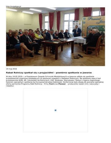 http://mojekgw.pl 19 maj 2016 Rabat Rolniczy spotkał się z przyjaciółmi - powtórne spotkanie w Jaworze W dniu 18.05.2016 r. w Powiatowym Zespole Schronisk Młodzieżowych w Jaworze odbyło się spotkanie przedstawicieli organizacji działających na obszarach wiejskich z Rabatem Rolniczym. Na spotkaniu obecni byli przestawiciele KGW, KR, członkowie Izb Rolniczych, OSP, Wojtowie, Starostowie i Sołtysi z regionu legnickiego. Gościem specjalnym spotkania był Europoseł Jarosław Kalinowski. Konfernecja była okazją do poznania specjalnej oferty partnerów Programu Rabt Roilniczy - firmy Ford oraz Pioneer - producenta nasion (min. kukurydzy i rzepaku). Dyrektor Rabatu Rolniczego Jan Boczek wraz z p. Ewą Florczak (Ford Leszno) przedstawiają specjalną ofertę Forda w Programie Rabat Rolniczy. Dyrektir Jan Boczek i p. Michał Ksiądzyna rozmawiają o szerokiej ofercie firmy Pioneer. P. Michał Ksiądzyna, przedstawiciel Pioneer Polska na Dolny Śląsk (fot.Paweł Sasiela/dolny-slask24h.pl) Uczestnicy spotkania zasłuchani w ciekawym wystapieniu Przedstawiciela Pioneer Polska. (fot.Paweł Sasiela/dolny-slask24h.pl) Europosel Jarosław Kalinowski i Dyrektor Jan Boczek rozmawiają o sile polskiej wsi. Zgadzają się, że razem można więcej. Nazwisko szczęśliwca, który będzie jeździł samochód marki Ford z pełnym bakiem przez weekend odczytwali Europoseł Kalinowski oraz Dyrektor Jan Boczek. Sala była pełna entuzjazmu. (fot.Paweł Sasiela/dolny-slask24h.pl) (fot.Paweł Sasiela/dolny-slask24h.pl) Redakcja mojeKGW.pl ..