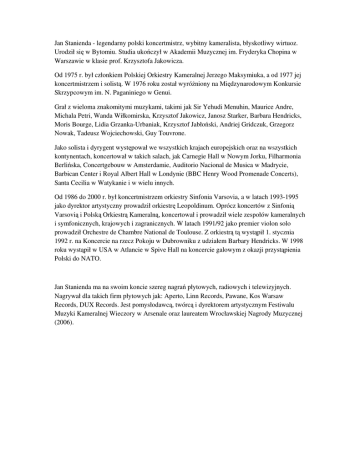 Jan Stanienda - legendarny polski koncertmistrz, wybitny kameralista, błyskotliwy wirtuoz. Urodził się w Bytomiu. Studia ukończył w Akademii Muzycznej im. Fryderyka Chopina w Warszawie w klasie prof. Krzysztofa Jakowicza. Od 1975 r. był członkiem Polskiej Orkiestry Kameralnej Jerzego Maksymiuka, a od 1977 jej koncertmistrzem i solistą. W 1976 roku został wyróżniony na Międzynarodowym Konkursie Skrzypcowym im. N. Paganiniego w Genui. Grał z wieloma znakomitymi muzykami, takimi jak Sir Yehudi Menuhin, Maurice Andre, Michala Petri, Wanda Wiłkomirska, Krzysztof Jakowicz, Janosz Starker, Barbara Hendricks, Moris Bourge, Lidia Grzanka-Urbaniak, Krzysztof Jabłoński, Andriej Gridczuk, Grzegorz Nowak, Tadeusz Wojciechowski, Guy Touvrone. Jako solista i dyrygent występował we wszystkich krajach europejskich oraz na wszystkich kontynentach, koncertował w takich salach, jak Carnegie Hall w Nowym Jorku, Filharmonia Berlińska, Concertgebouw w Amsterdamie, Auditorio Nacional de Musica w Madrycie, Barbican Center i Royal Albert Hall w Londynie (BBC Henry Wood Promenade Concerts), Santa Cecilia w Watykanie i w wielu innych. Od 1986 do 2000 r. był koncertmistrzem orkiestry Sinfonia Varsovia, a w latach 1993-1995 jako dyrektor artystyczny prowadził orkiestrę Leopoldinum. Oprócz koncertów z Sinfonią Varsovią i Polską Orkiestrą Kameralną, koncertował i prowadził wiele zespołów kameralnych i symfonicznych, krajowych i zagranicznych. W latach 1991/92 jako premier violon solo prowadził Orchestre de Chambre National de Toulouse. Z orkiestrą tą wystąpił 1. stycznia 1992 r. na Koncercie na rzecz Pokoju w Dubrowniku z udziałem Barbary Hendricks. W 1998 roku wystąpił w USA w Atlancie w Spive Hall na koncercie galowym z okazji przystąpienia Polski do NATO. Jan Stanienda ma na swoim koncie szereg nagrań płytowych, radiowych i telewizyjnych. Nagrywał dla takich firm płytowych jak: Aperto, Linn Records, Pawane, Kos Warsaw Records, DUX Records. Jest pomysłodawcą, twórcą i dyrektorem artystycznym Festiwalu Muzyki Kameralnej Wieczory w Arsenale oraz laureatem Wrocławskiej Nagrody Muzycznej (2006).