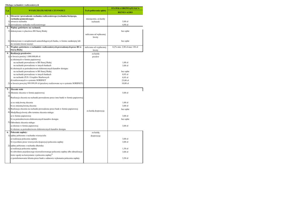 Obsługa rachunków rozliczeniowych WYSZCZEGÓLNIENIE CZYNNOŚCI L.p. 1. Otwarcie i prowadzenie rachunku rozliczeniowego (rachunku bieżącego, rachunku pomocniczego): 1) otwarcie rachunku 2) prowadzenie rachunku rozliczeniowego 2. Wpłaty gotówkowe na rachunek: Tryb pobierania opłaty miesięcznie, za każdy rachunek 1) dokonywane w placówce BS Starej Białej STAWKA OBOWIĄZUJĄCA BIZNES AGRO 5,00 zł 4,90 zł bez opłat naliczana od wpłacanej kwoty 2) dokonywane w urządzeniach samoobsługowych banku, w formie zamkniętej lub do wrzutni (trezor nocny) 3. Wypłaty gotówkowe z rachunków rozliczeniowych prowadzonych przez BS w Starej Białej 4. Realizacja przelewów: 1) w kwocie poniżej 1.000.000,00 zł: a) złożonych w formie papierowej: na rachunki prowadzone w BS Starej Białej na rachunki prowadzone w innych bankach b) złożonych za pośrednictwem elektronicznych kanałów dostępu: na rachunki prowadzone w BS Starej Białej na rachunki prowadzone w innych bankach na rachunki ZUS i Urzędów Skarbowych d) realizowanych w systemie SORBNET 2) w kwocie powyżej 999.999,99 zł (przelewy realizowane są w systemie SORBNET) bez opłat naliczana od wypłacanej kwoty 0,2% min. 2,90 zł max 150 zł za każdy przelew 1,00 zł 3,00 zł bez opłat 0,95 zł 0,95 zł 25,00 zł 10,00 zł 5. Zlecenie stałe 1) Złożenie zlecenia w formie papierowej 2) Realizacja zlecenia na rachunki prowadzone przez inne banki w formie papierowej 5,00 zł a) ze stałą kwotą zlecenia b) ze zmienną kwotą zlecenia 3) Realizacja zlecenia na rachunki prowadzone przez bank w formie papierowej 4) Modyfikacja kwoty albo terminu zlecenia stałego: 1,00 zł 3,00 zł za każdą dyspozycję bez opłat 3,00 zł a) w formie papierowej b) za pośrednictwem elektronicznych kanałów dostępu bez opłat 5) Odwołanie zlecenia stałego: a) złożone w formie papierowej b) złożone za pośrednictwem elektronicznych kanałów dostępu 6. Polecenie zapłaty: 1) opłaty pobierane z rachunku wierzyciela: a) realizacja polecenia zapłaty b) wycofanie przez wierzyciela dyspozycji polecenia zapłaty 3,00 zł za każdą dyspozycję 3,00 zł 3,00 zł 2) opłaty pobierane z rachunku dłużnika: a) realizacja polecenia zapłaty b) odwołanie pojedynczego niezrealizowanego polecenia zapłaty albo aktualizacja 1,50 zł 3,00 zł treści zgody na korzystanie z polecenia zapłaty8) c) poinformowanie klienta przez bank o odmowie wykonania polecenia zapłaty 3,50 zł 7. Ustanowienie albo zmiana pełnomocnictwa do dysponowania rachunkiem za każdą dyspozycję 10,00 zł 8. Potwierdzenie czeku gotówkowego lub rozrachunkowego za każdą dyspozycję 7,00 zł 9. Wydanie czeku gotówkowego lub rozrachunkowego za każdą dyspozycję 1,00 zł za każdą dyspozycję 12,00 zł 10. Zgłoszenie i wykonanie zastrzeżenia/odwołania o utracie blankietów czekowych 11. Sporządzenie i wysłanie wyciągu bankowego: - 1) w formie papierowej: a) sporządzenie i odbiór wyciągu bankowego w placówce BS w Starej Białej prowadzącej rachunek b) sporządzenie i wysłanie wyciągu bankowego 2) poprzez elektroniczne kanały dostępu oraz na adres elektroniczny e-mail klienta 12. Sporządzenie, na wniosek klienta dodatkowego wyciągu bez opłat bez opłat bez opłat 0,5 zł za jeden wyciąg 1) Wysłanie za pośrednictwem poczty 2 zł od każdej wysyłki 13. Wydanie na wniosek Klienta: 1) opinii bankowej (z wyłączeniem oceny sytuacji ekonomiczno-finansowej) zaświadczenia stwierdzającego posiadanie rachunku rozliczeniowego z 2) określeniem wielkości obrotów i sald 14. Sporządzenie kopii: 1) wyciągu bankowego oraz historii rachunku: 40,00 zł za każde zaświadczenie 20,00 zł za każdy dokument 10,00 zł a) z bieżącego roku kalendarzowego 10,00 zł + po 5,00 zł za każdy poprzedni rok b) z lat poprzednich 2) pojedynczej dyspozycji złożonej przez klienta, gdy: a) klient określi datę dokonania operacji b) klient nie określi daty dokonania operacji 15. Realizacja tytułu wykonawczego oraz dokumentu mającego moc takiego dokumentu 16. Dokonanie blokady środków na rachunku rozliczeniowym na wniosek posiadacza rachunku 15,00 zł 25,00 zł za każdą dyspozycję ,50% kwoty zajętej (min 20 zł max 100 zł 10,00 zł za każdą blokadę 10,00 zł 17. Likwidacja rachunku rozliczeniowego 18. Uzyskanie na hasło telefonicznej informacji o stanie rachunku Wysłanie do klienta informacji o powstaniu zaległości z tytułu prowizji i opłat z 19. jednoczesnym wezwaniem do zapłaty Wysłanie do klienta informacji o powstaniu debetu niedopuszczalnego z 20. jednoczesnym wezwaniem do zapłaty 21. Obsługa dopuszczalnego salda debetowego 22. Usługa płatności masowych 1) opłata aktywacyjna za udostępnienie usługi płatności masowych 2) opłata za wpłatę na rachunek wirtualny 3) opłata za wydanie certyfikatu szyfrującego (ważnego 2 lata) 4) opłata za odnowienie certyfikatu szyfrującego na kolejne 2 lata 8) miesięcznie 10,00 zł 15,00 zł 25,00 zł Miesięcznie 5,00 zł jednorazowo za każdą wpłatę, pobierana zbiorczo raz dziennie nie dotyczy nie dotyczy za każdy certyfikat Opłata za aktualizację nie dotyczy klientów, dla których obowiązek aktualizacji wynika ze zmiany numeru rachunku przez BS w Starej Białej nie dotyczy nie dotyczy
