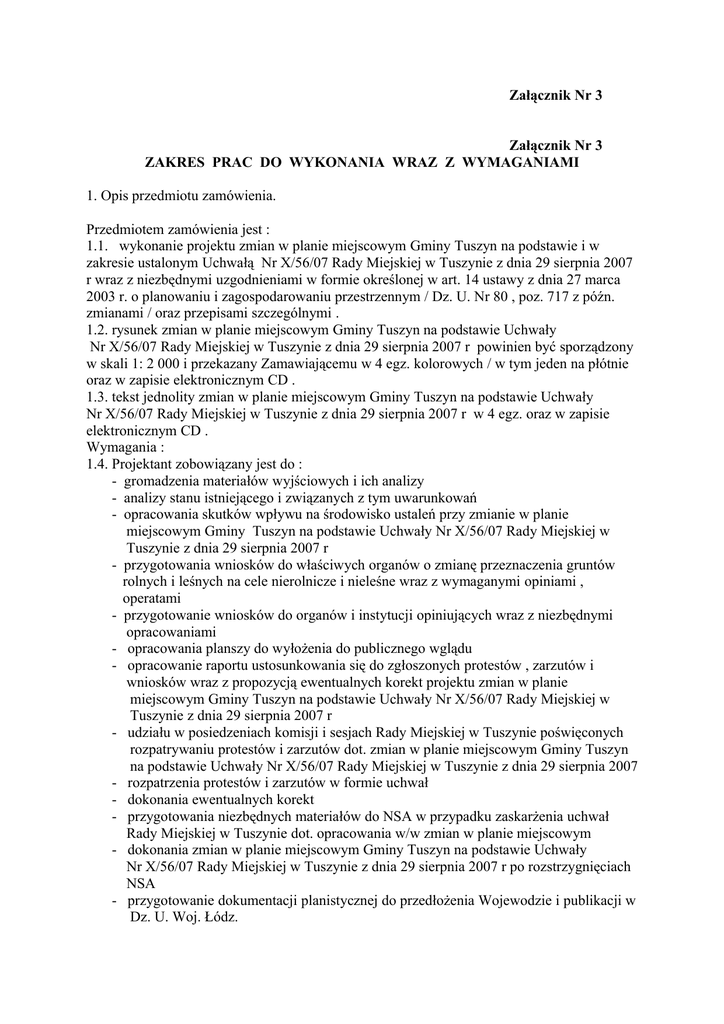Załącznik Nr 3 Załącznik Nr 3 ZAKRES PRAC DO WYKONANIA WRAZ Z WYMAGANIAMI 1. Opis przedmiotu zamówienia. Przedmiotem zamówienia jest : 1.1. wykonanie projektu zmian w planie miejscowym Gminy Tuszyn na podstawie i w zakresie ustalonym Uchwałą Nr X/56/07 Rady Miejskiej w Tuszynie z dnia 29 sierpnia 2007 r wraz z niezbędnymi uzgodnieniami w formie określonej w art. 14 ustawy z dnia 27 marca 2003 r. o planowaniu i zagospodarowaniu przestrzennym / Dz. U. Nr 80 , poz. 717 z późn. zmianami / oraz przepisami szczególnymi . 1.2. rysunek zmian w planie miejscowym Gminy Tuszyn na podstawie Uchwały Nr X/56/07 Rady Miejskiej w Tuszynie z dnia 29 sierpnia 2007 r powinien być sporządzony w skali 1: 2 000 i przekazany Zamawiającemu w 4 egz. kolorowych / w tym jeden na płótnie oraz w zapisie elektronicznym CD . 1.3. tekst jednolity zmian w planie miejscowym Gminy Tuszyn na podstawie Uchwały Nr X/56/07 Rady Miejskiej w Tuszynie z dnia 29 sierpnia 2007 r w 4 egz. oraz w zapisie elektronicznym CD . Wymagania : 1.4. Projektant zobowiązany jest do : - gromadzenia materiałów wyjściowych i ich analizy - analizy stanu istniejącego i związanych z tym uwarunkowań - opracowania skutków wpływu na środowisko ustaleń przy zmianie w planie miejscowym Gminy Tuszyn na podstawie Uchwały Nr X/56/07 Rady Miejskiej w Tuszynie z dnia 29 sierpnia 2007 r - przygotowania wniosków do właściwych organów o zmianę przeznaczenia gruntów rolnych i leśnych na cele nierolnicze i nieleśne wraz z wymaganymi opiniami , operatami - przygotowanie wniosków do organów i instytucji opiniujących wraz z niezbędnymi opracowaniami - opracowania planszy do wyłożenia do publicznego wglądu - opracowanie raportu ustosunkowania się do zgłoszonych protestów , zarzutów i wniosków wraz z propozycją ewentualnych korekt projektu zmian w planie miejscowym Gminy Tuszyn na podstawie Uchwały Nr X/56/07 Rady Miejskiej w Tuszynie z dnia 29 sierpnia 2007 r - udziału w posiedzeniach komisji i sesjach Rady Miejskiej w Tuszynie poświęconych rozpatrywaniu protestów i zarzutów dot. zmian w planie miejscowym Gminy Tuszyn na podstawie Uchwały Nr X/56/07 Rady Miejskiej w Tuszynie z dnia 29 sierpnia 2007 - rozpatrzenia protestów i zarzutów w formie uchwał - dokonania ewentualnych korekt - przygotowania niezbędnych materiałów do NSA w przypadku zaskarżenia uchwał Rady Miejskiej w Tuszynie dot. opracowania w/w zmian w planie miejscowym - dokonania zmian w planie miejscowym Gminy Tuszyn na podstawie Uchwały Nr X/56/07 Rady Miejskiej w Tuszynie z dnia 29 sierpnia 2007 r po rozstrzygnięciach NSA - przygotowanie dokumentacji planistycznej do przedłożenia Wojewodzie i publikacji w Dz. U. Woj. Łódz. - poniesienia wszelkich kosztów związanych z wykonaniem w/w czynności 2. Termin wykonania zamówienia: 20 maja 2008 r. 3. Wykaz dokumentów wymaganych jako załączniki do oferty: 3.1 Aktualny odpis z właściwego rejestru albo aktualne zaświadczenie o wpisie do ewidencji działalności gospodarczej 3.2 Oświadczenie z art. 22 ust. 1-4 ustawy Prawo zamówień publicznych sporządzone według wzoru stanowiącego załącznik nr 2; 4. Opis sposobu obliczenia ceny. 4.1 Podana w ofercie ryczałtowa cena ofertowa musi uwzględniać wszystkie wymagania oraz obejmować wszelkie koszty, jakie poniesie wykonawca z tytułu należytej oraz zgodnej z obowiązującymi przepisami realizacji przedmiotu zamówienia. 4.2 Oferent powinien przewidzieć wszystkie okoliczności, które mogą wpłynąć na cenę jego oferty. 4.3 Cena podana w ofercie powinna obejmować wszystkie koszty i składniki związane z wykonaniem zamówienia, musi być podana w PLN cyfrowo i słownie, z wyodrębnieniem należnego podatku VAT ( z zaokrągleniem do dwóch miejsc po przecinku ). Cena może być tylko jedna. 4.4. Zamawiający zawrze z wybranym Projektantem umowę ryczałtową na wykonanie przedmiotu zamówienia w rozumieniu art. 632 kc. 5. Miejsce oraz termin składania i otwarcia ofert. 5.1 Ofertę należy złożyć w siedzibie Zamawiającego w Urzędzie Miasta w Tuszynie ul.Piotrkowska 2/4 , pokój nr 1 – sekretariat w nieprzekraczalnym terminie: do dnia 09.07.2007r. do godz. 1500. 5.2 Ofertę należy złożyć w nieprzezroczystej, zabezpieczonej przed otwarciem kopercie (paczce). Kopertę (paczkę) należy opisać następująco: Urząd Miasta w Tuszynie ul. Piotrkowska 2/4 95 – 080 Tuszyn Oferta na : zmiana w planie miejscowym Gminy Tuszyn na podstawie Uchwały Nr X/56/07 Rady Miejskiej w Tuszynie z dnia 29 sierpnia 2007 r 5.3 Na kopercie(paczce) oprócz opisu jw. należy umieścić nazwę i adres Projektanta. 6. Kryteria wyboru wykonawcy prac planistycznych : - cena 100 % 7. Wykaz dokumentów składających się na ofertę: 2 1. Wypełniony formularz ofertowy 2. Dokumenty wymienione w pkt. 3 ( od 3.1 do 3.2) 8. Załączniki : 1. Formularz ofertowy – załącznik Nr 1 2. Oświadczenie art. 22 ust 1-4 ustawy Prawo Zamówień Publicznych – załącznik Nr 2 3. Wzór umowy – załącznik Nr 4 3