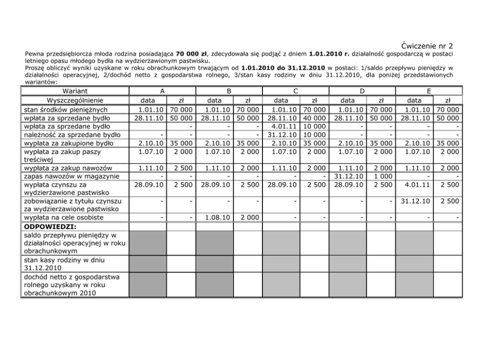 Ćwiczenie nr 2 Pewna przedsiębiorcza młoda rodzina posiadająca 70 000 zł, zdecydowała się podjąć z dniem 1.01.2010 r. działalność gospodarczą w postaci letniego opasu młodego bydła na wydzierżawionym pastwisku. Proszę obliczyć wyniki uzyskane w roku obrachunkowym trwającym od 1.01.2010 do 31.12.2010 w postaci: 1/saldo przepływu pieniędzy w działalności operacyjnej, 2/dochód netto z gospodarstwa rolnego, 3/stan kasy rodziny w dniu 31.12.2010, dla poniżej przedstawionych wariantów: Wariant Wyszczególnienie stan środków pieniężnych wpłata za sprzedane bydło wpłata za sprzedane bydło należność za sprzedane bydło wypłata za zakupione bydło wypłata za zakup paszy treściwej wypłata za zakup nawozów zapas nawozów w magazynie wypłata czynszu za wydzierżawione pastwisko zobowiązanie z tytułu czynszu za wydzierżawione pastwisko wypłata na cele osobiste ODPOWIEDZI: saldo przepływu pieniędzy w działalności operacyjnej w roku obrachunkowym stan kasy rodziny w dniu 31.12.2010 dochód netto z gospodarstwa rolnego uzyskany w roku obrachunkowym 2010 A B C D E data zł 1.01.10 70 000 28.11.10 50 000 2.10.10 35 000 1.07.10 2 000 data zł 1.01.10 70 000 28.11.10 50 000 2.10.10 35 000 1.07.10 2 000 data 1.01.10 28.11.10 4.01.11 31.12.10 2.10.10 1.07.10 zł 70 000 40 000 10 000 10 000 35 000 2 000 data zł 1.01.10 70 000 28.11.10 50 000 2.10.10 35 000 1.07.10 2 000 data zł 1.01.10 70 000 28.11.10 50 000 2.10.10 35 000 1.07.10 2 000 1.11.10 28.09.10 2 500 2 500 1.11.10 28.09.10 2 000 2 500 1.11.10 28.09.10 2 000 2 500 1.11.10 31.12.10 28.09.10 2 000 1 000 2 500 1.11.10 4.01.11 2 000 2 500 - - - - - - - - 31.12.10 2 500 - - 1.08.10 2 000 - - - - - -