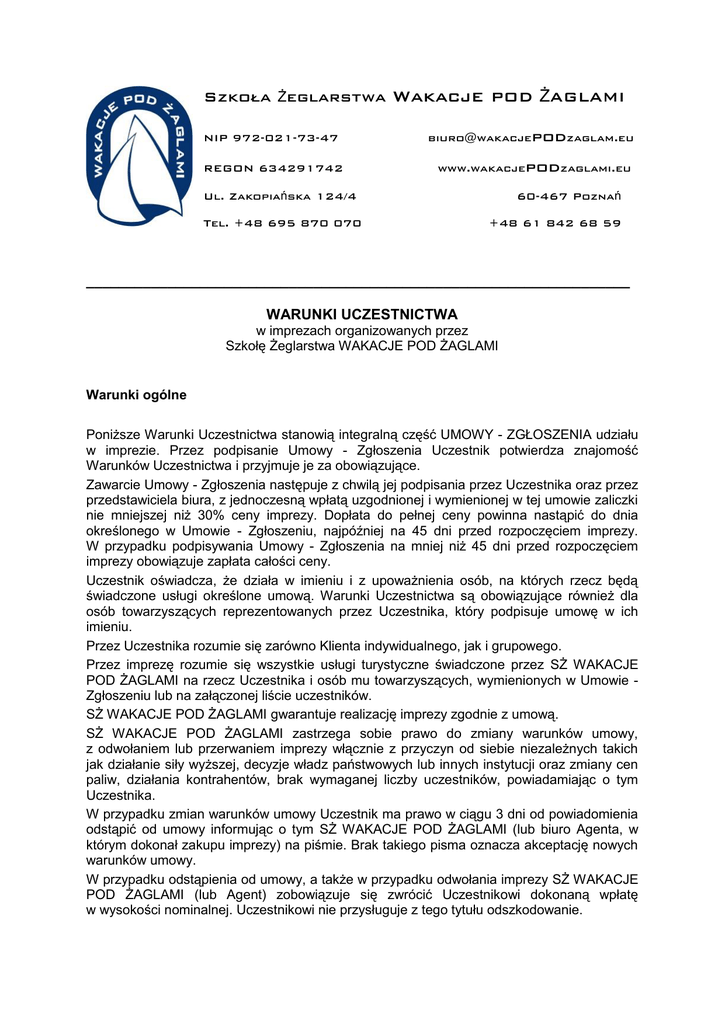 Szkoła Żeglarstwa WakacjE POD ŻAGLAMI NIP 972-021-73-47 [email protected] REGON 634291742 www.wakacjepodzaglami.eu Ul. Zakopiańska 124/4 Tel. +48 695 870 070 60-467 Poznań +48 61 842 68 59 ___________________________________________________________________ WARUNKI UCZESTNICTWA w imprezach organizowanych przez Szkołę Żeglarstwa WAKACJE POD ŻAGLAMI Warunki ogólne Poniższe Warunki Uczestnictwa stanowią integralną część UMOWY - ZGŁOSZENIA udziału w imprezie. Przez podpisanie Umowy - Zgłoszenia Uczestnik potwierdza znajomość Warunków Uczestnictwa i przyjmuje je za obowiązujące. Zawarcie Umowy - Zgłoszenia następuje z chwilą jej podpisania przez Uczestnika oraz przez przedstawiciela biura, z jednoczesną wpłatą uzgodnionej i wymienionej w tej umowie zaliczki nie mniejszej niż 30% ceny imprezy. Dopłata do pełnej ceny powinna nastąpić do dnia określonego w Umowie - Zgłoszeniu, najpóźniej na 45 dni przed rozpoczęciem imprezy. W przypadku podpisywania Umowy - Zgłoszenia na mniej niż 45 dni przed rozpoczęciem imprezy obowiązuje zapłata całości ceny. Uczestnik oświadcza, że działa w imieniu i z upoważnienia osób, na których rzecz będą świadczone usługi określone umową. Warunki Uczestnictwa są obowiązujące również dla osób towarzyszących reprezentowanych przez Uczestnika, który podpisuje umowę w ich imieniu. Przez Uczestnika rozumie się zarówno Klienta indywidualnego, jak i grupowego. Przez imprezę rozumie się wszystkie usługi turystyczne świadczone przez SŻ WAKACJE POD ŻAGLAMI na rzecz Uczestnika i osób mu towarzyszących, wymienionych w Umowie Zgłoszeniu lub na załączonej liście uczestników. SŻ WAKACJE POD ŻAGLAMI gwarantuje realizację imprezy zgodnie z umową. SŻ WAKACJE POD ŻAGLAMI zastrzega sobie prawo do zmiany warunków umowy, z odwołaniem lub przerwaniem imprezy włącznie z przyczyn od siebie niezależnych takich jak działanie siły wyższej, decyzje władz państwowych lub innych instytucji oraz zmiany cen paliw, działania kontrahentów, brak wymaganej liczby uczestników, powiadamiając o tym Uczestnika. W przypadku zmian warunków umowy Uczestnik ma prawo w ciągu 3 dni od powiadomienia odstąpić od umowy informując o tym SŻ WAKACJE POD ŻAGLAMI (lub biuro Agenta, w którym dokonał zakupu imprezy) na piśmie. Brak takiego pisma oznacza akceptację nowych warunków umowy. W przypadku odstąpienia od umowy, a także w przypadku odwołania imprezy SŻ WAKACJE POD ŻAGLAMI (lub Agent) zobowiązuje się zwrócić Uczestnikowi dokonaną wpłatę w wysokości nominalnej. Uczestnikowi nie przysługuje z tego tytułu odszkodowanie. SŻ WAKACJE POD ŻAGLAMI odpowiada za prawidłowy, zgodny z programem przebieg imprezy oraz za umówioną jakość usług. Jeżeli z winy SŻ WAKACJE POD ŻAGLAMI nie zostaną zrealizowane określone umową usługi lub ich jakość będzie odbiegała od treści zawartej umowy, SŻ WAKACJE POD ŻAGLAMI zobowiązuje się do zorganizowania usług zastępczych lub zwrotu wartości usług niezrealizowanych. Jeżeli SŻ WAKACJE POD ŻAGLAMI zorganizuje dla Uczestnika usługi zastępcze, które mają wpływ na zmianę programu imprezy, ale mają porównywalny standard Uczestnik nie może domagać się obniżenia odpłatności za imprezę lub ekwiwalentu. Niewykorzystanie przez Uczestnika usług objętych programem z przyczyn leżących po jego stronie, nie stanowi podstawy do obniżenia odpłatności za imprezę lub żądania ekwiwalentu za niewykorzystane świadczenia. Warunki rezygnacji z imprezy Rezygnacja z udziału w imprezie może nastąpić wyłącznie w formie pisemnej. W przypadku nie zgłoszenia się na imprezę Uczestnikowi nie przysługuje zwrot poniesionych opłat. Koszty ponoszone przez Uczestnika w przypadku rezygnacji z przyczyn leżących po jego stronie: powyżej 40 dni przed terminem rozpoczęcia koszty manipulacyjne 100 zł od każdego uczestnika, do 40 dni przed terminem rozpoczęcia - 10% wartości zarezerwowanych usług, do 30 dni przed terminem rozpoczęcia - 30% wartości zarezerwowanych usług, do 14 dni przed terminem rozpoczęcia - 50% wartości zarezerwowanych usług, do 7 dni przed terminem rozpoczęcia - 100% wartości zarezerwowanych usług Postanowienia o rezygnacji obowiązują bez względu na datę zawarcia umowy. Odstępując od umowy Uczestnik ma prawo wskazać na swoje miejsce inną osobę. Wówczas ponosi jedynie koszty manipulacyjne. SŻ WAKACJE POD ŻAGLAMI może z własnej inicjatywy lub na wniosek Uczestnika odstąpić od naliczania kosztów rezygnacji lub kosztów manipulacyjnych. Od zwracanej zaliczki lub jej części pozostałej po potrąceniu kosztów rezygnacji Uczestnikowi nie przysługują odsetki. Warunki odpowiedzialności Uczestnik zobowiązany jest do przestrzegania regulaminów i innych przepisów obowiązujących w trakcie trwania imprezy, we wszystkich obiektach i środkach transportu. Uczestnik odpowiada za wszelkie szkody wyrządzone przez siebie lub osoby pozostające pod jego opieką opłacając odszkodowanie niezwłocznie po powstaniu szkód, nie później jednak niż w ciągu 14 dni od ich wyrządzenia. Uczestnik nie może sam dokonywać zmian w Umowie - Zgłoszeniu. Reklamacje dotyczące realizacji umowy należy składać na piśmie w siedzibie SŻ WAKACJE POD ŻAGLAMI najpóźniej 14 dni od zakończenia imprezy. Do reklamacji pod rygorem nieuwzględnienia należy dołączyć dokumentację dotyczącą złożonego zażalenia, potwierdzoną przez pilota imprezy, rezydenta lub administrację obiektu wypoczynkowego. SŻ WAKACJE POD ŻAGLAMI zobowiązuje się do rozpatrzenia reklamacji Uczestnika w ciągu 30 dni od daty jej złożenia. Nie mogą być przedmiotem roszczeń okoliczności powodujące niewygody lub utrudnienia znane Uczestnikowi przed rozpoczęciem imprezy lub wynikające ze zmian programu dopuszczanych przez Warunki Uczestnictwa i Umowę - Zgłoszenie. SŻ WAKACJE POD ŻAGLAMI nie ponosi odpowiedzialności z tytu