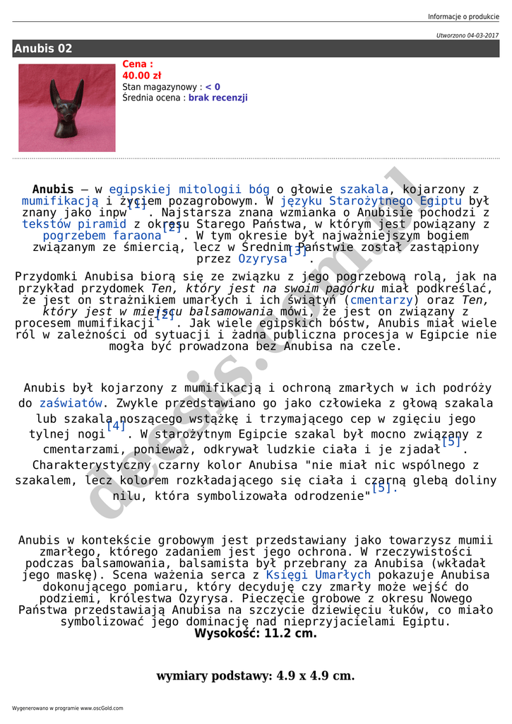 Informacje o produkcie Utworzono 04-03-2017 Anubis 02 Cena : 40.00 zł Stan magazynowy : < 0 Średnia ocena : brak recenzji m .p l Anubis – w egipskiej mitologii bóg o głowie szakala, kojarzony z mumifikacją i życiem pozagrobowym. W języku Starożytnego Egiptu był [1] znany jako inpw . Najstarsza znana wzmianka o Anubisie pochodzi z tekstów piramid z okresu [2] Starego Państwa, w którym jest powiązany z pogrzebem faraona . W tym okresie był najważniejszym bogiem związanym ze śmiercią, lecz w Średnim[3] Państwie został zastąpiony przez Ozyrysa . es is .c o Przydomki Anubisa biorą się ze związku z jego pogrzebową rolą, jak na przykład przydomek Ten, który jest na swoim pagórku miał podkreślać, że jest on strażnikiem umarłych i ich świątyń (cmentarzy) oraz Ten, który jest w miejscu [2] balsamowania mówi, że jest on związany z procesem mumifikacji . Jak wiele egipskich bóstw, Anubis miał wiele ról w zależności od sytuacji i żadna publiczna procesja w Egipcie nie mogła być prowadzona bez Anubisa na czele. de Anubis był kojarzony z mumifikacją i ochroną zmarłych w ich podróży do zaświatów. Zwykle przedstawiano go jako człowieka z głową szakala lub szakala noszącego wstążkę i trzymającego cep w zgięciu jego [4] tylnej nogi . W starożytnym Egipcie szakal był mocno związany z [5] cmentarzami, ponieważ, odkrywał ludzkie ciała i je zjadał . Charakterystyczny czarny kolor Anubisa "nie miał nic wspólnego z szakalem, lecz kolorem rozkładającego się ciała i czarną glebą doliny [5]. nilu, która symbolizowała odrodzenie" Anubis w kontekście grobowym jest przedstawiany jako towarzysz mumii zmarłego, którego zadaniem jest jego ochrona. W rzeczywistości podczas balsamowania, balsamista był przebrany za Anubisa (wkładał jego maskę). Scena ważenia serca z Księgi Umarłych pokazuje Anubisa dokonującego pomiaru, który decyduję czy zmarły może wejść do podziemi, królestwa Ozyrysa. Pieczęcie grobowe z okresu Nowego Państwa przedstawiają Anubisa na szczycie dziewięciu łuków, co miało symbolizować jego dominację nad nieprzyjacielami Egiptu. Wysokość: 11.2 cm. wymiary podstawy: 4.9 x 4.9 cm. Wygenerowano w programie www.oscGold.com de m .p l .c o es is