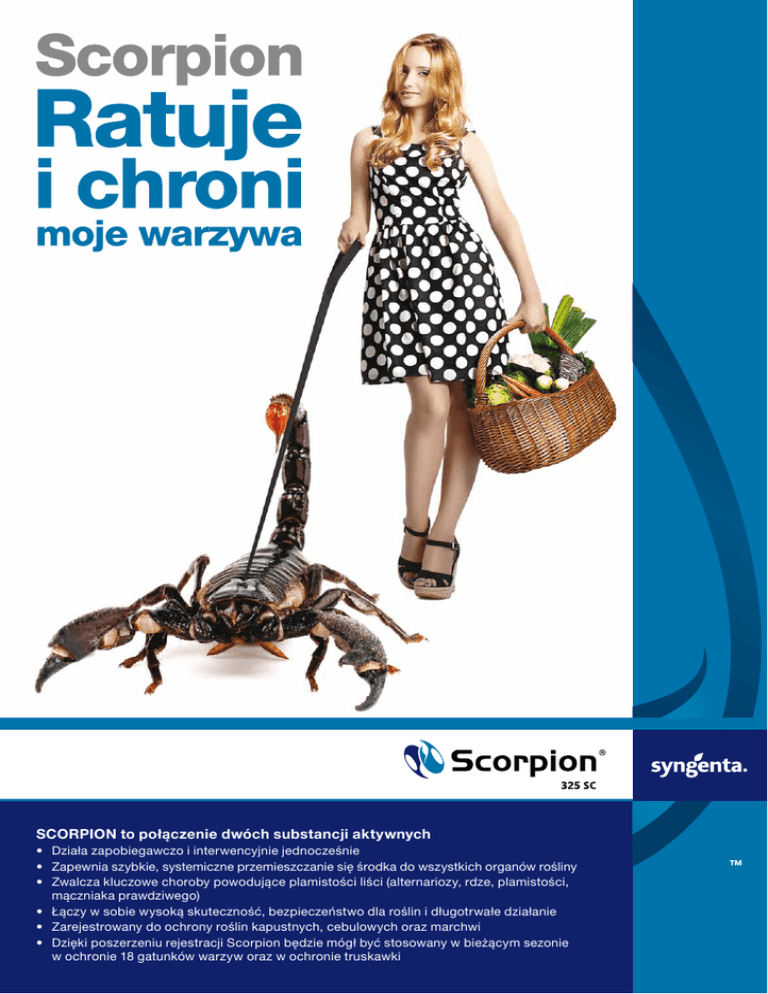 SCORPION to połączenie dwóch substancji aktywnych • Działa zapobiegawczo i interwencyjnie jednocześnie • Zapewnia szybkie, systemiczne przemieszczanie się środka do wszystkich organów rośliny • Zwalcza kluczowe choroby powodujące plamistości liści (alternariozy, rdze, plamistości, mączniaka prawdziwego) • Łączy w sobie wysoką skuteczność, bezpieczeństwo dla roślin i długotrwałe działanie • Zarejestrowany do ochrony roślin kapustnych, cebulowych oraz marchwi • Dzięki poszerzeniu rejestracji Scorpion będzie mógł być stosowany w bieżącym sezonie w ochronie 18 gatunków warzyw oraz w ochronie truskawki Scorpion – nowa jakość w ochronie warzyw Wyjątkowe działanie interwencyjne i zapobiegawcze Scorpion 325 SC jest przełomowym fungicydem w uprawach warzywniczych, przewyższającym dotychczasowe rozwiązania w zwalczaniu chorób zaliczanych do grupy tzw. plamistości liści. Scorpion ratuje Twój plon Scorpion, jako jeden z niewielu fungicydów, hamuje kiełkowanie zarodników oraz jednocześnie zatrzymuje już zaobserwowaną infekcję. Możliwe jest to dzięki zastosowaniu nowej w uprawach warzywniczych substancji aktywnej z grupy triazoli (difenokonazol). Scorpion zabezpiecza przed dalszym rozwojem choroby Preparat Scorpion opiera się na technologii Amistar, która hamuje transport elektronów w ramach oddychania mitochondrialnego najróżniejszych patogenicznych grzybów, przez co bardzo skutecznie kontroluje rozwój patogenu i działa zapobiegawczo. Jak działa Scorpion? Preparat jest szybko pobierany przez roślinę z powierzchni liści, następnie przemieszcza się systemicznie do wszystkich jej organów, co pozwala na skuteczną ochronę, niezależnie od dokładności pokrycia całej powierzchni rośliny. Choroba Scorpion Środki porównawcze VM S VM F1 VM F2 Alternariozy +++ +++ ++ ++ Mączniak prawdziwy +++ ++ +++ +++ Plamistość pierścieniowa +++ +++ ++ ++ Zgnilizna twardzikowa ++ ++ - + +++ +++ ++ ++ + + +++ - Rdze Bielik krzyżowych Wchłanianie środka (liść) 80% difenokonazol 60% 40% 20% 0 1 2 3 4 5 6 7 dni Główną zaletą tej substancji jest bardzo szybkie przemieszczanie się w roślinie, kilkakrotnie szybsze niż innych znanych substancji aktywnych. Difenokonazol hamuje tworzenie ściany komórkowej grzybów, działając przede wszystkim na ograniczenie wzrostu i tworzenie się grzybni. Spowalnia także kiełkowanie zarodników i zatrzymuje infekcję. Dlatego właśnie można go użyć nawet po wystąpieniu pierwszych objawów choroby. Scorpion wyróżnia również działanie interwencyjne – w okresie do 2 dni po pojawieniu się infekcji, co znacznie zwiększa skuteczność preparatu w zwalczaniu szerokiej palety chorób. Obecnie nie są jeszcze powszechnie dostępne systemy monitorujące ryzyko infekcji w uprawach warzywniczych, stąd podjęcie decyzji o zabiegu ochrony wymaga wiedzy na temat warunków sprzyjających rozwojowi patogenu oraz doświadczenia. Nawet jednorazowe zastosowanie preparatu Scorpion daje wyraźnie większe bezpieczeństwo i pewność, ponieważ pozwala na jednoczesne zahamowanie zaistniałej infekcji oraz – w okresie panowania warunków sprzyjających infekcji – zapobiega kolejnym. Scorpion dyniowate psiankowate szparagowate 2 3 2 3 3 2 8 14 8 8 8 8 14 14 7 12 14 10 10 8 8 14 21 21 21 14 14 21 21 21 21 14 14 14 7 14 3 3 7 3 n.d. fasola szparagowa 2 sałata w uprawie polowej 2 kalafior kapusta głowiasta kapusta brukselska kapusta włoska kapusta pekińska brokuł 2 2 2 2 2 2 seler 2 marchew ogórek uprawa polowa i pod osłonami strączkowe szparag liściowe kapustne 2 cebula szczypiorek por zwalczane choroby korzeniowe groch na zielone nasiona cebulowe papryka uprawa polowa i pod osłonami pomidor polowy pomidor pod osłonami – spektrum chronionych warzyw dawka 1 l/ha alternarioza rdza pora mączniak prawdziwy czarna zgnilizna marchwi plamistość pierścieniowa liści bielik krzyżowych zgnilizna twardzikowa mączniak rzekomy sałaty askochytoza parch dyniowatych brunatna plamistość liści zaraza ziemniaka rdza szparaga plamistość szparaga maksymalna liczba zabiegów w sezonie odstępy między zabiegami [dni] karencja [dni] 1 1 1 Scorpion chroni również plantacje truskawek przed antraknozą truskawki oraz białą plamistością liści. Maksymalna liczba zabiegów w sezonie wegetacyjnym: 3. Minimalny odstęp pomiędzy zabiegami: 7 dni. Karencja: 3 dni. Zalety środka Scorpion Scorpion – podwójne bezpieczeństwo! Połączenie technologii Amistar działającej głównie zapobiegawczo – z leczniczym komponentem triazolowym – difenokonazolem zapewnia skuteczne i długotrwałe działanie. Ponadto połączenie takie zmniejsza ryzyko powstawania uodpornionych na substancje czynne ras patogenu. Dzięki doskonałemu działaniu, niezależnemu od pogody, Scorpion to doskonałe rozwiązanie na wszystkie ważne choroby plamistości liści. Scorpion – optymalna formuła! Nowosc Scorpion jest koncentratem stężonej zawiesiny (SC), który jest łatwy w użyciu. Dzięki praktycznej dawce, niezależnej od gatunku – 1 l/ha, jego stosowanie jest bardzo proste. Substancje czynne: 200 g/l, azoksystrobina 125 g/l, difenokonazol Dawka: 1,0 l/ha Zalety: działanie interwencyjne i zapobiegawcze systemiczne przemieszczanie się obu substancji szybkie działanie szerokie spektrum zwalczanych chorób Scorpion to przełomowe rozwiązanie w ochronie upraw 18 gatunków warzyw. Szerokie spektrum zwalczanych chorób oraz działanie interwencyjne i zapobiegawcze to zalety, które doceni każdy producent. Syngenta Polska Sp. z o.o. ul. Powązkowska 44c, 01-797 Warszawa tel.: (22) 32 60 601, fax: (22) 32 60 699 Środki ochrony roślin odpowiedzialnie – bezpiecznie www.syngenta.pl/pl/odpowiedzialnosc Ze środków ochrony roślin należy korzystać z zachowaniem bezpieczeństwa. Przed każdym użyciem przeczytaj informacje zamieszczone na etykiecie i informacje dotyczące produktu. Zwróć uwagę na zwroty ws