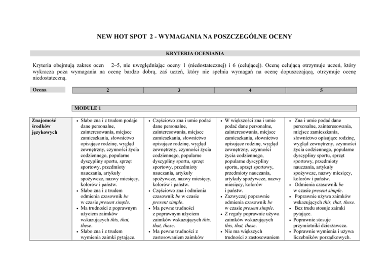 NEW HOT SPOT 2 - WYMAGANIA NA POSZCZEGÓLNE OCENY KRYTERIA OCENIANIA Kryteria obejmują zakres ocen 2‒5, nie uwzględniając oceny 1 (niedostatecznej) i 6 (celującej). Ocenę celującą otrzymuje uczeń, który wykracza poza wymagania na ocenę bardzo dobrą, zaś uczeń, który nie spełnia wymagań na ocenę dopuszczającą, otrzymuje ocenę niedostateczną. Ocena 2 3 4 5 MODULE 1 Znajomość środków językowych • • • • Słabo zna i z trudem podaje dane personalne, zainteresowania, miejsce zamieszkania, słownictwo opisujące rodzinę, wygląd zewnętrzny, czynności życia codziennego, popularne dyscypliny sportu, sprzęt sportowy, przedmioty nauczania, artykuły spożywcze, nazwy miesięcy, kolorów i państw. Słabo zna i z trudem odmienia czasownik be w czasie present simple. Ma trudności z poprawnym użyciem zaimków wskazujących this, that, these. Słabo zna i z trudem wymienia zaimki pytające. • • • • Częściowo zna i umie podać dane personalne, zainteresowania, miejsce zamieszkania, słownictwo opisujące rodzinę, wygląd zewnętrzny, czynności życia codziennego, popularne dyscypliny sportu, sprzęt sportowy, przedmioty nauczania, artykuły spożywcze, nazwy miesięcy, kolorów i państw. Częściowo zna i odmienia czasownik be w czasie present simple. Ma pewne trudności z poprawnym użyciem zaimków wskazujących this, that, these. Ma pewne trudności z zastosowaniem zaimków • • • • W większości zna i umie podać dane personalne, zainteresowania, miejsce zamieszkania, słownictwo opisujące rodzinę, wygląd zewnętrzny, czynności życia codziennego, popularne dyscypliny sportu, sprzęt sportowy, przedmioty nauczania, artykuły spożywcze, nazwy miesięcy, kolorów i państw. Zazwyczaj poprawnie odmienia czasownik be w czasie present simple. Z reguły poprawnie używa zaimków wskazujących this, that, these. Nie ma większych trudności z zastosowaniem • • • • • • Zna i umie podać dane personalne, zainteresowania, miejsce zamieszkania, słownictwo opisujące rodzinę, wygląd zewnętrzny, czynności życia codziennego, popularne dyscypliny sportu, sprzęt sportowy, przedmioty nauczania, artykuły spożywcze, nazwy miesięcy, kolorów i państw. Odmienia czasownik be w czasie present simple. Poprawnie używa zaimków wskazujących this, that, these. Bez trudu stosuje zaimki pytające. Poprawnie stosuje przymiotniki dzierżawcze. Poprawnie wymienia i używa liczebników porządkowych. • • • • • • Słuchanie Czytanie Słabo zna i z trudem stosuje przymiotniki dzierżawcze. Słabo zna i z trudem podaje liczebniki porządkowe. Słabo zna i z trudem odmienia czasownik have got w czasie present simple. Ma trudności z poprawnym użyciem czasownika can. Ma trudności z tworzeniem zdań i pytań w czasie present simple. Ma trudności z poprawnym użyciem czasowników like/love/hate + -ing. Ma trudności z właściwym reagowaniem na polecenia. • Ma trudności z rozumieniem znaczenia zwrotów dnia codziennego, pomimo pomocy nauczyciela. • Z trudem rozumie ogólny sens tekstu oraz intencje rozmówców, a także wyszukuje proste informacje szczegółowe, pomimo pomocy nauczyciela. • Ma trudności z rozumieniem tekstu czytanego, z trudem • pytających. Ma trudności z zastosowaniem przymiotników dzierżawczych. • Częściowo zna i z trudem podaje liczebniki porządkowe. • Częściowo zna i odmienia czasownik have got w czasie present simple. • Ma pewne trudności z poprawnym użyciem czasownika can. • Ma pewne trudności z tworzeniem zdań i pytań w czasie present simple. • Ma pewne trudności z poprawnym użyciem czasowników like/love/hate + -ing. • Częściowo właściwie reaguje na polecenia. • Częściowo rozumie znaczenie zwrotów dnia codziennego. • Częściowo rozumie ogólny sens tekstu oraz intencje rozmówców, a także wyszukuje proste informacje szczegółowe. • • Częściowo rozumie ogólny sens tekstu czytanego zaimków pytających. Z reguły poprawnie stosuje przymiotniki dzierżawcze. W większości zna i umie podać liczebniki porządkowe. Zazwyczaj poprawnie odmienia czasownik have got w czasie present simple. Nie ma większych trudności z użyciem czasownika can. Nie ma większych trudności z tworzeniem zdań i pytań w czasie present simple. Z reguły poprawnie używa czasowników like/love/hate + -ing. • Zazwyczaj poprawnie reaguje na polecenia. • Zazwyczaj rozumie znaczenie zwrotów dnia codziennego. • Rozumie większość tekstu słuchanego oraz intencje rozmówców i przeważnie samodzielnie odnajduje w tekście proste informacje szczegółowe. • Rozumie większość tekstu czytanego i przeważnie • • • • • • • • • • • • • • Bez trudu odmienia czasownik have got w czasie present simple. Poprawnie używa czasownika can. Tworzy zdania i pytania w czasie present simple. Poprawnie używa czasowników like/love/hate + -ing. Zawsze poprawnie reaguje na polecenia. Zawsze rozumie znaczenie zwrotów dnia codziennego. Rozumie ogólny sens tekstu słuchanego oraz intencje rozmówców i samodzielnie odnajduje w tekście proste informacje szczegółowe. Rozumie sens tekstu czytanego i samodzielnie • Mówienie • Pisanie • Reagowanie • Przetwarzanie tekstu • określa sens i wyszukuje potrzebne informacje, pomimo pomocy nauczyciela. Z trudem rozpoznaje różne rodzaje tekstów. Popełniając liczne błędy, opisuje ludzi, opowiada o czynnościach życia codziennego i przedstawia swoje upodobania. Popełniając liczne błędy, opisuje ludzi oraz czynności dnia codziennego, i przedstawia swoje upodobania. Popełniając liczne błędy, przedstawia siebie, prosi o informacje, podaje swój wiek, podaje miejsce zamieszkania, podaje swoje upodobania, wyraża stan posiadania, przedstawia swoje umiejętności. W niewielkim stopniu przekazuje informacje uzyskane z tekstu słuchanego i czytanego. • i z pomocą nauczyciela wyszukuje w tekście pot