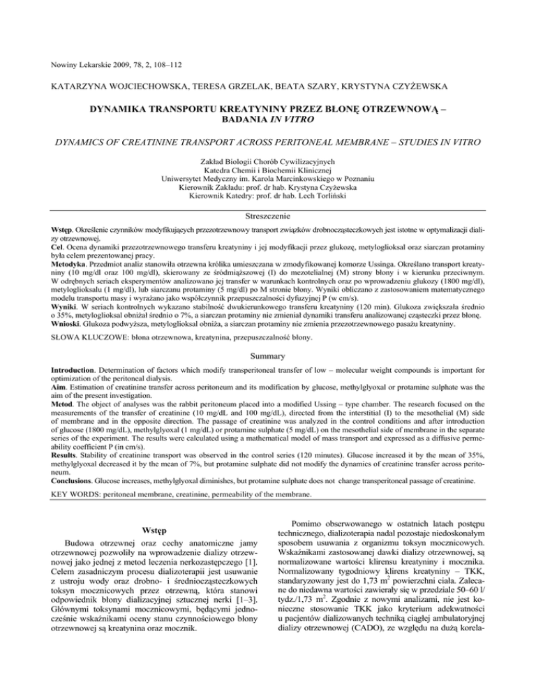 Nowiny Lekarskie 2009, 78, 2, 108–112 KATARZYNA WOJCIECHOWSKA, TERESA GRZELAK, BEATA SZARY, KRYSTYNA CZYŻEWSKA DYNAMIKA TRANSPORTU KREATYNINY PRZEZ BŁONĘ OTRZEWNOWĄ – BADANIA IN VITRO DYNAMICS OF CREATININE TRANSPORT ACROSS PERITONEAL MEMBRANE – STUDIES IN VITRO Zakład Biologii Chorób Cywilizacyjnych Katedra Chemii i Biochemii Klinicznej Uniwersytet Medyczny im. Karola Marcinkowskiego w Poznaniu Kierownik Zakładu: prof. dr hab. Krystyna Czyżewska Kierownik Katedry: prof. dr hab. Lech Torliński Streszczenie Wstęp. Określenie czynników modyfikujących przezotrzewnowy transport związków drobnocząsteczkowych jest istotne w optymalizacji dializy otrzewnowej. Cel. Ocena dynamiki przezotrzewnowego transferu kreatyniny i jej modyfikacji przez glukozę, metyloglioksal oraz siarczan protaminy była celem prezentowanej pracy. Metodyka. Przedmiot analiz stanowiła otrzewna królika umieszczana w zmodyfikowanej komorze Ussinga. Określano transport kreatyniny (10 mg/dl oraz 100 mg/dl), skierowany ze śródmiąższowej (I) do mezotelialnej (M) strony błony i w kierunku przeciwnym. W odrębnych seriach eksperymentów analizowano jej transfer w warunkach kontrolnych oraz po wprowadzeniu glukozy (1800 mg/dl), metyloglioksalu (1 mg/dl), lub siarczanu protaminy (5 mg/dl) po M stronie błony. Wyniki obliczano z zastosowaniem matematycznego modelu transportu masy i wyrażano jako współczynnik przepuszczalności dyfuzyjnej P (w cm/s). Wyniki. W seriach kontrolnych wykazano stabilność dwukierunkowego transferu kreatyniny (120 min). Glukoza zwiększała średnio o 35%, metyloglioksal obniżał średnio o 7%, a siarczan protaminy nie zmieniał dynamiki transferu analizowanej cząsteczki przez błonę. Wnioski. Glukoza podwyższa, metyloglioksal obniża, a siarczan protaminy nie zmienia przezotrzewnowego pasażu kreatyniny. SŁOWA KLUCZOWE: błona otrzewnowa, kreatynina, przepuszczalność błony. Summary Introduction. Determination of factors which modify transperitoneal transfer of low – molecular weight compounds is important for optimization of the peritoneal dialysis. Aim. Estimation of creatinine transfer across peritoneum and its modification by glucose, methylglyoxal or protamine sulphate was the aim of the present investigation. Metod. The object of analyses was the rabbit peritoneum placed into a modified Ussing – type chamber. The research focused on the measurements of the transfer of creatinine (10 mg/dL and 100 mg/dL), directed from the interstitial (I) to the mesothelial (M) side of membrane and in the opposite direction. The passage of creatinine was analyzed in the control conditions and after introduction of glucose (1800 mg/dL), methylglyoxal (1 mg/dL) or protamine sulphate (5 mg/dL) on the mesothelial side of membrane in the separate series of the experiment. The results were calculated using a mathematical model of mass transport and expressed as a diffusive permeability coefficient P (in cm/s). Results. Stability of creatinine transport was observed in the control series (120 minutes). Glucose increased it by the mean of 35%, methylglyoxal decreased it by the mean of 7%, but protamine sulphate did not modify the dynamics of creatinine transfer across peritoneum. Conclusions. Glucose increases, methylglyoxal diminishes, but protamine sulphate does not change transperitoneal passage of creatinine. KEY WORDS: peritoneal membrane, creatinine, permeability of the membrane. Wstęp Budowa otrzewnej oraz cechy anatomiczne jamy otrzewnowej pozwoliły na wprowadzenie dializy otrzewnowej jako jednej z metod leczenia nerkozastępczego [1]. Celem zasadniczym procesu dializoterapii jest usuwanie z ustroju wody oraz drobno- i średniocząsteczkowych toksyn mocznicowych przez otrzewną, która stanowi odpowiednik błony dializacyjnej sztucznej nerki [1–3]. Głównymi toksynami mocznicowymi, będącymi jednocześnie wskaźnikami oceny stanu czynnościowego błony otrzewnowej są kreatynina oraz mocznik. Pomimo obserwowanego w ostatnich latach postępu technicznego, dializoterapia nadal pozostaje niedoskonałym sposobem usuwania z organizmu toksyn mocznicowych. Wskaźnikami zastosowanej dawki dializy otrzewnowej, są normalizowane wartości klirensu kreatyniny i mocznika. Normalizowany tygodniowy klirens kreatyniny – TKK, standaryzowany jest do 1,73 m2 powierzchni ciała. Zalecane do niedawna wartości zawierały się w przedziale 50–60 l/ tydz./1,73 m2. Zgodnie z nowymi analizami, nie jest konieczne stosowanie TKK jako kryterium adekwatności u pacjentów dializowanych techniką ciągłej ambulatoryjnej dializy otrzewnowej (CADO), ze względu na dużą korela- Dynamika transportu kreatyniny przez błonę otrzewnową – badania in vitro cję wyników TKK oraz normalizowanego tygodniowego klirensu mocznika (Kt/V). Z kolei, w przypadku chorych dializowanych formą automatyczną, istnieje jednak rozbieżność między TKK oraz Kt/V. Wynika to z większej masy cząsteczkowej, a także wolniejszego przenikania z krwi do dializatu kreatyniny (113 kDa) w porównaniu z mocznikiem (60 kDa). Średnie równoważenie stężeń kreatyniny po czterech godzinach przebywania płynu w jamie otrzewnowej kształtuje się na poziomie 66%, natomiast dla mocznika wartość ta sięga 90%. Ponadto, różnica równoważenia stężeń u pacjentów z niskim charakterem przezotrzewnowego transportu w stosunku do chorych z wysokim charakterem transferu wynosi dla kreatyniny około 60%, a dla mocznika tylko 20%. Tłumaczy to fakt, iż klirens mocznika zależy przede wszystkim od objętości podawanego w ciągu doby płynu dializacyjnego, natomiast klirens kreatyniny uzależniony jest głównie od czasu przebywania dializatu w jamie otrzewnowej. W automatycznej dializie otrzewnowej okres pozostawania płynu jest krótszy w porównaniu z CADO, stąd większe rozbieżności między TKK a Kt/V w przypadku tej pierwszej techniki. Dla optymalizacji dawki dializy, istotnym badaniem staje się więc określeni