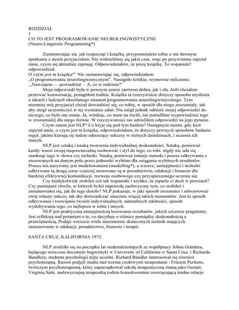 ROZDZIAŁ 1 CO TO JEST PROGRAMOWANIE NEUROLINGWISTYCZNE (Neuro-Linguistic Programming*) Zastanawiając się. jak rozpocząć t książkę, przypomniałem sobie o nie dawnym spotkaniu z moim przyjacielem. Nie widzieliśmy się jakiś czas, więc po przywitaniu zapytał mnie, czym się aktualnie zajmuję. Odpowiedziałem, że piszę książkę. To wspaniale! odpowiedział. O czym jest ta książka?” Nie zastanawiając się, odpowiedziałem: „O programowaniu neurolingwistycznym”. Nastąpiło krótkie, wymowne milczenie. .„Nawzajem — powiedział. – A, co w rodzinie?” Moja odpowiedź była w pewnym sensie zarówno dobra, jak i zła. Jeśli chciałem przerwać konwersację, postąpiłem trafnie. Książka ta rzeczywiście dotyczy sposobu myślenia o ideach i ludziach określanego mianem programowania neurolingwistycznego. Tym niemniej mój przyjaciel chciał dowiedzieć się, co robię, w sposób dla niego zrozumiały, tak aby mógł uczestniczyć w tej wymianie zdań. Nie mógł jednak odnieść mojej odpowiedzi do niczego, co było mu znane. Ja, wiedząc, co mam na myśli, nie potrafiłem wypowiedzieć tego w zrozumiałej dla niego formie. W rzeczywistości nie udzieliłem odpowiedzi na jego pytanie. Czym zatem jest NLP? Co kryje się pod tym hasłem? Następnym razem, gdy ktoś zapytał mnie, o czym jest ta książka, odpowiedziałem, że dotyczy pewnych sposobów badania reguł, jakimi kierują się ludzie odnoszący sukcesy w różnych dziedzinach, i uczenia ich innych. NLP jest sztuką i nauką tworzenia indywidualnej doskonałości. Sztuką, ponieważ każdy wnosi swoją niepowtarzalną osobowość i styl do tego, co robi. nigdy nic uda się zamknąć tego w słowa czy techniki. Nauką, ponieważ istnieje metoda i proces odkrywania z stosowanych na danym polu przez jednostki wybitne dla osiągania wybitnych rezultatów. Proces ten nazywany jest modelowaniem (modelling*), a wzorce, umiejętności i techniki odkrywane tą drogą coraz częściej stosowane są w poradnictwie, edukacji i biznesie dla bardziej efektywnej komunikacji, rozwoju osobowego czy przyspieszonego uczenia się. Czy kiedykolwiek zrobiłeś coś tak wspaniale i szybko, że zaparło ci dech w piersiach? Czy pamiętasz chwile, w których byłeś naprawdę zachwycony tym, co zrobiłeś i zastanawiałeś się, jak do tego doszło? NLP pokazuje, w jaki sposób zrozumieć i odwzorować swój własny sukces, tak aby doświadczać znacznie więcej takich momentów. Jest to sposób odkrywania i rozwijania twoich indywidualnych, naturalnych zdolności, sposób wydobywania tego, co najlepsze w tobie i innych. NLP jest praktyczną umiejętnością kreowania rezultatów, jakich szczerze pragniemy. Jest refleksją nad pytaniem o to, co decyduje o różnicy pomiędzy doskonałością a przeciętnością. Podaje wreszcie wiele niezmiernie skutecznych technik mających zastosowanie w edukacji, poradnictwie, biznesie i terapii. SANTA CRUZ, KALIFORNIA 1972 NLP zrodziło się na początku lat siedemdziesiątych ze współpracy Johna Grindera, będącego wówczas docentem lingwistyki w University of California w Santa Cruz, i Richarda Bandlera, studenta psychologii tejże uczelni. Richard Bandler interesował się również psychoterapią. Razem podjęli studia nad trzema czołowymi terapeutami : Fritzem Perlsem, twórczym psychoterapeutą, który zapoczątkował szkołę terapeutyczną znaną jako Gestait, Virginią Satir, nadzwyczajną terapeutką rodzin konsekwentnie rozwiązującą trudne relacje rodzinne uznane przez wielu innych terapeutów za niemożliwe do zmiany, oraz Miltonem Ericksonem, światowej sławy hipnoterapeutą. Bandier i Grinder nie chcieli stworzyć nowej szkoły terapeutycznej, lecz zidentyfikować metody stosowane przez tych wybitnych psychoterapeutów i przekazać je innym. Nie byli też zainteresowani samą teorią: przedstawili modele skutecznej terapii, które działały w praktyce i których można było nauczać. Chociaż terapeuci, na których się wzorowali, mieli bardzo różne osobowości, stosowali zadziwiająco podobne reguły. Bandier i Grinder przejęli je, udoskonalili i stworzyli model, który może być wyk0rzy5ta1 do efektywnej komunikacji „ zmiany osobowej „ przyspieszonego uczenia się i, oczywiście, zwiększenia radości z życia. Swoje pierwsze odkrycia zawarli w książkach opublikowanych w latach 1975-1977: The Structure of Magic 1 wid 2 (Struktura magii 1 i 2) i Pattertłs 1 wid 2 (Wzorce I i 2). Tematem drugiej jest również praca hipnoterapeutyczna Ericksona. Od tego czasu ukazuje się coraz więcej prac z zakresu NLP. W tamtych latach John i Richard mieszkali blisko Gregory’ego Batesofla, brytyjskiego antropologa i pisarza zajmującego się komunikacją i teorią systemów. Bateson pisał na wiele różnych tematów z biologii, cybernetyki, antropologii i psychoterapii. Najbardziej znany jest zwiniętej przez siebie teorii podwójnego związania w schizofrenii. Jego wkład do NLP był ogromny. Być może dopiero teraz staje się oczywiste, jak bardzo wpływową był osobą. Z tych pierwotnych modeli NLP rozwinęło się w dwóch komplementarnych kierunkach: jako proces odkrywania reguł doskonałości w dowolnej dziedzinie i jako efektywne sposoby myślenia i komunikowania się stosowane przez ludzi wybitnych. Wzory te i umiejętności mogą być stosowane bezpośrednio, ale wykorzystanie ich może również samemu procesowi modelowania dostarczać informacji zwrotnych, wzmacniając go jeszcze bardziej. W roku 1977 John i Richard przedstawiali w całej Ameryce cieszące się wielkim powodzeniem seminaria. NLP rozwijało się szybko; dotychczas w samej Ameryce ponad sto tysięcy osób skorzystało z różnych form treningu w zakresie NLP. SANTA CRUZ 1976 Wiosną 1976 roku, w chacie gdzieś wśród wzgórz w okolicy Santa Cruz, John i Richard układali w jedną całość wszystkie spostrzeżenia i odkrycia, których dokonali. Pod koniec trzydziestosześciogodzinnego mar