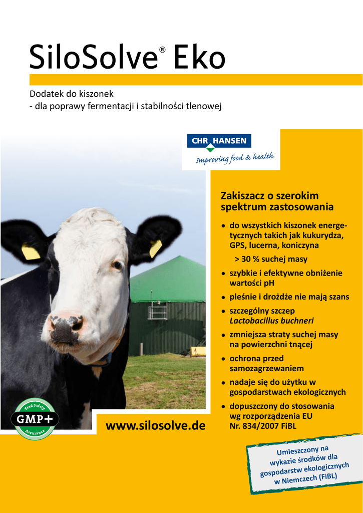 Dodatek do kiszonek - dla poprawy fermentacji i stabilności tlenowej Zakiszacz o szerokim spektrum zastosowania • do wszystkich kiszonek energetycznych takich jak kukurydza, GPS, lucerna, koniczyna > 30 % suchej masy • szybkie i efektywne obniżenie wartości pH • pleśnie i drożdże nie mają szans • szczególny szczep Lactobacillus buchneri • zmniejsza straty suchej masy na powierzchni tnącej • ochrona przed samozagrzewaniem • nadaje się do użytku w gospodarstwach ekologicznych www.silosolve.de • dopuszczony do stosowania wg rozporządzenia EU Nr. 834/2007 FiBL y na Umieszczon dków dla wykazie śro ologicznych k e tw rs a d o gosp h (FiBL) w Niemczec SiloSolve® Eko to dodatek zakiszający, który poprawia fermentację i stabilność tlenową po otwarciu silosu. Odpowiedzialna jest za to kombinacja specjalnych szczepów bakterii. Szybkie obniżenie wartości pH oraz redukcja strat SM są wyraźnymi oznakami wysokowydajnej fermentacji. Jednak kiszonki bogate w substancje odżywcze charakteryzują się dużym ryzykiem małej stabilności po otwarciu silosu. Pod wpływem kontaktu z powietrzem dochodzi do wtórnego zagrzewania się kiszonki, pojawiania się pleśni, a co za tym idzie, do dużych strat substancji odżywczych. Preparat SiloSolve® Eko wykazał w doświadczeniach wyraźną poprawę stabilności w warunkach dostępu powietrza. Oznacza to maksymalną ochronę substancji odżywczych, zarówno przed, jak i po otwarciu silosu. Lactobacillus buchneri 5,5 5 4,5 4 3,5 5 4,5 4 szybko obniża wartość pH 3,5 3 3 0 5 10 dni po zakiszeniu 15 Enterococcus faecium bardzo szybko mnoży się przy wysokim pH i intensywnie produkuje kwas mlekowy, który obniża wartość pH. Ten szczep jest więc doskonały na start. Lactobacillus plantarum zapewnia pewną i długotrwałą produkcję kwasu mlekowego przy optymalnej wartości pH wynoszącej ok. 5,5. Pewne i szybkie obniżenie wartości pH przez te dwa szczepy bakterii nie tylko redukuje straty SM, lecz powoduje, że kwas octowy wytworzony przez Lactobacillus buchneri niemal od samego początku przyjmuje postać skuteczną przeciwko drożdżom i pleśni. … i lepszą fermentację To doświadczenie pokazuje znaczący wzrost ilości kwasu mlekowego i wyraźne obniżenie strat SM. Zmniejszenie ilości amoniaku dowodzi zahamowania działania szkodliwych mikroorganizmów rozkładających białka. Obniżenie zawartości etanolu pokazuje, że SiloSolve® Eko wyraźnie redukuje aktywność drożdży w silosie. Hamujący drożdże Lactobacillus plantarum zawarty w SiloSolve® Eko wspomaga inaktywację drożdży. stężenie, % SM 11 10 9 8 7 6 5 4 3 2 1 8,7 bez dodatków SiloSolve® Eko 5,8 5,4 3,4 3,1 2,5 1,5 0,5 straty SM amoniak kwas mlekowy kwas octowy 1,2 etanol źródło: Pauly 2010, Uniwerytet Uppsala, Szwecja trawa 39 % SM 10,6 źródło: Chr. Hansen, Dania Lactobacillus plantarum 5,5 wartość pH źródło: Chr. Hansen, Dania Enterococcus faecium 6 kontrola SiloSolve® Eko żądana wartość pH 6 kukurydza, 39,5 % SM. doświadczenie 80094 Dwa skuteczne homofermentatywne szczepy zapewniają szybkie obniżenie wartości pH … SiloSolve® Eko - mniejsze straty SM dzięki Lactobacillus buchneri straty SM straty SM z dodatkami 10,5 10 7,4 8 % SM źródło: J. Jatkauskas 2014 Litewski Uniwerytet Nauk Medycznych 12 6,7 5,8 6 6,9 W porównaniu do innych szczepów buchneri, które poprzez produkcję kwasu octowego zwiększają straty SM, szczep buchneri zawarty w SiloSolve® Eko zmniejsza straty SM. 4,9 4 2 0 kukurydza trawa koniczynowa lucerna Lactobacillus buchneri z SiloSolve® Eko 100 % 100 % 87,5 % Kwas octowy w umiarkowanych stężeniach jest również skuteczny przeciwko drożdżom. Rozwój drożdży w kiszonce, a w szczególności szybki wzrost szkodliwych mikroorganizmów pod wpływem dostępu powietrza po otwarciu silosu ulega długofalowej redukcji dzięki SiloSolve® Eko. 63 % bez dodatków źródło: J. Jatkauskas 2014 Litewski Uniwerytet Nauk Medycznych SiloSolve® Eko redukuje drożdże, pleśń i ryzyko wtórnego zagrzewania SiloSolve® Eko trawa koniczynowa, 39 % SM temperatura °C temperatura °C 35 30 25 20 0 20 40 60 80 100 120 140 160 180 200 narażenie na dostęp powietrza w godzinach źródło: Pauly 2010, Uniwerytet Uppsala, Szwecja trawa, 28 % SM 32 kukurydza, 28 % SM kontrola trawa SiloSolve® Eko trawa 32 kontrola kukurydza SiloSolve® Eko kukurydza 30 30 temperatura °C kontrola trawa koniczynowa bez dodatków SiloSolve® Eko trawa koniczynowa 40 drożdże pleśń kukurydza 33,9 % SM 28 26 24 22 0 20 40 60 80 100120140160180 200 220 28 26 24 22 0 20 40 60 80 100120140160180200220 narażenie na dostęp powietrza w godzinach narażenie na dostęp powietrza w godzinach źródło: J. Jatkauskas 2014 Litewski Uniwerytet Nauk Medycznych źródło: J. Jatkauskas 2014 Litewski Uniwerytet Nauk Medycznych SiloSolve® Eko skutecznie kontroluje wytwarzanie ciepła przez drożdże i pleśń w przypadku, gdy kiszonka jest narażona na dostęp tlenu, i to niezależnie od zawartości SM i zakiszanego materiału. Zalecane stosowanie SiloSolve® Eko to wszechstronny produkt, który wywiera pozytywny wpływ na fermentację i stabilność tlenową kiszonki. Kłopoty ze stabilnością pojawiają się często w kiszonkach o wysokiej zawartości suchej masy i przy niewystarczającym ubiciu materiału. Ogniska pleśni mogą powstawać także w wyniku nierównomiernego napełnienia, ponieważ grube warstwy (powyżej 40 cm) nie mogą zostać ubite wystarczająco szczelnie. Po otwarciu silosu należy pamiętać o zabezpieczeniu miejsca wybierania kiszonki przed dostępem powietrza na przykład przy pomocy worków do obciążania silosu. Paszę należy pobierać z odcinka wynoszącego co najmniej 2,5 m latem i 1,5 m zimą. Tych zasad postępowania z kiszonką należy przestrzegać zawsze. SiloSolve® Eko można stosować do wszystkich rodzajów roślin pastewnych. Zawartość SM zakiszanego materiału powinna wynosić między 25 a