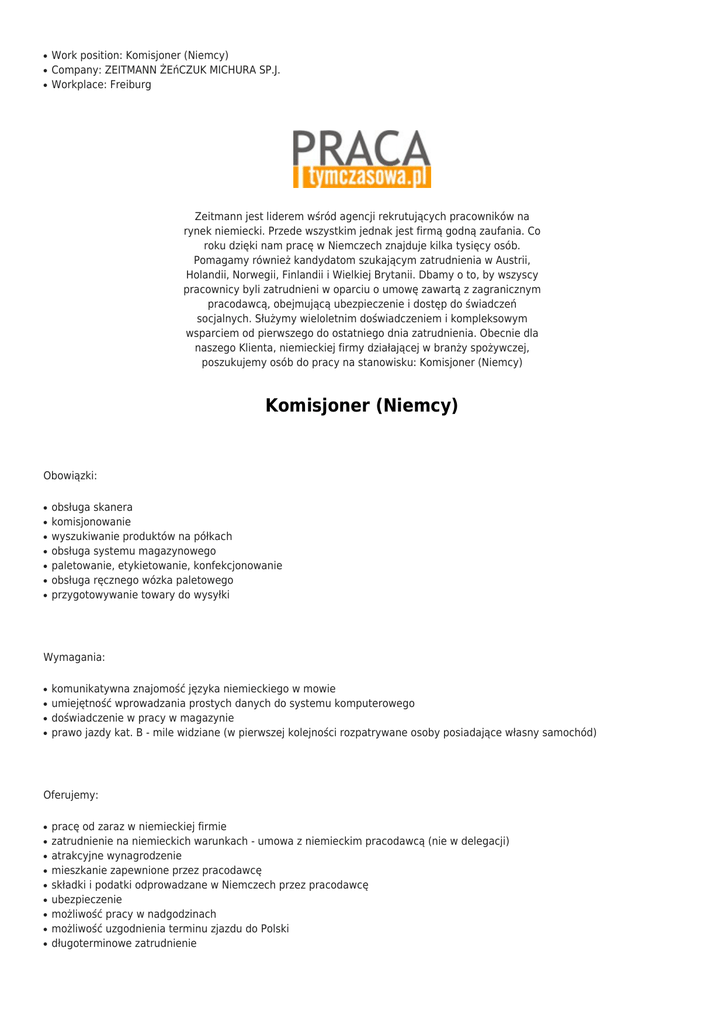 ● ● ● Work position: Komisjoner (Niemcy) Company: ZEITMANN ŻEńCZUK MICHURA SP.J. Workplace: Freiburg Zeitmann jest liderem wśród agencji rekrutujących pracowników na rynek niemiecki. Przede wszystkim jednak jest firmą godną zaufania. Co roku dzięki nam pracę w Niemczech znajduje kilka tysięcy osób. Pomagamy również kandydatom szukającym zatrudnienia w Austrii, Holandii, Norwegii, Finlandii i Wielkiej Brytanii. Dbamy o to, by wszyscy pracownicy byli zatrudnieni w oparciu o umowę zawartą z zagranicznym pracodawcą, obejmującą ubezpieczenie i dostęp do świadczeń socjalnych. Służymy wieloletnim doświadczeniem i kompleksowym wsparciem od pierwszego do ostatniego dnia zatrudnienia. Obecnie dla naszego Klienta, niemieckiej firmy działającej w branży spożywczej, poszukujemy osób do pracy na stanowisku: Komisjoner (Niemcy) Komisjoner (Niemcy) Obowiązki: ● ● ● ● ● ● ● obsługa skanera komisjonowanie wyszukiwanie produktów na półkach obsługa systemu magazynowego paletowanie, etykietowanie, konfekcjonowanie obsługa ręcznego wózka paletowego przygotowywanie towary do wysyłki Wymagania: ● ● ● ● komunikatywna znajomość języka niemieckiego w mowie umiejętność wprowadzania prostych danych do systemu komputerowego doświadczenie w pracy w magazynie prawo jazdy kat. B - mile widziane (w pierwszej kolejności rozpatrywane osoby posiadające własny samochód) Oferujemy: ● ● ● ● ● ● ● ● ● pracę od zaraz w niemieckiej firmie zatrudnienie na niemieckich warunkach - umowa z niemieckim pracodawcą (nie w delegacji) atrakcyjne wynagrodzenie mieszkanie zapewnione przez pracodawcę składki i podatki odprowadzane w Niemczech przez pracodawcę ubezpieczenie możliwość pracy w nadgodzinach możliwość uzgodnienia terminu zjazdu do Polski długoterminowe zatrudnienie Wyślij do nas swoje CV z aktualnym zdjęciem, a my skontaktujemy się z Tobą. Masz pytania? Zadzwoń do nas! Jesteśmy do Twojej dyspozycji od poniedziałku do piątku w godzinach 9-17 pod numerem tel. 12 661 64 00. Chcesz jako pierwszy wiedzieć o najnowszych ofertach pracy? Polub naszą stronę na Facebooku. Życzymy powodzenia! Zespół Rekrutacji Zeitmann Informujemy, że administratorem zbieranych danych osobowych jest Zeitmann sp.j., ul. Walerego Sławka 3, 30-633 Kraków (nr wpisu do rejestru agencji zatrudnienia: 9212). Pani/Pana dane osobowe przetwarzane będą w celach rekrutacyjnych i mogą być udostępniane innym odbiorcom w ramach prowadzonych projektów rekrutacyjnych. Posiada Pani/Pan prawo dostępu do treści swoich danych oraz ich poprawiania, a podanie Spółce danych osobowych jest dobrowolne. Wysłanie do nas CV jest jednoznaczne z wyrażeniem zgody na przetwarzanie danych osobowych, udostępnianie ich klientom w ramach prowadzonych projektów rekrutacyjnych oraz na otrzymywanie w przyszłości nowych ofert pracy i informacji marketingowych z naszej firmy. W przypadku nie wyrażenia zgody prosimy o odesłanie wiadomości zwrotnej wraz z stosowną informacją. Aplikuj Dane kontaktowe: ZEITMANN ŻEńCZUK MICHURA SP.J. Send Save Print Tweet