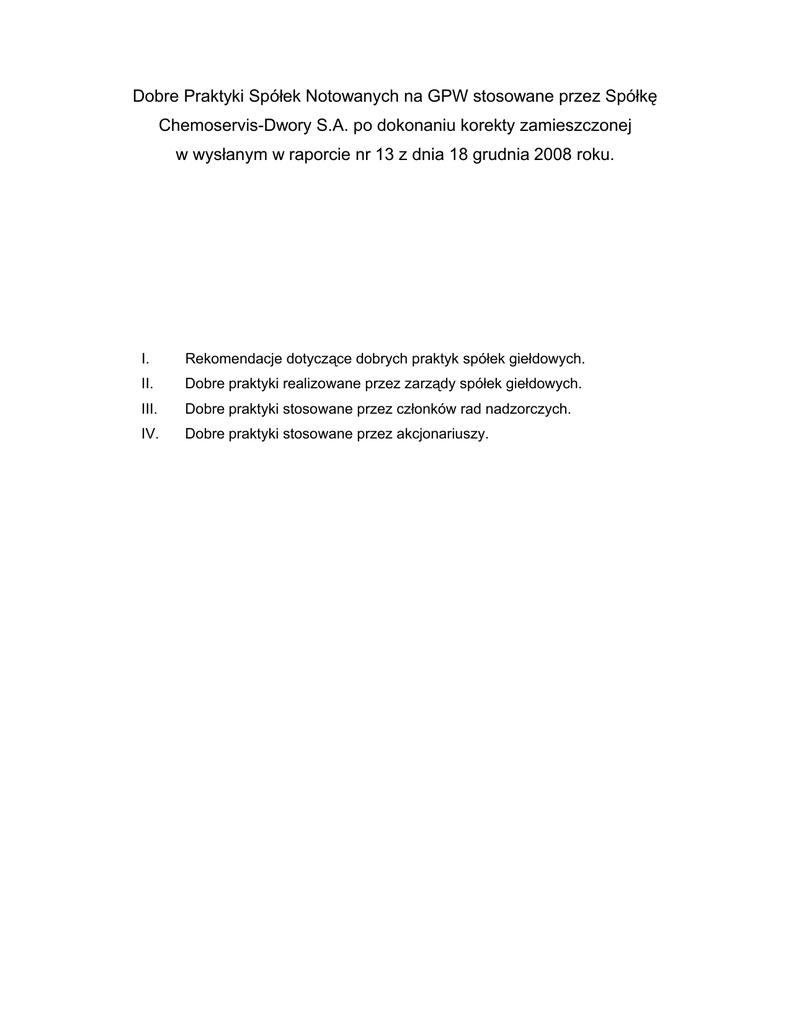 Dobre Praktyki Spółek Notowanych na GPW stosowane przez Spółkę Chemoservis-Dwory S.A. po dokonaniu korekty zamieszczonej w wysłanym w raporcie nr 13 z dnia 18 grudnia 2008 roku. I. Rekomendacje dotyczące dobrych praktyk spółek giełdowych. II. Dobre praktyki realizowane przez zarządy spółek giełdowych. III. Dobre praktyki stosowane przez członków rad nadzorczych. IV. Dobre praktyki stosowane przez akcjonariuszy. Dobre Praktyki Spółek Notowanych na GPW Preambuła Polski rynek giełdowy rozwija się dynamicznie, systematycznie budując swoją pozycje ponadlokalną wśród innych europejskich rynków kapitałowych, a zwłaszcza rynków regionu środkowej wschodniej Europy. Warunkiem tego rozwoju jest umacnianie i pogłębianie konkurencyjności polskiego rynku giełdowego, co jest tym ważniejsze, im silniejsza jest konkurencja pomiędzy rynkami kapitałowymi w zakresie przyciągania inwestycji i kapitału. Warunkami rozwoju i budowania pozycji ponadlokalnej jest również innowacyjność w sposobie rozwiązywania problemów rynku kapitałowego, dzięki czemu staje się on atrakcyjny dla inwestorów i emitentów i wyróżnia się pod tym względem pośród wielu innych miejsc koncentracji obrotu kapitałowego. Dobre praktyki, jako zbiór zasad ładu korporacyjnego oraz zasad określających normy kształtowania relacji przedsiębiorstw giełdowych z ich otoczeniem rynkowym, mogą być ważnym instrumentem wzmacniającym konkurencyjność rynku. Mogą być też nośnikiem innowacyjnego podejścia do problemów rynku giełdowego, a przez to budować jego atrakcyjność w wymiarze międzynarodowym. Istotność zbioru zasad ładu korporacyjnego wynika, zatem z procesów zachodzących na rynkach kapitałowych. Ważność zbioru zasad ładu korporacyjnego zależy od tego, czy trafnie rozpoznają one oczekiwania uczestników rynku giełdowego oraz od tego, czy są one efektywne, a wiec czy przybierają postać dobrej praktyki modelującej zachowania korporacyjne przedsiębiorstw notowanych na giełdzie. Działając w intencji wzmacniania zasad ładu korporacyjnego jako instrumentu podnoszącego konkurencyjność rynku, Giełda Papierów Wartościowych w Warszawie SA koordynuje proces ustalania treści zasad ładu korporacyjnego, jako efektu szerokiego konsensusu, angażującego głownie przekonania i oczekiwania inwestorów związanych z GPW oraz emitentów notowanych na Giełdzie. Giełda Papierów Wartościowych w Warszawie dążąc do stworzenia warunków dla powszechnego i pełnego stosowania Dobrych Praktyk, będzie zwracać uwagę na to, aby Dobre Praktyki dotyczyły spraw należących do sfery żywotnych interesów uczestników kapitałowego, rynku tak, aby stosowanie Dobrych Praktyk było zjawiskiem naturalnym, a nie wymuszonym lub fikcyjnym. Giełda Papierów Wartościowych zapewnia funkcjonowanie mechanizmu, który w ramach zasady ,,compIy or explain" pozwala na uzyskiwanie przez rynek pełnej i jednoznacznej informacji na temat stosowania zasad ładu korporacyjnego przez spółki giełdowe. Giełda Papierów Wartościowych w Warszawie przyjmuje lei na siebie zobowiązanie promowania zasad ładu korporacyjnego przez rozwiązania, które oparte są na premiowaniu spółek spełniających oczekiwanie stosowania Dobrych Praktyk w pełnym zakresie. ,,Dobre Praktyki Spółek Notowanych na GPW‘ nawiązują i wyrażają tradycje polskiego ruchu corporate governance, którego pierwszym sformalizowanym dziełem był zbiór zasad ,,Dobre Praktyki w Spółkach Publicznych w 2002", opracowany przez szereg osób i instytucji związanych z rynkiem finansowym, ze znacząca rola opiniotwórcza i realizacyjną Komitetu Dobrych Praktyk oraz w toku dyskusji z Instytutem Badań nad Gospodarką Rynkowa. Doprowadziło to do przekazania zbioru zasad ładu korporacyjnego do dalszego wdrażania przez GPW, co umożliwiło dynamiczna propagacje praktycznego stosowania zasad. Celem ,,Dobrych transparentności Praktyk spółek Spółek Notowanych giełdowych, poprawa na GPW' jakości jest umacnianie komunikacji spółek z inwestorami, wzmocnienie ochrony praw akcjonariuszy także w materiach nie regulowanych przez prawo, a przy tym nie stwarzanie obciążeń dla spółek giełdowych, nie równoważonych korzyściami wynikającymi z potrzeb rynku. Dlatego też Dobre Praktyki dotyczą wyłącznie dziedzin, w których ich stosowanie może wpływać dodatnio na rynkowa wycenę przedsiębiorstw, a przez to obniżać koszt pozyskiwania kapitału. Dobre Praktyki w zakresie objętym częściami ll, Ill i IV niniejszego zbioru stanowią reguły, dla mechanizm których stosuje przekazywania się, przez w ramach spółkę zasady rynkowi ,comply or jednoznacznej explain", informacji o naruszeniu dobrej praktyki, a zarazem premiowania spółek giełdowych, spełniających oczekiwanie stosowania Dobrych Praktyk w pełnym zakresie. Zasady określone w części pierwszej niniejszego zbioru są zaleceniami, które nie podlegają w pełni takiemu mechanizmowi, ale wyrażają tendencje w zakresie właściwego sposobu układania relacji wewnętrznych i relacji spółek giełdowych z ich otoczeniem i z tego wzglądu podobnie jak zasady objęte częściami II, Ill i IV są przedmiotem corocznych sprawozdań dotyczących postępowania w zakresie przestrzegania zasad ładu korporacyjnego, sporządzanych przez spółki giełdowe. I. Rekomendacje dotyczące dobrych praktyk spółek giełdowych 1. Spółka powinna prowadzić przejrzystą i efektywną politykę Informacyjna, zarówno z wykorzystaniem tradycyjnych metod, jak i z użyciem nowoczesnych tradycyjnych metod, jak korzystając z użyciem nowoczesnych technologii zapewniających szybkość, bezpieczeństwo oraz szeroki dostęp do informacji. Spółka korzystając w jak najszerszym stopniu z tych metod komunikowania powinna zapewnić odpowiednią komunikacje z inwestorami i analitykami, umożliwiać transmitowanie obrad walnego zgromadzenia z wykorzystaniem sieci Inte