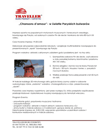 „Chansons d’amour”- w świetle Paryskich bulwarów. Impreza oparta na popularnych motywach muzycznych i tanecznych wesołego, bawiącego się ParyŜa, od szalonych czasów Fin de siecle i kankana do lata 80-tych XX wieku. Czas trwania imprezy 19.00-2.00 Dekoracje sali poprzez odpowiednie rekwizyty i projekcje multimedialne nawiązujące do prezentowanych „epok” bawiącego się ParyŜa Program wokalno- aktorski z aktywnym udziałem gości podzielony jest na trzy akty: 1. Szampańska zabawa Fin de siecle, czyli zabawa w stylu paryskiej bohemy Montmartre i przełomu XIX i XX wieku. 2. Słynne szlagiery i słynne nocne kluby ParyŜa lat 20-tych, i 30-tych. Muzyka i taniec z paryskich nocnych klubów. 3. Wielkie przeboje francuskiej piosenki z lat 50-tych do dziś. W trakcie kaŜdego 20 minutowego aktu goście biorą czynny udział w zabawie wykorzystując róŜne „zadania” wokalno- choreograficzna w stylu prezentowanej „epoki”. Pozostały czas imprezy wypełniony jest przez występy DJ, który przeplata współczesne przeboje klubowe i dyskotekowe muzyką nawiązującą do tematyki wieczoru. Program Eventu: - przywitanie gości, przystawka muzyczna i kulinarna - uroczysta kolacja - program wokalno- aktorski w trzech aktach i zabawa taneczna z DJ - zimny bufet w trakcie zabawy w 3 odsłonach- gorące danie ok. północy Zakończenie imprezy ok. 2.00-2.30, wręczenie upominków uczestnikom zabaw i konkursów realizowanych w trakcie zabawy. TRAVELLER BIURO PODRÓŻY 43-100 TYCHY AL. BIELSKA 96D TEL. 32 327 79 51 FAX 32 328 36 88