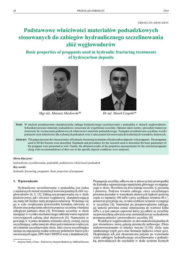 44 PRZEGLĄD GÓRNICZY 2014 UKD 622.333: 620.92: 620.91 Podstawowe właściwości materiałów podsadzkowych stosowanych do zabiegów hydraulicznego szczelinowania złóż węglowodorów Basic properties of proppants used in hydraulic fracturing treatments of hydrocarbon deposits Dr inż. Marek Czupski*) Mgr inż. Mateusz Masłowski*) Treść: W artykule przedstawiono charakterystykę zabiegu hydraulicznego szczelinowania z podsadzką w złożach węglowodorów. Scharakteryzowano materiały podsadzkowe stosowane do wypełnienia szczeliny. Opisano także normy i procedury badawcze stosowane do wyznaczania podstawowych właściwości materiału podsadzkowego. Następnie przedstawiono uzyskane wyniki pomiarów tych właściwości dla wybranych podsadzek wraz z zaleceniami ich stosowania do konkretnych warunków złożowych. Abstract: This paper presents the characteristics of hydraulic fracturing treatments of hydrocarbon deposits with proppants. The proppants used to fill the fracture were described. Standards and procedures for the research used to determine the basic parameters of the proppant were presented as well. Finally, the obtained results of the properties measurements for the selected proppants along with recommendations of their use to the specific deposit conditions were analyzed. Słowa kluczowe: hydrauliczne szczelinowanie, podsadzki, podstawowe właściwości podsadzek Key words: hydraulic fracturing, proppants, basic properties of proppants 1. Wprowadzenie Hydrauliczne szczelinowanie z podsadzką jest jedną z najstarszych metod stymulacji konwencjonalnych złóż węglowodorów [4, 5, 13]. Zabieg ten przeprowadza się w skale piaskowcowej, jak i również węglanowej charakteryzującej się małą lub bardzo małą przepuszczalnością. Wykonuje się go w celu zwiększenia powierzchni kontaktu odwiertu ze złożem oraz połączenia odwiertu poprzez szczelinę z bardziej odległymi partiami złoża [4]. Powstanie szczeliny w złożu następuje w wyniku mechanicznego oddziaływania naprężeń rozrywających caliznę skał złożowych [4]. Naprężenia te powstają w wyniku działania ciśnienia cieczy zwanej cieczą szczelinującą, zatłaczanej do złoża pod ciśnieniem większym od ciśnienia szczelinowania złoża. Jako ciecze szczelinujące stosuje się najczęściej wodne roztwory polimerów liniowych i sieciowanych (quar, HPG lub CMHPG) wraz z dodatkami [4]. *) Instytut Nafty i Gazu – Państwowy Instytut Badawczy, Oddział Krosno Propagacja szczeliny odbywa się w płaszczyźnie prostopadłej do kierunku najmniejszego naprężenia głównego występującego w złożu. Wyróżnia się dwa rodzaje szczelin, tj. poziomą i pionową. Podczas trwania zabiegu, ciecz szczelinująca powinna posiadać w warunkach złożowych lepkość pozorną rzędu co najmniej 100 mPa·s przy szybkości ścinania 40 s-1, ponieważ przyjmuje się, że taka szybkość ścinania występuje w szczelinie [4]. Natomiast po przeprowadzeniu zabiegu, jej lepkość powinna zostać zmniejszona do wartości kilku mPa·s, a tym samym zapewnić łatwy jej odbiór ze szczeliny na powierzchnię odwiertu oraz zminimalizować uszkodzenie przepuszczalności i przewodności szczeliny [4]. Wydobycie węglowodorów ze złóż niekonwencjonalnych jest stosunkowo nową gałęzią przemysłu naftowego. Złoża niekonwencjonalne to między innymi [3,10]: złoża typu zamkniętego (tight gas) oraz formacje łupkowe (shale gas). Eksploatacja ich jest ekonomiczna jedynie po wykonaniu wielu zabiegów hydraulicznego szczelinowania z podsadzką, prowadzących do uzyskania w skale systemu licznych Nr 12 PRZEGLĄD GÓRNICZY szczelin i mikropęknięć, umożliwiających uwolnienie się zaadsorbowanego gazu oraz przepływ płynów złożowych z sieci porów do odwiertu [8, 10]. Taka sieć szczelin pozwoli na uzyskanie dużej powierzchni kontaktu złoża z odwiertem. Znaczną liczbę zabiegów w łupkach kruchych przeprowadza się z użyciem cieczy nieagresywnej o bardzo niskiej lepkości, nieprzekraczającej 10 mPa·s. Technologia ta nosi nazwę slickwater fracturing [3,8,10]. Jako ciecze szczelinujące stosuje się wodne roztwory poliakryloamidu (w ilości nieprzekraczającej 1 %) lub naturalnego polimeru liniowego (w ilości 0,6÷1,2 kg/m3). Geometria utworzonych szczelin w formacjach łupkowych jest bardzo złożona i zależna od obszarów zdolnych do pękania. Zarówno w przypadku zabiegów stymulacyjnych wykonywanych na złożach konwencjonalnych, jak i niekonwencjonalnych, należy powstałą szczelinę podsadzić materiałem podsadzkowym (proppantem), zapobiegającym całkowitemu jej zamknięciu, gdy ciśnienie po zabiegu spadnie poniżej ciśnienia zamknięcia szczeliny. Materiał podsadzkowy jest transportowany z powierzchni na dno odwiertu i do szczeliny za pomocą płynów szczelinujących mających nazwę nośnika. To, w jaki sposób i ile podsadzki zostanie zatłoczone do szczeliny decyduje o przepuszczalności i hydroprzewodności szczeliny. Dlatego też materiał podsadzkowy musi charakteryzować się wieloma odpowiednimi właściwościami, które zostaną omówione w dalszej części artykułu. Schemat wykonania zabiegu hydraulicznego szczelinowania z podsadzką przedstawia rysunek 1 [1, 11, 12]. 2. Rodzaje stosowanych materiałów podsadzkowych. Do zabiegów hydraulicznego szczelinowania jako materiał podsadzkowy, stosuje się najczęściej [4, 10, 13]: – piasek kwarcowy; – piasek kwarcowy żywicowany; – ultralekką podsadzkę ceramiczną (ULWCP – UltraLightweight Ceramic Proppants); 45 – lekką podsadzkę ceramiczną (LWCP – Lightweight Ceramic Proppants); – podsadzkę ceramiczną o średniej wytrzymałości (ISP – Intermediate-Strength Proppants); – podsadzkę o wysokiej wytrzymałości (HSP – HighStrength Proppants); Tradycyjnym materiałem podsadzkowym jest odpowiednio przygotowany i sprawdzony naturalny piasek kwarcowy [4, 10]. Zalicza się go do grupy podsadzek o niskiej wytrzyma