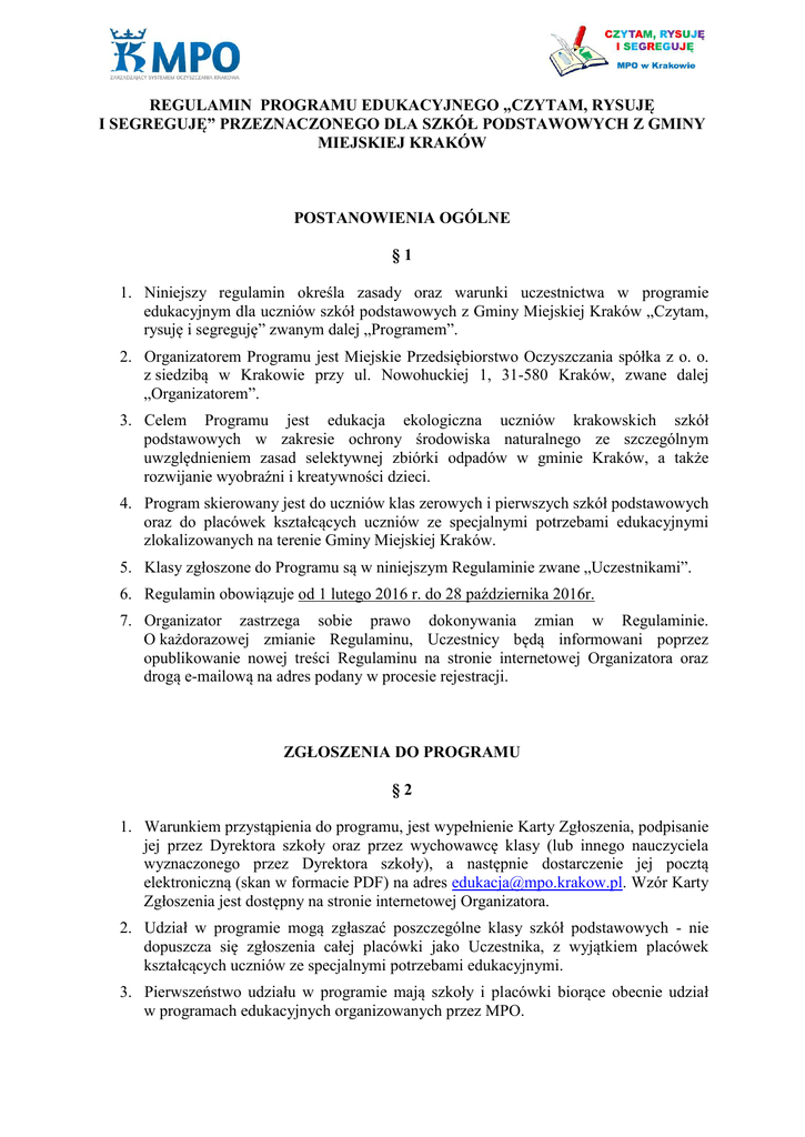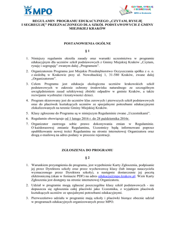 REGULAMIN PROGRAMU EDUKACYJNEGO „CZYTAM, RYSUJĘ I SEGREGUJĘ” PRZEZNACZONEGO DLA SZKÓŁ PODSTAWOWYCH Z GMINY MIEJSKIEJ KRAKÓW POSTANOWIENIA OGÓLNE §1 1. Niniejszy regulamin określa zasady oraz warunki uczestnictwa w programie edukacyjnym dla uczniów szkół podstawowych z Gminy Miejskiej Kraków „Czytam, rysuję i segreguję” zwanym dalej „Programem”. 2. Organizatorem Programu jest Miejskie Przedsiębiorstwo Oczyszczania spółka z o. o. z siedzibą w Krakowie przy ul. Nowohuckiej 1, 31-580 Kraków, zwane dalej „Organizatorem”. 3. Celem Programu jest edukacja ekologiczna uczniów krakowskich szkół podstawowych w zakresie ochrony środowiska naturalnego ze szczególnym uwzględnieniem zasad selektywnej zbiórki odpadów w gminie Kraków, a także rozwijanie wyobraźni i kreatywności dzieci. 4. Program skierowany jest do uczniów klas zerowych i pierwszych szkół podstawowych oraz do placówek kształcących uczniów ze specjalnymi potrzebami edukacyjnymi zlokalizowanych na terenie Gminy Miejskiej Kraków. 5. Klasy zgłoszone do Programu są w niniejszym Regulaminie zwane „Uczestnikami”. 6. Regulamin obowiązuje od 1 lutego 2016 r. do 28 października 2016r. 7. Organizator zastrzega sobie prawo dokonywania zmian w Regulaminie. O każdorazowej zmianie Regulaminu, Uczestnicy będą informowani poprzez opublikowanie nowej treści Regulaminu na stronie internetowej Organizatora oraz drogą e-mailową na adres podany w procesie rejestracji. ZGŁOSZENIA DO PROGRAMU §2 1. Warunkiem przystąpienia do programu, jest wypełnienie Karty Zgłoszenia, podpisanie jej przez Dyrektora szkoły oraz przez wychowawcę klasy (lub innego nauczyciela wyznaczonego przez Dyrektora szkoły), a następnie dostarczenie jej pocztą elektroniczną (skan w formacie PDF) na adres [email protected]. Wzór Karty Zgłoszenia jest dostępny na stronie internetowej Organizatora. 2. Udział w programie mogą zgłaszać poszczególne klasy szkół podstawowych - nie dopuszcza się zgłoszenia całej placówki jako Uczestnika, z wyjątkiem placówek kształcących uczniów ze specjalnymi potrzebami edukacyjnymi. 3. Pierwszeństwo udziału w programie mają szkoły i placówki biorące obecnie udział w programach edukacyjnych organizowanych przez MPO. 4. Kartę Zgłoszenia należy wypełnić w sposób kompletny, czytelny i zgodny z prawdą. 5. Wypełnienie i przesłanie Karty Zgłoszenia jest równoznaczne z akceptacją niniejszego Regulaminu. 6. Przystąpienie do Programu jest bezpłatne i dobrowolne. 7. Przystępując do Programu, Uczestnik wyraża zgodę na przetwarzanie, gromadzenie i systematyzowanie przez Organizatora danych w celach realizacji postanowień niniejszego Regulaminu, a także w celach marketingowych i promocyjnych Programu, w szczególności zezwala na publikację nazwy i adresu szkoły, a także materiałów przygotowanych przez Uczestników na stronie internetowej Organizatora i w jego materiałach promocyjnych. 8. Uczestnik przystępujący do Programu oświadcza, że zapoznał się z treścią niniejszego Regulaminu i akceptuje jego postanowienia w całości. PRZEBIEG PROGRAMU §3 1. Po dostarczenia do Organizatora prawidłowo wypełnionej Karty Zgłoszenia, Uczestnik otrzyma bezpłatnie książeczki edukacyjne pt. „Jak rezolutny Ignaś z Krakowa nauczył Zuzię śmieci sortować” wydane przez Wydawnictwo „Bombajka” na zlecenie Organizatora. 2. Książki zostaną dostarczone przez Organizatora według kolejności zgłoszeń. Istnieje też możliwość ich odbioru w siedzibie MPO w Zespole Edukacji i Promocji (ul. Nowohucka 1, pok. 207) po wcześniejszym uzgodnieniu telefonicznym (12 646 22 92). 3. Dystrybucja książek będzie prowadzona do wyczerpania zapasów. 4. Liczba książeczek przekazanych szkole jest ustalana na podstawie informacji podanych przez Uczestnika w Karcie Zgłoszenia, jednak liczba egzemplarzy przekazanych jednej szkole nie może być większa niż 200 sztuk. 5. Od momentu przekazania książeczek pozostają one do dyspozycji szkoły, która powinna zadbać o to, aby wszyscy uczniowie klas zgłoszonych do Programu otrzymali książeczki lub mieli zapewniony do nich stały dostęp. 6. Po zapoznaniu się z treścią otrzymanych książeczek, uczniowie klas biorących udział w Programie będą mogli przygotować w formie tekstowo-graficznej materiały stanowiące kontynuację przygód głównych bohaterów książeczki pt. „Jak rezolutny Ignaś z Krakowa nauczył Zuzię śmieci sortować” (od 2 do 8 stron w formacie A4). Materiały te powinny dotyczyć różnych aspektów ochrony środowiska naturalnego w Krakowie, a szczególnie tematów dotyczących gospodarki odpadami, segregacji, recyklingu itp. 7. Przygotowane przez Uczestników materiały należy przesłać pocztą elektroniczną (skan w formacie PDF) na adres [email protected] w nieprzekraczalnym terminie do 22 czerwca 2016 r. 8. Do przesłanych materiałów należy dołączyć skan (w formacie PDF) wypełnionego i podpisanego oświadczenia (wzór dostępny na stronie internetowej Organizatora), w którym nauczyciel odpowiedzialny za udział klasy w Programie potwierdza, że przesłane materiały: 1) zostały przygotowane wyłącznie przez uczniów klasy zgłoszonej do Programu, 2) nie naruszają praw autorskich, dóbr osobistych oraz innych dóbr prawnie chronionych osób trzecich, 3) nie zawierają wizerunków uczniów, chyba, że szkoła na podstawie upoważnienia udzielonego przez przedstawicieli ustawowych uczniów, wyraża zgodę na rozpowszechnianie wizerunków uczniów, 4) nie przedstawiają ani nie propagują treści niezgodnych z prawem, oraz z zasadami dobrego wychowania i kultury osobistej, 5) nie zawierają: zastrzeżonych znaków towarowych, marek oraz nazw chronionych obowiązującymi przepisami, 6) mogą zostać wykorzystane przez Organizatora w celach realizacji postanowień niniejszego Regulaminu, a także w celach marketingowych i promocyjnych Programu, w tym równie