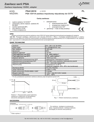 Pulsar Zasilacz serii PSA Zasilacz impulsowy 12VDC, adapter PSA12010 KOD: NAZWA: PL v1.0/VIII PSA 12V/1A zasilacz impulsowy wtyczkowy do CCTV Cechy zasilacza: · · · · · wyjście zasilania 1A/12VDC* uniwersalny zakres napięcia zasilania AC 90÷264V wysoka sprawność 80% moc stand by <0,3W V klasa energetyczna zabezpieczenia: · przeciwzwarciowe SCP · przepięciowe (wejście AC) · przeciążeniowe OLP · gwarancja – 2 lata od daty produkcji · OPIS Zasilacz przeznaczony jest do zasilania z sieci 230V AC kamer telewizji przemysłowej wymagających napięcia 12V DC. Przewód zasilający zakończony jest wtyczką DC5,5/2,1. Wraz z modułami bezpiecznikowymi z rodziny LB4/xx/xx lub LB8/xx/xx może być wykorzystany do zasilania więcej niż jednej kamery CCTV (odpowiednio 4 i 8). Zasilacz jest wyposażone w zabezpieczenie przeciwzwarciowe i przeciążeniowe. DANE TECHNICZNE Zasilanie Pobór prądu Moc zasilacza Sprawność Napięcie wyjściowe Prąd wyjściowy tAMB<30°C Prąd wyjściowy tAMB=40°C Napięcie tętnienia Zabezpieczenie przeciwzwarciowe SCP Zabezpieczenie przeciążeniowe OLP Optyczna sygnalizacja pracy Warunki pracy Wymiary(LxWxH) Waga netto/brutto Klasa ochronności PN-EN 60950-1:2007 Długość kabla DC Temperatura składowania 90 ÷ 264 V AC 50÷60Hz 0,125A@230VAC max. 12W max. 80% 12V DC 1A - patrz wykres 1 0,7A - patrz wykres 1 100mV p-p max. elektroniczne, automatyczny powrót 105-150% mocy zasilacza, automatyczny powrót LED – obecność napięcia DC o o temperatura 0 C÷40 C wilgotność względna 20%...90%, bez kondensacji 70 x 29 x 76 [mm] 0,08kg / 0,10kg II (druga) 1,45m + wtyk DC 5,5/2,1 żeński -20ºC...+60ºC * W celu przedłużenia żywotności zasilacza zalecany prąd obciążenia wynosi 0,7A. IN / PWY 100% 70% 0°C 30°C 40°C ta Wykres 1. Dopuszczalny prąd wyjściowy zasilacza w zależności od temperatury otoczenia (obciążenie chwilowe). Rys. 1. Widok mechaniczny zasilacza. AKCESORIA AKCESORIA : [1] redukcja KABEL - WTYK DC 5,5/2,1 - kod ML109 Do zasilaczy dostępne są akcesorialistwy bezpiecznikowe i redukcje kablowe. Szczegóły na stronie www.pulsar.pl. * Patrz wykres 1 wyjście TAMPER : przewody 30cm Tel.+48 14-610-19-40, fax: +48 14- 610-19-50, www.pulsar.pl, e-mail: [email protected] ®