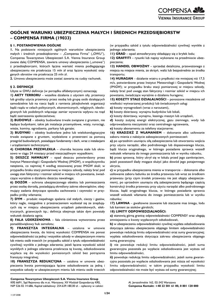 OGÓLNE WARUNKI UBEZPIECZENIA MAŁYCH I ŚREDNICH PRZEDSIĘBIORSTW – COMPENSA FIRMA (19033) § 1. POSTANOWIENIA OGÓLNE 1. Na podstawie niniejszych ogólnych warunków ubezpieczenia ma∏ych i średnich przedsiębiorstw – „Compensa Firma” („OWU”), Compensa Towarzystwo Ubezpieczeń S.A. Vienna Insurance Group zwane dalej COMPENSA, zawiera umowy ubezpieczenia („umowa”) z przedsiębiorcami, których ∏ączna wartość mienia podlegającego ubezpieczeniu nie przekracza 15 mln z∏ oraz ∏ączna wysokość osiąganych obrotów nie przekracza 25 mln z∏. 2. Umowa ubezpieczenia może zostać zawarta na cudzy rachunek. § 2. DEFINICJE Użyte w OWU definicje (w porządku alfabetycznym) oznaczają: 1) AKTY TERRORU – wszelkie dzia∏ania z użyciem si∏y, przemocy lub groźby użycia przemocy przez osobę lub grupę osób dzia∏ających samodzielnie lub na rzecz bądź z ramienia jakiejkolwiek organizacji bądź rządu w celach politycznych, ekonomicznych, religijnych, ideologicznych lub podobnych w∏ączając zamiar wywarcia wp∏ywu na rząd bądź zastraszenia spo∏eczeństwa; 2) BUDOWLE – obiekty budowlane trwale związane z gruntem, nie będące budynkami, takie jak instalacje przemys∏owe, wiaty, rurociągi, wieże, kominy, ogrodzenia, parkany lub garaże; 3) BUDYNKI – obiekty budowlane jedno lub wielokondygnacyjne trwale związane z gruntem, wydzielone z przestrzeni za pomocą przegród budowlanych, posiadające fundamenty i dach, wraz z instalacjami i urządzeniami technicznymi; 4) CHOROBA PRZEWLEK¸A – choroba leczona stale lub okresowo w ciągu 24 miesięcy przed nieszczęśliwym wypadkiem; 5) DESZCZ NAWALNY – opad deszczu potwierdzony przez Instytut Meteorologii i Gospodarki Wodnej (IMiGW), o wspó∏czynniku natężenia, co najmniej 4 wed∏ug stosowanej przez IMiGW skali; w przypadku braku stacji pomiarowej w miejscu szkody, należy brać pod uwagę stan faktyczny i rozmiar szkód w miejscu ich powstania, świadczące wyraźnie o dzia∏aniu deszczu nawalnego; 6) DOZÓR – ochrona ubezpieczonego obiektu lub pomieszczenia przez osobę doros∏ą, posiadającą określony zakres obowiązków, obejmujący zadania dotyczące sposobu zachowania i czynności w przypadku próby w∏amania; 7) DYM – produkt niepe∏nego spalania cia∏ sta∏ych, cieczy i gazów, który nagle, niezgodnie z przeznaczeniem wydosta∏ się ze znajdujących się w miejscu ubezpieczenia urządzeń paleniskowych, elektrycznych, grzewczych itp.; definicja obejmuje także dym powsta∏y wskutek dzia∏ania ognia; 8) FALA UDERZENIOWA – fala ciśnieniowa wytworzona przez ponaddźwiękowy huk samolotu; 9) FRANSZYZA INTEGRALNA – ustalona w umowie ubezpieczenia kwota, do której wysokości COMPENSA nie ponosi odpowiedzialności za jedną i wszystkie szkody w ubezpieczonym mieniu lub mieniu osób trzecich (w przypadku szkód z tytu∏u odpowiedzialności cywilnej) wynik∏e z jednego zdarzenia; jeżeli ∏ączna wysokość szkód wynik∏ych z jednego zdarzenia przekracza tę kwotę, odszkodowanie wyp∏aca się do wysokości poniesionych szkód bez potrącenia franszyzy integralnej; 10) FRANSZYZA REDUKCYJNA – ustalona w umowie ubezpieczenia kwota pomniejszająca ∏ączne odszkodowanie za jedną i wszystkie szkody w ubezpieczonym mieniu lub mieniu osób trzecich Compensa Towarzystwo Ubezpieczeń S.A. Vienna Insurance Group KRS 6691, Sąd Rejonowy dla m.st. Warszawy, XII Wydzia∏ Gospodarczy KRS, NIP 526 02 14 686, Kapita∏ zak∏adowy: 254.639.180,00 z∏. - op∏acony w ca∏ości 11.07.2008 (w przypadku szkód z tytu∏u odpowiedzialności cywilnej) wynik∏e z jednego zdarzenia; 11) GRAD – opad atmosferyczny sk∏adający się z bry∏ek lodu; 12) GRAFFITI – rysunki lub napisy wykonane na przedmiocie ubezpieczenia; 13) HANDEL OBWOŹNY – sprzedaż detaliczna, przewożonego z miejsca na miejsce mienia, ze skrzyń, waliz lub bezpośrednio ze środka transportu; 14) HURAGAN – dzia∏anie wiatru o prędkości nie mniejszej niż 17,5 m/s, potwierdzone przez Instytut Meteorologii i Gospodarki Wodnej (IMiGW); w przypadku braku stacji pomiarowej w miejscu szkody, należy brać pod uwagę stan faktyczny i rozmiar szkód w miejscu ich powstania, świadczące wyraźnie o dzia∏aniu huraganu; 15) KOSZTY STA¸E DZIA¸ALNOŚCI – ponoszone niezależnie od wielkości wytwarzanej produkcji lub świadczonych us∏ug: a) koszty wynagrodzeń (wraz z narzutami), b) koszty dzierżawy, wynajmu budynków lub lokali, c) koszty dzierżawy, wynajmu, leasingu maszyn lub urządzeń, d) koszty zużytej energii elektrycznej, gazu ziemnego, wody lub odprowadzenia nieczystości oraz centralnego ogrzewania, e) koszty abonamentu za telefony stacjonarne; 16) KRADZIEŻ Z W¸AMANIEM – dokonanie albo usi∏owanie zaboru mienia z należycie zabezpieczonych pomieszczeń: a) po uprzednim usunięciu si∏ą zabezpieczenia lub otworzeniu wejścia przy użyciu narzędzi, albo podrobionego lub dopasowanego klucza, bądź klucza oryginalnego, w którego posiadanie sprawca wszed∏ wskutek w∏amania do innego pomieszczenia lub w wyniku rabunku, b) przez sprawcę, który ukry∏ się w lokalu przed jego zamknięciem, jeżeli pozostawi∏ ślady mogące s∏użyć jako dowód jego potajemnego ukrycia, c) w przypadku ubezpieczenia mienia w transporcie – dokonanie albo usi∏owanie zaboru ∏adunku ze środka przewozu lub wraz ze środkiem przewozu (przy czym środek przewozu nie jest objęty ubezpieczeniem), po uprzednim usunięciu si∏ą zabezpieczenia będącego częścią konstrukcji środka przewozu przy użyciu narzędzi albo podrobionego klucza, bądź oryginalnego klucza, w którego posiadanie sprawca wszed∏ wskutek w∏amania do innego pomieszczenia lub w wyniku rabunku; 17) LAWINA – gwa∏towne zsuwanie lub staczanie mas śniegu, lodu lub kamieni ze stoków górskich; 18) LIMITY ODPOWIEDZIALNOŚCI: a) stanowią górną granicę odpowiedzialności COMPENSY oraz ulegają zmniejszeniu o kwoty wyp∏a