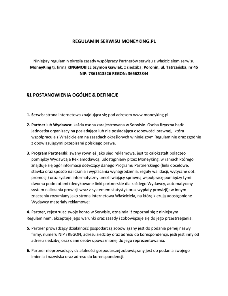 REGULAMIN SERWISU MONEYKING.PL §1 POSTANOWIENIA