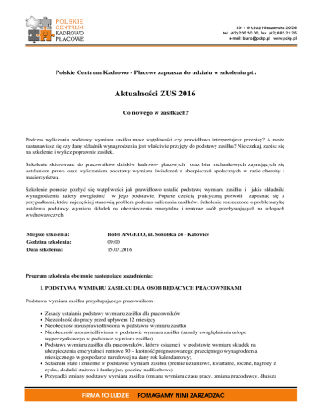 Polskie Centrum Kadrowo - Płacowe zaprasza do udziału w szkoleniu pt.: Aktualności ZUS 2016 Co nowego w zasiłkach? Podczas wyliczania podstawy wymiaru zasiłku masz wątpliwości czy prawidłowo interpretujesz przepisy? A może zastanawiasz się czy dany składnik wynagrodzenia jest właściwie przyjęty do podstawy zasiłku? Nie czekaj, zapisz się na szkolenie i wylicz poprawnie zasiłek. Szkolenie skierowane do pracowników działów kadrowo- płacowych oraz biur rachunkowych zajmujących się ustalaniem prawa oraz wyliczaniem podstawy wymiaru świadczeń z ubezpieczeń społecznych w razie choroby i macierzyństwa. Szkolenie pomoże pozbyć się wątpliwości jak prawidłowo ustalić podstawę wymiaru zasiłku i jakie składniki wynagrodzenia należy uwzględnić w jego podstawie. Poparte częścią praktyczną pozwoli zapoznać się z przypadkami, które najczęściej stanowią problem podczas naliczania zasiłków. Szkolenie rozszerzone o problematykę ustalenia podstawy wymiaru składek na ubezpieczenia emerytalne i rentowe osób przebywających na urlopach wychowawczych. Miejsce szkolenia: Hotel ANGELO, ul. Sokolska 24 - Katowice Godzina szkolenia: 09:00 Data szkolenia: 15.07.2016 Program szkolenia obejmuje następujące zagadnienia: 1. PODSTAWA WYMIARU ZASIŁKU DLA OSÓB BĘDĄCYCH PRACOWNIKAMI Podstawa wymiaru zasiłku przysługującego pracownikom : Zasady ustalania podstawy wymiaru zasiłku dla pracowników Niezdolność do pracy przed upływem 12 miesięcy Nieobecność nieusprawiedliwiona w podstawie wymiaru zasiłku Nieobecność usprawiedliwiona w podstawie wymiaru zasiłku (zasady uwzględnienia urlopu wypoczynkowego w podstawie wymiaru zasiłku) Podstawa wymiaru zasiłku dla pracowników, którzy osiągnęli w podstawie wymiaru składek na ubezpieczenia emerytalne i rentowe 30 – krotność prognozowanego przeciętnego wynagrodzenia miesięcznego w gospodarce narodowej na dany rok kalendarzowy; Składniki stałe i zmienne w podstawie wymiaru zasiłku (premie uznaniowe, kwartalne, roczne, nagrody z zysku, dodatki stażowe i funkcyjne, godziny nadliczbowe) Przypadki zmiany podstawy wymiaru zasiłku (zmiana wymiaru czasu pracy, zmiana pracodawcy, dłuższa przerwa w zatrudnieniu) Zasady waloryzacji podstawy wymiaru zasiłku ĆWICZENIA PRAKTYCZNE – rozwiązywanie przykładów 2. PODSTAWA WYMIARU ZASIŁKU DLA OSÓB NIEBĘDĄCYCH PRACOWNIKAMI Podstawa wymiaru zasiłku dla osób zatrudnionych na podstawie umowy zlecenia: Zasady ustalania podstawy wymiaru zasiłku dla zleceniobiorców z uwzględnieniem przepisów obowiązujących od 01 stycznia 2016r. Podstawa wymiaru zasiłku w pierwszym lub drugim miesiącu ubezpieczenia chorobowego Przychody z umów zlecenia stanowiące podstawę wymiaru zasiłku ĆWICZENIA PRAKTYCZNE – rozwiązywanie przykładów 3. URLOPY WYCHOWAWCZE – PODSTAWA WYMIARU SKŁADEK Zasady ustalania podstawy wymiaru składek na ubezpieczenia emerytalne i rentowe dla osób przebywających na urlopach wychowawczych: wynagrodzenie uwzględnione w podstawie wymiaru składek minimalne wynagrodzenie w podstawie wymiaru składek zasady wyliczenia podstawy wymiaru składek nieobecność usprawiedliwiona w podstawie wymiaru składek nieobecność nieusprawiedliwiona w podstawie wymiaru składek zasady uzupełniania wynagrodzenia zmiennego w podstawie wymiaru składek zasady uwzględniania składników wynagrodzenia w podstawi e wymiaru składek premie, nagrody miesięczne, kwartalne i roczne w podstawie wymiaru składek ponowne ustalenie podstawy wymiaru składek Cena szkolenia obejmuje: zajęcia dydaktyczne, materiały szkoleniowe przygotowane przez eksperta, dyplom ukończenia szkolenia, lunch, serwis kawowy. Rezerwacja wg kolejności zgłoszeń. Ilość miejsc ograniczona. W celu zgłoszenia udziału w szkoleniu należy wypełnić formularz zgłoszeniowy i przesłać go faksem na numer: (042) 683-21-25. Po otrzymaniu zgłoszenia odeślemy Państwu potwierdzenie przyjęcia rezerwacji. Dodatkowe informacje można uzyskać pod numerem (042) 235-30-60. Serdecznie zapraszamy. Rozpoczęcie szkolenia: 15.07.2016 09:00 Ilość godzin: 5 Miejsce szkolenia: Hotel ANGELO, ul. Sokolska 24 - Katowice Cena regularna uczestnictwa 490,00 zł jednej osoby netto: Cena regularna uczestnictwa jednej osoby brutto: Powered by TCPDF (www.tcpdf.org) 602,70 zł