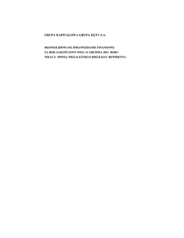 GRUPA KAPITAŁOWA GRUPA KĘTY S.A. SKONSOLIDOWANE SPRAWOZDANIE FINANSOWE ZA ROK ZAKOŃCZONY DNIA 31 GRUDNIA 2011 ROKU WRAZ Z OPINIĄ NIEZALEŻNEGO BIEGŁEGO REWIDENTA GRUPA KAPITAŁOWA GRUPA KĘTY S.A. Skonsolidowane sprawozdanie finansowe za okres od 1 stycznia 2011 roku do dnia 31 grudnia 2011 roku (w tysiącach złotych) SKONSOLIDOWANY RACHUNEK ZYSKÓW I STRAT .............................................................................................. 4 5 SKONSOLIDOWANY BILANS ................................................................................................................................. 6 SKONSOLIDOWANE SPRAWOZDANIE ZE ZMIAN W KAPITALE WŁASNYM ............................................................ 8 SKONSOLIDOWANY RACHUNEK PRZEPŁYWÓW PIENIĘŻNYCH ...........................................................................10 Dodatkowe informacje i objaśnienia ................................................................................................................12 1. Informacje ogólne .......................................................................................................................................12 2. Skład Grupy.................................................................................................................................................12 3. Skład Zarządu jednostki dominującej........................................................................................................14 4. Zatwierdzenie sprawozdania finansowego................................................................................................14 5. Istotne wartości oparte na profesjonalnym osądzie i szacunkach ............................................................14 5.1. Profesjonalny osąd ..........................................................................................................................14 5.2. Niepewność szacunków ..................................................................................................................14 6. Podstawa sporządzenia skonsolidowanego sprawozdania finansowego.................................................16 6.1. Oświadczenie o zgodności..............................................................................................................16 6.2. Waluta pomiaru i waluta sprawozdań finansowych .....................................................................16 7. Zmiany stosowanych zasad rachunkowości oraz zmiany prezentacji .....................................................16 8. Nowe standardy i interpretacje, które zostały opublikowane, a nie weszły jeszcze w życie................17 9. Korekta błędu ..............................................................................................................................................19 10. Obszary szacunków ....................................................................................................................................19 11. Istotne zasady rachunkowości ....................................................................................................................19 11.1. Zasady konsolidacji.........................................................................................................................19 11.2. Przeliczanie pozycji wyrażonych w walucie obcej .......................................................................20 11.3. Rzeczowe aktywa trwałe ................................................................................................................21 11.4. Leasing .............................................................................................................................................22 11.5. Utrata wartości niefinansowych aktywów trwałych ....................................................................22 11.6. Koszty finansowania zewnętrznego ...............................................................................................23 11.7. Nieruchomości inwestycyjne .........................................................................................................23 11.8. Wartości niematerialne ...................................................................................................................24 11.9. Przedpłaty na zakup środków trwałych ........................................................................................25 SKONSOLIDOWANE SPRAWOZDANIE Z CAŁKOWITYCH DOCHODÓW .................................................................. 11.10. 11.11. 11.12. 11.13. 11.14. 11.15. 11.16. 11.17. 11.18. 11.19. 11.20. 11.21. 11.22. 11.23. 11.24. 11.25. Aktywa finansowe...........................................................................................................................25 Utrata wartości aktywów finansowych ..........................................................................................27 Wbudowane instrumenty pochodne ...............................................................................................28 Pochodne instrumenty finansowe i zabezpieczenia ......................................................................28 Zapasy ..............................................................................................................................................29 Należności z tytułu dostaw i usług oraz pozostałe należności .....................................................30 Środki pieniężne i ekwiwalenty środków pieniężnych .................................................................30 Kapitały własne ...............................................................................................................................31 Oprocentowane kredyty bankowe ..................................................................................................32 Zobowiązania z tytułu dostaw i usług oraz pozostałe zobowiązania ...........................................32 Bierne rozliczen