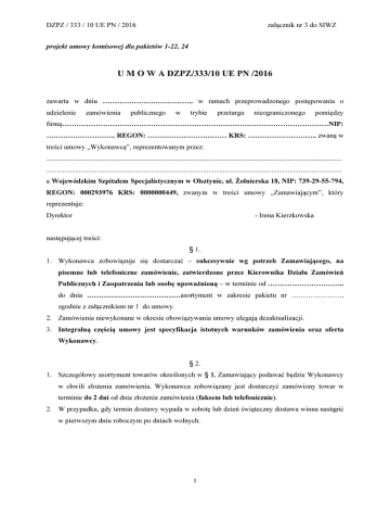 DZPZ / 333 / 10 UE PN / 2016 załącznik nr 3 do SIWZ projekt umowy komisowej dla pakietów 1-22, 24 U M O W A DZPZ/333/10 UE PN /2016 zawarta w dniu ……………………………….. w ramach przeprowadzonego postępowania o udzielenie zamówienia publicznego w trybie przetargu nieograniczonego pomiędzy firmą…………………………………………………………………………………………………NIP: ……………………….. REGON: …………………………… KRS: ……………………….. zwaną w treści umowy „Wykonawcą”, reprezentowanym przez: .................................................................................................................................................................... .................................................................................................................................................................... a Wojewódzkim Szpitalem Specjalistycznym w Olsztynie, ul. Żołnierska 18, NIP: 739-29-55-794, REGON: 000293976 KRS: 0000000449, zwanym w treści umowy „Zamawiającym”, który reprezentuje: Dyrektor - Irena Kierzkowska następującej treści: § 1. 1. Wykonawca zobowiązuje się dostarczać – sukcesywnie wg potrzeb Zamawiającego, na pisemne lub telefoniczne zamówienie, zatwierdzone przez Kierownika Działu Zamówień Publicznych i Zaopatrzenia lub osobę upoważnioną – w terminie od ………………………….. do dnia …………………………………asortyment w zakresie pakietu nr …………………, zgodnie z załącznikiem nr 1 do umowy. 2. Zamówienia niewykonane w okresie obowiązywania umowy ulegają dezaktualizacji. 3. Integralną częścią umowy jest specyfikacja istotnych warunków zamówienia oraz oferta Wykonawcy. § 2. 1. Szczegółowy asortyment towarów określonych w § 1, Zamawiający podawać będzie Wykonawcy w chwili złożenia zamówienia. Wykonawca zobowiązany jest dostarczyć zamówiony towar w terminie do 2 dni od dnia złożenia zamówienia (faksem lub telefonicznie). 2. W przypadku, gdy termin dostawy wypada w sobotę lub dzień świąteczny dostawa winna nastąpić w pierwszym dniu roboczym po dniach wolnych. 1 DZPZ / 333 / 10 UE PN / 2016 załącznik nr 3 do SIWZ § 3. 1. Zamawiający zastrzega sobie prawo odstąpienia od realizacji części umowy w przypadku, gdy strony przedmiotowej umowy nie osiągną porozumienia w sprawie wydłużenia terminu obowiązywania umowy zgodnie z brzmieniem § 13 ust. 2 niniejszej umowy. § 4. Towar winien docierać do adresata w godzinach jego pracy (7:30 – 14:30), we wszystkie dni tygodnia, z wyjątkiem niedziel, świąt i sobót oraz być dostarczany loco Magazyn Zamawiającego – Olsztyn, ul. Żołnierska 16a., dostawa towaru potwierdzana będzie przez osobę upoważnioną. § 5. Towar będzie dostarczony na koszt i ryzyko Wykonawcy. § 6. 1. Wykonawca będzie dostarczał towar Zamawiającemu zgodnie z otrzymanym zamówieniem, dokumentując wydanie towaru dokumentem wydania (WZ), określającym szczegółowo ilość i asortyment towaru. 2. Do chwili wykorzystania towaru w procedurze medycznej, towar pozostaje własnością Wykonawcy. 3. Zamawiający sporządza zbiorcze zestawienie określające ilość i asortyment towaru wykorzystanego w procedurach medycznych i przekazuje bieżące sprawozdania Wykonawcy faksem lub e-mailem. Sprawozdania przekazywane są wg potrzeb Zamawiającego, jednak nie rzadziej niż w odstępach 7-dniowych. 4. Zestawienie stanowi podstawę wystawienia faktury przez Wykonawcę i jednocześnie jest podstawą w przypadku pisemnego potwierdzenia przez Szpital, do przesłania zamówienia uzupełniającego części lub całości zużytego asortymentu. 5. Wykonawcy przysługuje prawo do kontroli stanu towarów w magazynie Zamawiającego w godzinach pracy Szpitala. 6. Zamawiający może zamawiać i przechowywać jednocześnie asortyment będący własnością Wykonawcy w ilości 20% wartości całości asortymentu określonego w niniejszej umowie, tj. …………………………. zł.. 7. Ryzyko kradzieży lub utraty w inny sposób towaru dostarczonego Zamawiającego i niewykorzystanego w procedurach medycznych, a także ryzyko uszkodzenia towaru obciąża Zamawiającego. 8. Zamawiający zastrzega sobie prawo do zwrotu towaru w okresie obowiązywania umowy. 2 DZPZ / 333 / 10 UE PN / 2016 załącznik nr 3 do SIWZ 9. Towar stanowiący własność Wykonawcy i znajdujący się w magazynie Zamawiającego w ostatnim dniu obowiązywania umowy zostanie w tym dniu odebrany przez Wykonawcę na podstawie protokołu. 10. Wykonawca winien przeprowadzać inwentaryzację towaru zdeponowanego u Zamawiającego w szóstym i ostatnim miesiącu obowiązywania umowy. 11. Inwentaryzację przeprowadza pracownik Wykonawcy z udziałem upoważnionych pracowników Zamawiającego. 12. Wykonawca zobowiązany jest poinformować pisemnie Zamawiającego o planowanym terminie inwentaryzacji, przesyłając informację pod numer faks: (0 89) 538 62 17 , nie wcześniej niż na 5 dni roboczych przed wskazanym terminem. Zamawiający ustosunkuje się do propozycji, wyrażając zgodę lub proponując inny termin w terminie 2 dni roboczych od otrzymania propozycji. § 7. Zamawiający powinien zbadać towar najpóźniej w chwili wykorzystania w procedurze medycznej. Reklamacje winny być zgłaszane pisemnie Wykonawcy w ciągu 7 dni od dnia ujawnienia wad towaru. Wykonawca winien w ciągu 7 dni ustosunkować się pisemnie do reklamacji. Brak odpowiedzi pisemnej w ciągu 7 dni jest uważany za uznanie reklamacji. W przypadku uznania reklamacji, Wykonawca zobowiązuje się dostarczyć towar wolny od wad. § 8. Towar powinien być dostarczony w opakowaniu odpowiadającym właściwościom towaru i środka transportu. § 9. W razie niewykonania lub nienależytego wykonania umowy strony zobowiązują się zapłacić kary umowne w następujących wypadkach i wysokościach: 1. Wykonawca zapłaci Zamawiającem