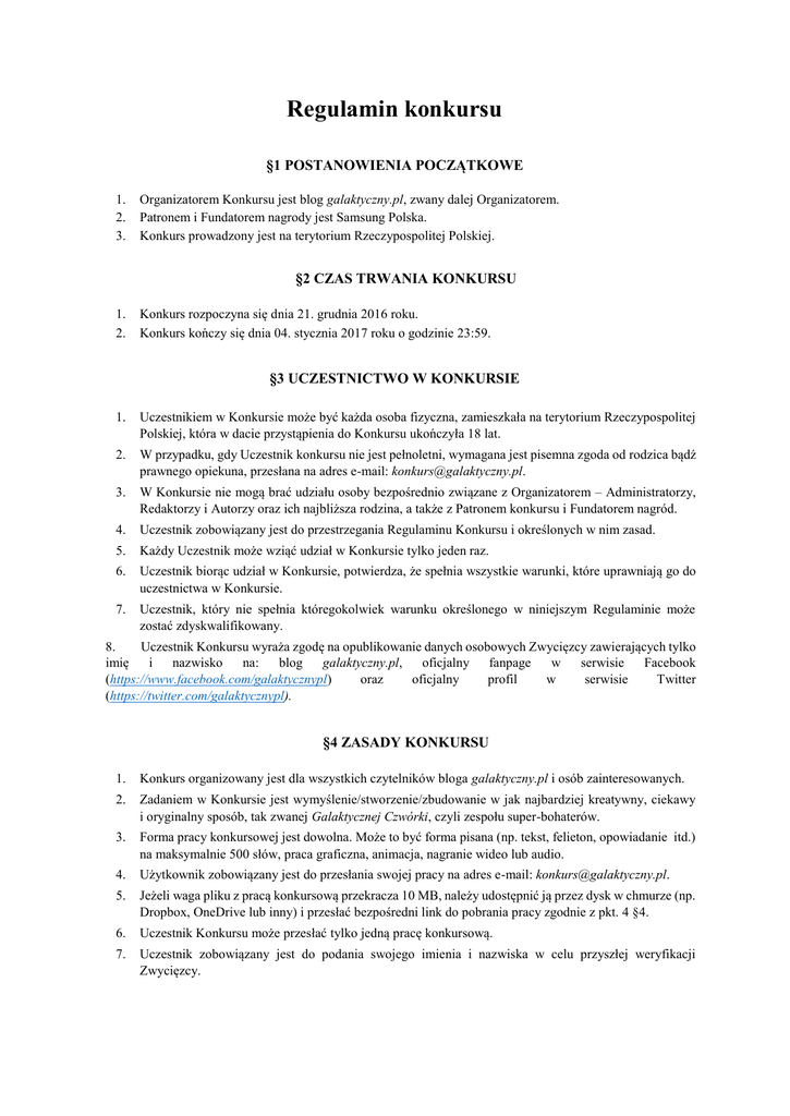 Regulamin konkursu §1 POSTANOWIENIA POCZĄTKOWE 1. 2. 3. Organizatorem Konkursu jest blog galaktyczny.pl, zwany dalej Organizatorem. Patronem i Fundatorem nagrody jest Samsung Polska. Konkurs prowadzony jest na terytorium Rzeczypospolitej Polskiej. §2 CZAS TRWANIA KONKURSU 1. 2. Konkurs rozpoczyna się dnia 21. grudnia 2016 roku. Konkurs kończy się dnia 04. stycznia 2017 roku o godzinie 23:59. §3 UCZESTNICTWO W KONKURSIE 1. Uczestnikiem w Konkursie może być każda osoba fizyczna, zamieszkała na terytorium Rzeczypospolitej Polskiej, która w dacie przystąpienia do Konkursu ukończyła 18 lat. 2. W przypadku, gdy Uczestnik konkursu nie jest pełnoletni, wymagana jest pisemna zgoda od rodzica bądź prawnego opiekuna, przesłana na adres e-mail: [email protected]. 3. W Konkursie nie mogą brać udziału osoby bezpośrednio związane z Organizatorem – Administratorzy, Redaktorzy i Autorzy oraz ich najbliższa rodzina, a także z Patronem konkursu i Fundatorem nagród. 4. Uczestnik zobowiązany jest do przestrzegania Regulaminu Konkursu i określonych w nim zasad. 5. Każdy Uczestnik może wziąć udział w Konkursie tylko jeden raz. 6. Uczestnik biorąc udział w Konkursie, potwierdza, że spełnia wszystkie warunki, które uprawniają go do uczestnictwa w Konkursie. 7. Uczestnik, który nie spełnia któregokolwiek warunku określonego w niniejszym Regulaminie może zostać zdyskwalifikowany. 8. Uczestnik Konkursu wyraża zgodę na opublikowanie danych osobowych Zwycięzcy zawierających tylko imię i nazwisko na: blog galaktyczny.pl, oficjalny fanpage w serwisie Facebook (https://www.facebook.com/galaktycznypl) oraz oficjalny profil w serwisie Twitter (https://twitter.com/galaktycznypl). §4 ZASADY KONKURSU 1. Konkurs organizowany jest dla wszystkich czytelników bloga galaktyczny.pl i osób zainteresowanych. 2. Zadaniem w Konkursie jest wymyślenie/stworzenie/zbudowanie w jak najbardziej kreatywny, ciekawy i oryginalny sposób, tak zwanej Galaktycznej Czwórki, czyli zespołu super-bohaterów. 3. Forma pracy konkursowej jest dowolna. Może to być forma pisana (np. tekst, felieton, opowiadanie itd.) na maksymalnie 500 słów, praca graficzna, animacja, nagranie wideo lub audio. 4. Użytkownik zobowiązany jest do przesłania swojej pracy na adres e-mail: [email protected]. 5. Jeżeli waga pliku z pracą konkursową przekracza 10 MB, należy udostępnić ją przez dysk w chmurze (np. Dropbox, OneDrive lub inny) i przesłać bezpośredni link do pobrania pracy zgodnie z pkt. 4 §4. 6. Uczestnik Konkursu może przesłać tylko jedną pracę konkursową. 7. Uczestnik zobowiązany jest do podania swojego imienia i nazwiska w celu przyszłej weryfikacji Zwycięzcy. §5 NAGRODY W KONKURSIE 1. W Konkursie zostanie nagrodzony 1 (słownie: jeden) Uczestnik Konkursu, którego praca będzie wyróżniała się największą kreatywnością, oryginalnością i najbardziej spodoba się jury Konkursu. 2. W skład Jury Konkursu wchodzą wybrani Redaktorzy bloga galaktyczny.pl. 3. Nagrodą w konkursie jest nowy smartwatch Samsung Gear S2 Classic w kolorze czarnym, SM-R732 (sztuk: 1). 4. Wartość nagrody z pkt 3 §5 wynosi 1199 złotych (brutto), co zostało ustalone na podstawie najniższej ceny produktu pochodzącego z oficjalnej dystrybucji, znalezionej w porównywarce cen. 5. Zwycięzca Konkursu o wygranej zostanie poinformowany za pomocą wiadomości e-mail wysłanej na adres, z którego była nadesłana praca konkursowa, o której mowa w pkt. 2 §4, nie później niż do dnia 05. stycznia 2017 roku do godziny 23:59. 6. Nagroda w Konkursie zostanie wydana zgodnie z obowiązującymi w Polsce przepisami prawa podatkowego, co oznacza, iż nagroda zostanie wydane na rzecz Zwycięzcy po wcześniejszym przekazaniu Organizatorowi wszystkich potrzebnych danych, wymaganych do uregulowania kwestii, zryczałtowanego podatku dochodowego, zgodnie z art. 30 ust.1 pkt 2 ustawy o podatku dochodowym od osób fizycznych, w wysokości 10% wartości nagrody. Podatek od Nagrody pokrywa Zwycięzca i musi zostać obligatoryjnie uiszczony przed wydaniem Nagrody. Uregulowanie tej opłaty jest warunkiem do wydania Nagrody. Organizator Konkursu, jako płatnik, przekaże zryczałtowany podatek do właściwego urzędu skarbowego w imieniu Zwycięzcy. W przypadku braku kontaktu ze Zwycięzcą, niespełnienia wymogów opisanych w Regulaminie nagroda przepada. 7. 8. §6 OGŁOSZENIE WYNIKÓW 1. Wyniki Konkursu zostaną ogłoszone niezwłocznie po zakończeniu konkursu, lecz nie później niż do dnia 09. stycznia 2017 roku do godziny 23:59. 2. Wyniki zostaną opublikowane na łamach bloga galaktyczny.pl i fanpage’u bloga w serwisie Facebook (https://www.facebook.com/galaktycznypl), a także w serwisie Twitter (https://twitter.com/galaktycznypl). Nagroda zostanie wysłana w ciągu 14 dni od otrzymania pełnych danych teleadresowych Zwycięzcy. Wysyłką nagród zajmuje się Organizator Konkursu. 3. 4. §7 DANE OSOBOWE 1. Uczestnik Konkursu wyraża zgodę na przetwarzanie przez Organizatora jego danych osobowych określonych w niniejszym Regulaminie. 2. Dane osobowe Uczestnika podane przez Uczestnika Konkursu będą przetwarzane tylko i wyłącznie w celach realizacji Konkursu, w tym ogłoszenia wyników Konkursu, przekazania nagród oraz wykonania innych obowiązków wynikających z Regulaminu. 3. Przetwarzanie danych osobowych odbywa się na zasadach przewidzianych ustawą z dnia 29 sierpnia 1997 r. o ochronie danych Osobowych (Dz. U. z 2002 Nr 101 poz. 926 z późn. zm.). 4. Podanie danych przez Uczestnika jest dobrowolne, ale konieczne dla prawidłowego przebiegu Konkursu, w szczególności wydania nagród. 5. Uczestnik Konkursu w każdej chwili ma prawo dostępu do treści swoich danych oraz ich poprawiania lub żądania ich usunięcia. 6. Dane osobowe Uczestników są niezwłocznie usuwane po zakończeniu i rozliczeniu Konkursu. §8 POSTANOWIENIA KOŃCOWE 1. Niniejszy Regulamin wchodzi w życie z dniem 21. grudnia 201