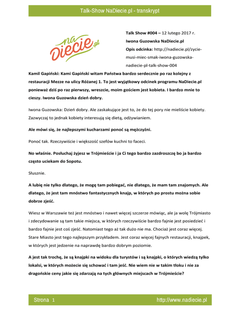 TalkShow#004–12lutego2017r. IwonaGuzowskaNaDiecie.pl Opisodcinka:http://nadiecie.pl/zyciemusi-miec-smak-iwona-guzowska nadiecie-pl-talk-show-004 KamilGapiński:KamiGapińskiwitamPaństwabardzoserdecznieporazkolejnyz restauracjiMezzenaulicyRóżanej1.TojestwyjątkowyodcinekprogramuNaDiecie.pl ponieważdziśporazpierwszy,wreszcie,moimgościemjestkobieta.Ibardzomnieto cieszy.IwonaGuzowskadzieńdobry. IwonaGuzowska:Dzieńdobry.Alezaskakującejestto,żedotejporyniemieliściekobiety. Zazwyczajtojednakkobietyinteresująsiędietą,odżywianiem. Alemówisię,żenajlepszymikucharzamiponoćsąmężczyźni. Ponoćtak.Rzeczywiścieiwiększośćszefówkuchnitofaceci. Nowłaśnie.PosłuchajżyjeszwTrójmieścieijaCitegobardzozazdroszczębojabardzo częstouciekamdoSopotu. Słusznie. Alubięnietylkodlatego,żemogętampobiegać,niedlatego,żemamtamznajomych.Ale dlatego,żejesttammnóstwofantastycznychknajp,wktórychpoprostumożnasobie dobrzezjeść. WieszwWarszawieteżjestmnóstwoinawetwięcejszczerzemówiąc,alejawolęTrójmiasto izdecydowaniesątamtakiemiejsca,wktórychrzeczywiściebardzofajniejestposiedzieći bardzofajniejestcośzjeść.Natomiasttegoażtakdużoniema.Chociażjestcorazwięcej. StareMiastojesttegonajlepszymprzykładem.Jestcorazwięcejfajnychrestauracji,knajpek, wktórychjestjedzenienanaprawdębardzodobrympoziomie. Ajesttaktrochę,żesąknajpkinawidokudlaturystówisąknajpki,októrychwiedzątylko lokalsi,wktórychmożeciesięschowaćitamjeść.Niewiemniewtakimtłokuinieza dragońskiecenyjakiesięzdarzająnatychgłównychmiejscachwTrójmieście? 1 Oczywiście.ŻadenzmieszkańcówTrójmiastaniepójdziezjeśćdotychpopularnych,takich smażalnirybczyrestauracjirybnych,któremieszcząsięnatympopularnymdeptakuod BrzeźnaażpoGdynię.ZapomnijmieszkańcaTrójmiastatamnieznajdziesz.Janaprzykład jeżdżędolasunarybę.Zawszejakzapraszamynaszychprzyjaciółprzeważniezokolic Warszawytokażdyjestzaskoczony.JaktojedziemydoGdańska,nadmorzeatynas zabieraszdolasunaryby.Aoczywiściebowiemgdziesąnajlepszeryby.Tamjesttakafajna miejscówkaonasięnazywaPrzystań.NieniePrzystań. BarPrzystań. Przystańtojesttopaskudztwo,którejestwSopocie.Tosięnazywa,matkokochana.Zaraz sobieprzypomnę.Rybakówka.IdoRybakówkisięjeździnarybywTrójmieście.Jesttow LesieOliwskimjeszczezazoo,więcokoliceprzepiękne.Zresztąsątomojemiejsca,wktórych biegam,poktórychjeżdżęnarowerze.Noitamsąnajlepsze,najświeższeryby.Właściciel samhodujekilkagatunkówrybpozatymjestwłaścicielemprzetwórnirybwIslandii,więc naprawdętocoserwujegościomjestnajwyższejjakości,zawsześwieże,pyszne.Niejesttam wykwitniejeżelichodziowygląd. Aleczęstotakjest,żetedobraknajpyzsuperjedzeniemniewyglądająwcalejakośtam fenomenalniewewnątrzaledajądobreżarcie. Faceci,botojestbardzoważnaczęśćwżyciuIwonyiodwóchmężczyznachchciałem porozmawiać.Popierwszemąż,żołnierz,czylichłop,którynieoszukujmysięnazapewne jestżarty.Żebywykarmićżołnierzatotrzebamiećzakładamtrochęczasu.JaktojestTy gotujeszczyonsobiesamjednakgotuje?Czymożegowjednostcekarmią? Wjednostcegoniekarmią.Teczasyjużminęły. OK. Pozatymonnielubitegojedzenia. Jestemwstaniegozrozumieć. NatomiastwłaśnieJacekniejestprzykłademtakiegożartegofaceta.Onjestbardzoszczupły, matakieokresy,żenaprawdętrzebaprzypominaćmuotymżebycośzjadł.Jejakwróbel, chociażnaszczęścieostatnioodbijaipochłaniaogromneilościjedzenia,więcztegosię 2 cieszę.Natomiastmaniesamowitąprzemianęmaterii.Aletakjestmięsożercą.Natomiast przeszedłbezproblemunatrybniejedzeniawieprzowinyitomnieogromniecieszy.Bojajuż 27-28niejemjużwieprzowinyifantastyczniesięztymczuję.IJacekrzeczywiściepokilku latachsamczujeróżnicę,więcwdomujagotuję.Chociażonpotrafitylkoniechcemusię. AjakiejestnaprzykładdaniepopisoweIwonyGuzowskiej,gdynabroi,gdywkurzymężai gdychceprzeprosićmęża? Janiebroję.Inapewnonieprzepraszammężagotując.Wkażdymbądźraziewszystko oczywiściezależyodokoliczności.Niebędęspecjalnieskromna,alerzeczywiściebezwzględu natoczyzabieramsięzapotrawywegetariańskieczymięsnenieźlemionewychodzą.Na pewnojeżelichodziomięsatakimmoimpopisowymdaniemjestalbojagnięcinaalbo wołowina,polędwicawołowawsosiebordelaise. Hmmmjużzgłodniałem. Jestfantastycznytensos.Aksamitny.Oczywiściegotujesięgozczerwonegowina,trzeba odparowaćtowino,zredukowaćjegoilośćzcałejbutelkidojednejtrzeciej,aleonosię gotujezziołami,jałowiec,rozmarynświeży,zieleangielskie,trochęgoździków,późniejdaje sięmelasędotegoisoszpieczeni.Noitensosjestpoprostuprzeobłędny.Jesttakipyszny, żenawetkawałekpiersizkurczakapodaszznimiwydajesię,żemaszmegawykwintne danie.Natomiastlubiębardzodużomakaronugotowaćiróżnegorodzajusosy.Kombinacjez warzywami,zmięsem.Jestnaprawdętegomnóstwo. TerazzahaczamyodrugiegomężczyznęwżyciuIwony.Ojejsyna.Czybywatak,żemama gotujesynowinaprzykładnarandkę,żeonmówimamodzisiajprzychodzidodomu fantastycznadziewczynaimuszęzrobićnaniejwrażenie.Pomóż.Czytaksięzdarza? Mójsynodkilkulatjużmieszkasamodzielnie.Tojestdorosłyfacet. Niemieszka.Ojtozabolało. Tojestdorosłyfacet,którywłaśnie Aletomożebyćmamanawynosjakterazsąmodnetewszystkiepudełkatomożemamaz pudełkiemwpaśćiprzywieźćnaprzykładnarandkęionbędzieudawał,żetoonupichcił. 3 Bzdura,boonmójsynfantastyczniegotuje. Dobrzegotuje.OK. Zresztąskończyłtechnikumgastronomiczne. Niebyłopytania.Tegoniewiedziałem. Świetniegotuje.Podwarunkiem,żegotujedlasiebie,dlabliskich,bogdybymiałtorobić zawodowotonapewnoniejestjegościeżka. OK.Aletezwydajemisięto,żetoczęstobywatak,żeczłowiekjakmamotywację. Prawda.Niewiemjaksięmieszkasamemu.Jakmieszkałemsamemutonaprzykładnie chciałomisięgotować. Nobodlasiebietaktociężko. Dlarodziny,dziewczyny,dlaprzyjaciółtojednakinaczejtonawetwychodzilepiej. Onpotrafi.Jemuświetniewychodzigotowanie.Tak,żeznimteżniemaproblemu aczkolwiekjakmama.Młodydomnieprzychodzijakmajechaćdodomutozawszecośmu dopudełka. Wrzucasz.Powiedzmijakbyłaśwtr