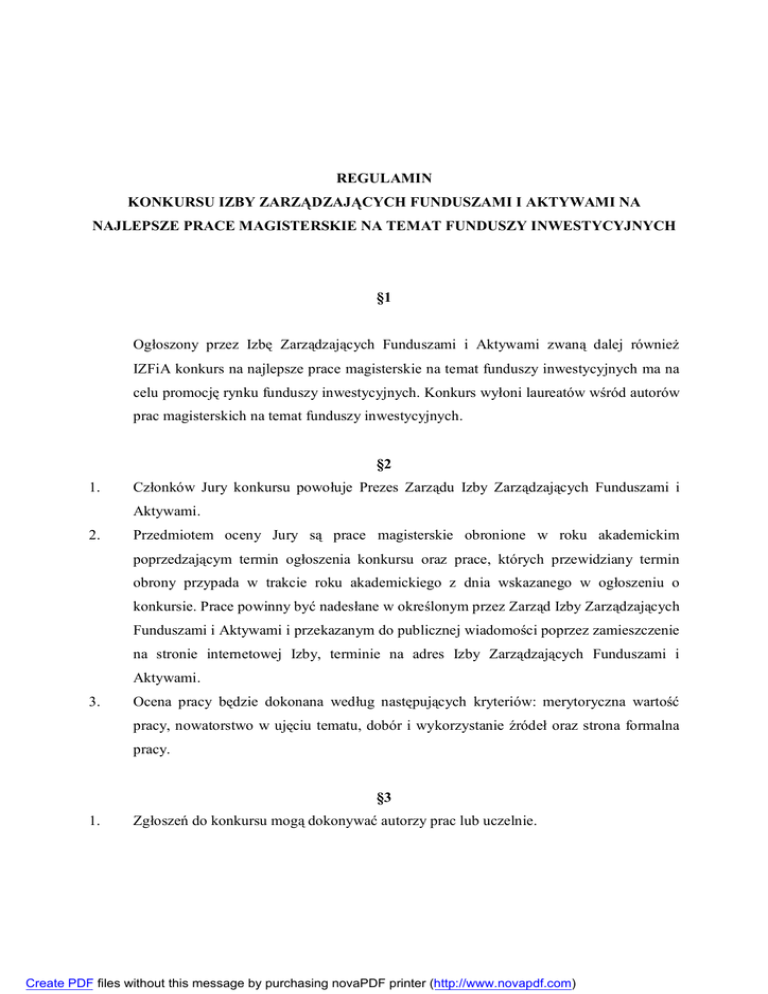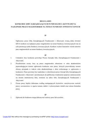 REGULAMIN KONKURSU IZBY ZARZĄDZAJĄCYCH FUNDUSZAMI I AKTYWAMI NA NAJLEPSZE PRACE MAGISTERSKIE NA TEMAT FUNDUSZY INWESTYCYJNYCH §1 Ogłoszony przez Izbę Zarządzających Funduszami i Aktywami zwaną dalej również IZFiA konkurs na najlepsze prace magisterskie na temat funduszy inwestycyjnych ma na celu promocję rynku funduszy inwestycyjnych. Konkurs wyłoni laureatów wśród autorów prac magisterskich na temat funduszy inwestycyjnych. §2 1. Członków Jury konkursu powołuje Prezes Zarządu Izby Zarządzających Funduszami i Aktywami. 2. Przedmiotem oceny Jury są prace magisterskie obronione w roku akademickim poprzedzającym termin ogłoszenia konkursu oraz prace, których przewidziany termin obrony przypada w trakcie roku akademickiego z dnia wskazanego w ogłoszeniu o konkursie. Prace powinny być nadesłane w określonym przez Zarząd Izby Zarządzających Funduszami i Aktywami i przekazanym do publicznej wiadomości poprzez zamieszczenie na stronie internetowej Izby, terminie na adres Izby Zarządzających Funduszami i Aktywami. 3. Ocena pracy będzie dokonana według następujących kryteriów: merytoryczna wartość pracy, nowatorstwo w ujęciu tematu, dobór i wykorzystanie źródeł oraz strona formalna pracy. §3 1. Zgłoszeń do konkursu mogą dokonywać autorzy prac lub uczelnie. Create PDF files without this message by purchasing novaPDF printer (http://www.novapdf.com) 2. Zgłoszenie pracy na konkurs wymaga pisemnej zgody promotora i poświadczenia daty obrony oraz oświadczenia o treści określonej w załączniku nr 1 do przedmiotowego regulaminu. 3. Prace należy składać w 3 egzemplarzach, w określonym, podanym przez IZFiA terminie. Należy je dostarczyć osobiście lub drogą listowną do siedziby IZFiA ul. Książęca 4, 00498 Warszawa. W tym samym terminie prace należy również przesłać drogą elektroniczną na adres [email protected]. 4. Zgłoszenie, o którym mowa w pkt. 1 powinno zawierać: imię i nazwisko autora, adres do korespondencji z autorem i telefon kontaktowy. 5. Prace nadesłane do konkursu nie będą zwracane. §4 1. Dla autorów najlepszych prac przewidziano nagrody: I – 5 000 PLN Autorzy prac wyróżnionych – możliwość odbycia stażu w Towarzystwie Funduszy Inwestycyjnych. 2. Jury może nie przyznać nagród. 3. Decyzja Jury jest ostateczna. Od decyzji nie przysługuje odwołanie. 4. Rozstrzygnięcie konkursu nastąpi w terminie wyznaczonym przez Zarząd IZFiA i podanym do publicznej wiadomości poprzez zamieszczenie na stronie internetowej Izby wraz z informacją o terminie nadsyłania prac, o której mowa w § 2 ust. 2. §5 Wszelkie zmiany bądź uzupełnienia niniejszego regulaminu mogą być dokonane przez Zarząd Izby, przed ogłoszeniem kolejnej edycji konkursu. Create PDF files without this message by purchasing novaPDF printer (http://www.novapdf.com) Załącznik nr 1 do Regulaminu Konkursu Izby Zarządzających Funduszami i Aktywami na najlepsze prace magisterskie na temat funduszy inwestycyjnych OŚWIADCZENIE UCZESTNIKA konkursu na najlepsze prace magisterskie na temat funduszy inwestycyjnych Oświadczam, iż jestem autorem utworu zgłoszonego do udziału w konkursie w myśl ustawy o prawie autorskim i prawach pokrewnych (Dz. U. 00.80.904). Oświadczam, że w przypadku wygranej w konkursie wyrażam zgodę na publiczne ogłoszenie wyników konkursu wraz z podaniem danych - imię i nazwisko laureata, tytuł pracy magisterskiej oraz formę nagrody - na wcześniej wskazanej przez organizatora konferencji, na której nastąpi uroczyste ogłoszenie wyników konkursu oraz, że przyjmę nagrodę Izby Zarządzających Funduszami i Aktywami, w związku z moim udziałem w Konkursie na najlepszą pracę magisterską na temat funduszy inwestycyjnych. Jednocześnie wyrażam zgodę, aby informacje o zakończeniu konkursu, oświadczenia Aktywami, oraz inne przekazywane publikacje przez Izby Zarządzających organizatora do Funduszami wiadomości i publicznej zawierały imię i nazwisko laureata, tytuł pracy magisterskiej oraz formę nagrody. ….….…………………….. Data, podpis Create PDF files without this message by purchasing novaPDF printer (http://www.novapdf.com)
