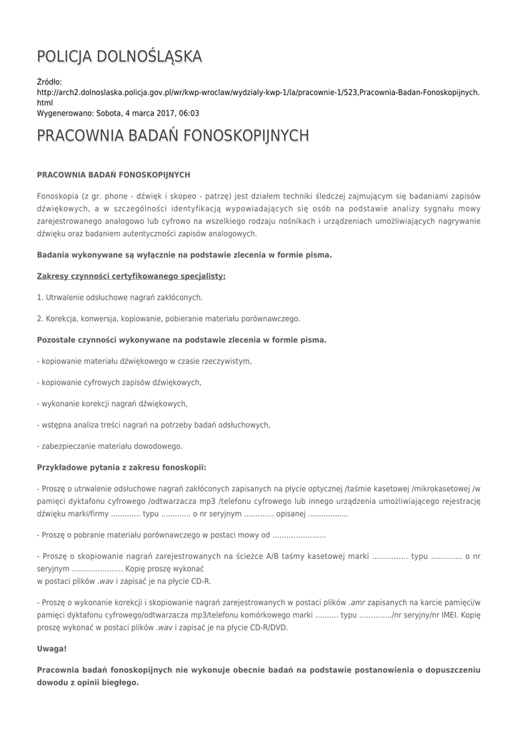 POLICJA DOLNOŚLĄSKA Źródło: http://arch2.dolnoslaska.policja.gov.pl/wr/kwp-wroclaw/wydzialy-kwp-1/la/pracownie-1/523,Pracownia-Badan-Fonoskopijnych. html Wygenerowano: Sobota, 4 marca 2017, 06:03 PRACOWNIA BADAŃ FONOSKOPIJNYCH PRACOWNIA BADAŃ FONOSKOPIJNYCH Fonoskopia (z gr. phone - dźwięk i skopeo - patrzę) jest działem techniki śledczej zajmującym się badaniami zapisów dźwiękowych, a w szczególności identyfikacją wypowiadających się osób na podstawie analizy sygnału mowy zarejestrowanego analogowo lub cyfrowo na wszelkiego rodzaju nośnikach i urządzeniach umożliwiających nagrywanie dźwięku oraz badaniem autentyczności zapisów analogowych. Badania wykonywane są wyłącznie na podstawie zlecenia w formie pisma. Zakresy czynności certyfikowanego specjalisty: 1. Utrwalenie odsłuchowe nagrań zakłóconych. 2. Korekcja, konwersja, kopiowanie, pobieranie materiału porównawczego. Pozostałe czynności wykonywane na podstawie zlecenia w formie pisma. - kopiowanie materiału dźwiękowego w czasie rzeczywistym, - kopiowanie cyfrowych zapisów dźwiękowych, - wykonanie korekcji nagrań dźwiękowych, - wstępna analiza treści nagrań na potrzeby badań odsłuchowych, - zabezpieczanie materiału dowodowego. Przykładowe pytania z zakresu fonoskopii: - Proszę o utrwalenie odsłuchowe nagrań zakłóconych zapisanych na płycie optycznej /taśmie kasetowej /mikrokasetowej /w pamięci dyktafonu cyfrowego /odtwarzacza mp3 /telefonu cyfrowego lub innego urządzenia umożliwiającego rejestrację dźwięku marki/firmy .......…… typu …......…. o nr seryjnym …...……. opisanej .................. - Proszę o pobranie materiału porównawczego w postaci mowy od ………………….. - Proszę o skopiowanie nagrań zarejestrowanych na ścieżce A/B taśmy kasetowej marki …………… typu …………. o nr seryjnym …………………. Kopię proszę wykonać w postaci plików .wav i zapisać je na płycie CD-R. - Proszę o wykonanie korekcji i skopiowanie nagrań zarejestrowanych w postaci plików .amr zapisanych na karcie pamięci/w pamięci dyktafonu cyfrowego/odtwarzacza mp3/telefonu komórkowego marki ………. typu …………../nr seryjny/nr IMEI. Kopię proszę wykonać w postaci plików .wav i zapisać je na płycie CD-R/DVD. Uwaga! Pracownia badań fonoskopijnych nie wykonuje obecnie badań na podstawie postanowienia o dopuszczeniu dowodu z opinii biegłego. Zlecone badania w zakresie pobrania materiału porównawczego są realizowane w terminie do trzech miesięcy. W przypadku pozostałych badań termin ich realizacji jest zależny od ilości aktualnie realizowanych zleceń oraz charakteru i obszerności przekazywanego materiału dowodowego. Kontakt: tel. resortowy 87-145-58 i 87-138-36 tel. miejski 71-340-45-58 i 71-340-38-36 Ocena: 0/5 (0) Tweetnij