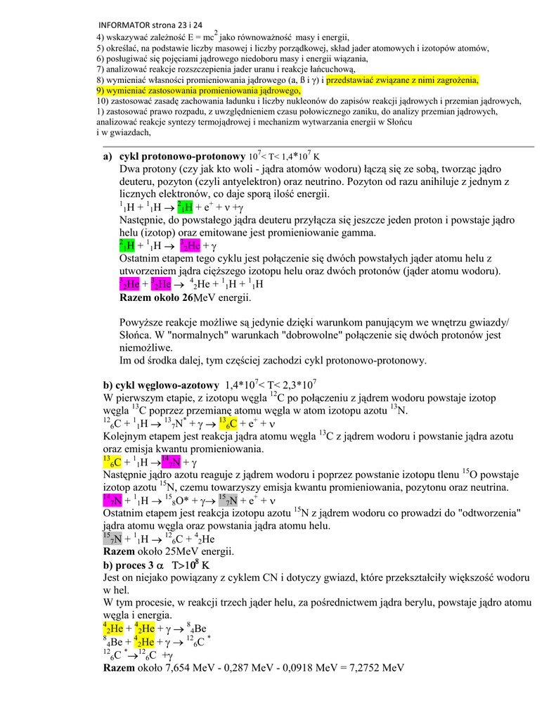 INFORMATOR strona 23 i 24 2 4) wskazywać zależność E = mc jako równoważność masy i energii, 5) określać, na podstawie liczby masowej i liczby porządkowej, skład jader atomowych i izotopów atomów, 6) posługiwać się pojęciami jądrowego niedoboru masy i energii wiązania, 7) analizować reakcje rozszczepienia jader uranu i reakcje łańcuchową, 8) wymieniać własności promieniowania jądrowego (a, ß i γ) i przedstawiać związane z nimi zagrożenia, 9) wymieniać zastosowania promieniowania jądrowego, 10) zastosować zasadę zachowania ładunku i liczby nukleonów do zapisów reakcji jądrowych i przemian jądrowych, 1) zastosować prawo rozpadu, z uwzględnieniem czasu połowicznego zaniku, do analizy przemian jądrowych, analizować reakcje syntezy termojądrowej i mechanizm wytwarzania energii w Słońcu i w gwiazdach, a) cykl protonowo-protonowy 107< T< 1,4*107 K Dwa protony (czy jak kto woli - jądra atomów wodoru) łączą się ze sobą, tworząc jądro deuteru, pozyton (czyli antyelektron) oraz neutrino. Pozyton od razu anihiluje z jednym z licznych elektronów, co daje sporą ilość energii. 1 1 2 + 1H + 1H 1H + e + ν + Następnie, do powstałego jądra deuteru przyłącza się jeszcze jeden proton i powstaje jądro helu (izotop) oraz emitowane jest promieniowanie gamma. 2 1 3 1H + 1H 2He + Ostatnim etapem tego cyklu jest połączenie się dwóch powstałych jąder atomu helu z utworzeniem jądra cięższego izotopu helu oraz dwóch protonów (jąder atomu wodoru). 3 3 4 1 1 2He + 2He 2He + 1H + 1H Razem około 26 eV energii. Powyższe reakcje możliwe są jedynie dzięki warunkom panującym we wnętrzu gwiazdy/ Słońca. W "normalnych" warunkach "dobrowolne" połączenie się dwóch protonów jest niemożliwe. Im od środka dalej, tym częściej zachodzi cykl protonowo-protonowy. b) cykl węglowo-azotowy 1,4*107< T< 2,3*107 W pierwszym etapie, z izotopu węgla 12C po połączeniu z jądrem wodoru powstaje izotop węgla 13C poprzez przemianę atomu węgla w atom izotopu azotu 13N. 12 1 13 * 13 + 6C + 1H 7N + 6C + e + Kolejnym etapem jest reakcja jądra atomu węgla 13C z jądrem wodoru i powstanie jądra azotu oraz emisja kwantu promieniowania. 13 1 14 6C + 1H 7N + Następnie jądro azotu reaguje z jądrem wodoru i poprzez powstanie izotopu tlenu 15O powstaje izotop azotu 15N, czemu towarzyszy emisja kwantu promieniowania, pozytonu oraz neutrina. 14 1 15 15 + 7N + 1H 8O* + 7N + e + Ostatnim etapem jest reakcja izotopu azotu 15N z jądrem wodoru co prowadzi do "odtworzenia" jądra atomu węgla oraz powstania jądra atomu helu. 15 1 12 4 7N + 1H 6C + 2He Razem około 25MeV energii. b) proces 3 Jest on niejako powiązany z cyklem CN i dotyczy gwiazd, które przekształciły większość wodoru w hel. W tym procesie, w reakcji trzech jąder helu, za pośrednictwem jądra berylu, powstaje jądro atomu węgla i energia. 4 4 8 2He + 2He + 4Be 8 4 12 * 4Be + 2He + 6C 12 * 12 6C 6C + Razem około 7,654 MeV - 0,287 MeV - 0,0918 MeV = 7,2752 MeV Gdy gwiazda przekształca wodór w hel, a ten w węgiel, zaczynają zachodzić inne procesy jądrowe, prowadzące do syntezy cięższych pierwiastków. Powstają pierwiastki takie jak neon, tlen czy krzem. W końcowym etapie powstaje żelazo - pierwiastek posiadający najbardziej stabilne jądro ze wszystkich pierwiastków (posiada największą energię wiązania jądra atomowego - po prostu bardzo trudno jest je przekształcić w inne pierwiastki i wymaga to potężnych energii). 3. Śmierć To proste - w odniesieniu do gwiazd ma zastosowanie stwierdzenie, że otyli żyją krócej. Innymi słowy - im gwiazda masywniejsza tym szybciej się "wypala". Wodór zostaje przekształcony w hel, ten w węgiel. Na końcu przemian jądrowych powstaje żelazo. Tak więc gwiazda pod koniec życia posiada jądro zbudowane głównie z żelaza i niklu, otoczone różnymi warstwami, w których mogą zachodzić jeszcze "resztkowe" reakcje jądrowe, dopalające pozostałości wodoru czy helu. W gwieździe rozpoczynają się zapasy pomiędzy grawitacją a ciśnieniem gazu (oczywiście nie gazu takiego jaki znamy, lecz gazu ze zjonizowanych atomów i elektronów). Zad 19 patrz też zad 18(sprawdzian) fpj133 - Synteza jądrowa - STYCZEŃ 2009 / A1 Źródłem energii w Słońcu są reakcje syntezy jądrowej. Poniżej przedstawiono uproszczony schemat ciągu reakcji prowadzących do powstania jąder helu zwany cyklem protonowym. W zadaniach a) i b) uzupełnij zapisy równań reakcji, korzystając z zamieszczonych powyżej informacji. 1 1 a) 1H+ 1H → 1 2 1H+ 1H → b) 3?He+ 3?He → c) Spośród wymienionych poniżej warunków wybierz i podkreśl trzy, które muszą być spełnione, aby mógł zachodzić opisany powyżej cykl reakcji jądrowych. wysoka temperatura masa równa lub większa od masy krytycznej obecność wolnych neutronów obecność ciężkich jąder (np. uranu) duża gęstość materii obecność swobodnych protonów obecność pochłaniacza neutronów obecność moderatora (spowalniacza) neutronów